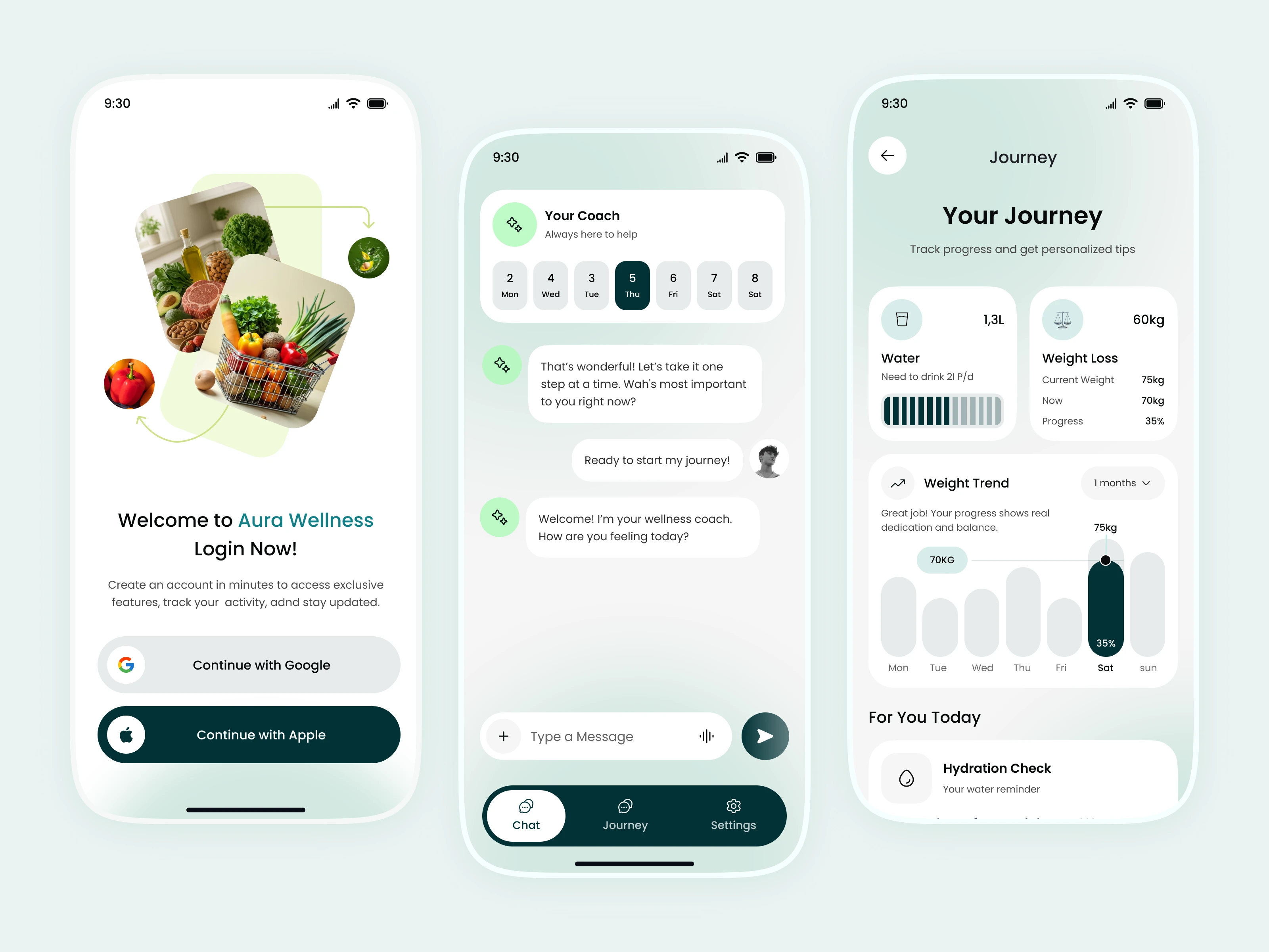The app combines a friendly AI wellness coach, habit and hydration tracking, and a clear journey-based dashboard that keeps users motivated without feeling overwhelmed. From onboarding to daily check-ins, every screen is crafted to feel calm, supportive, and intuitive.