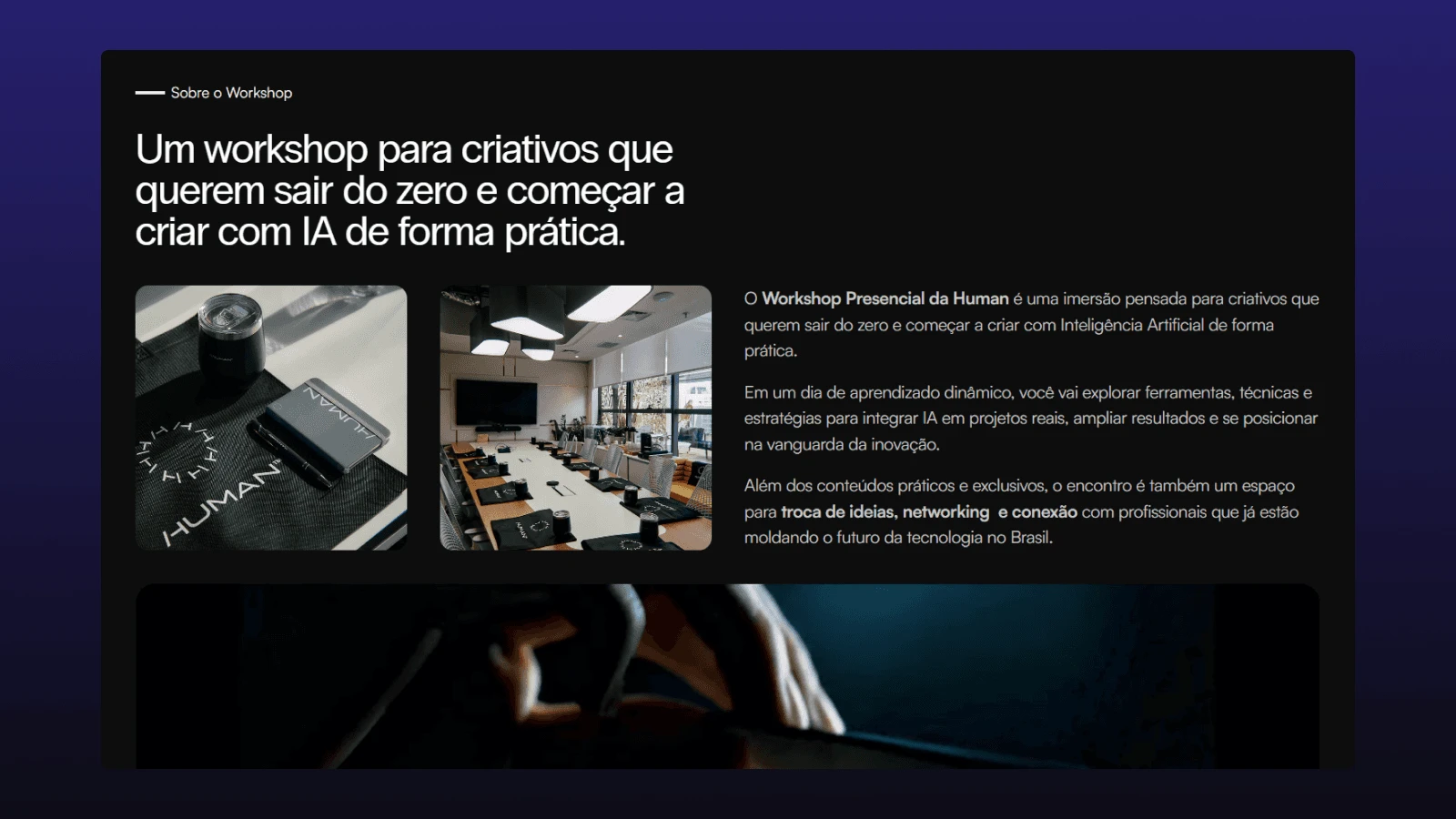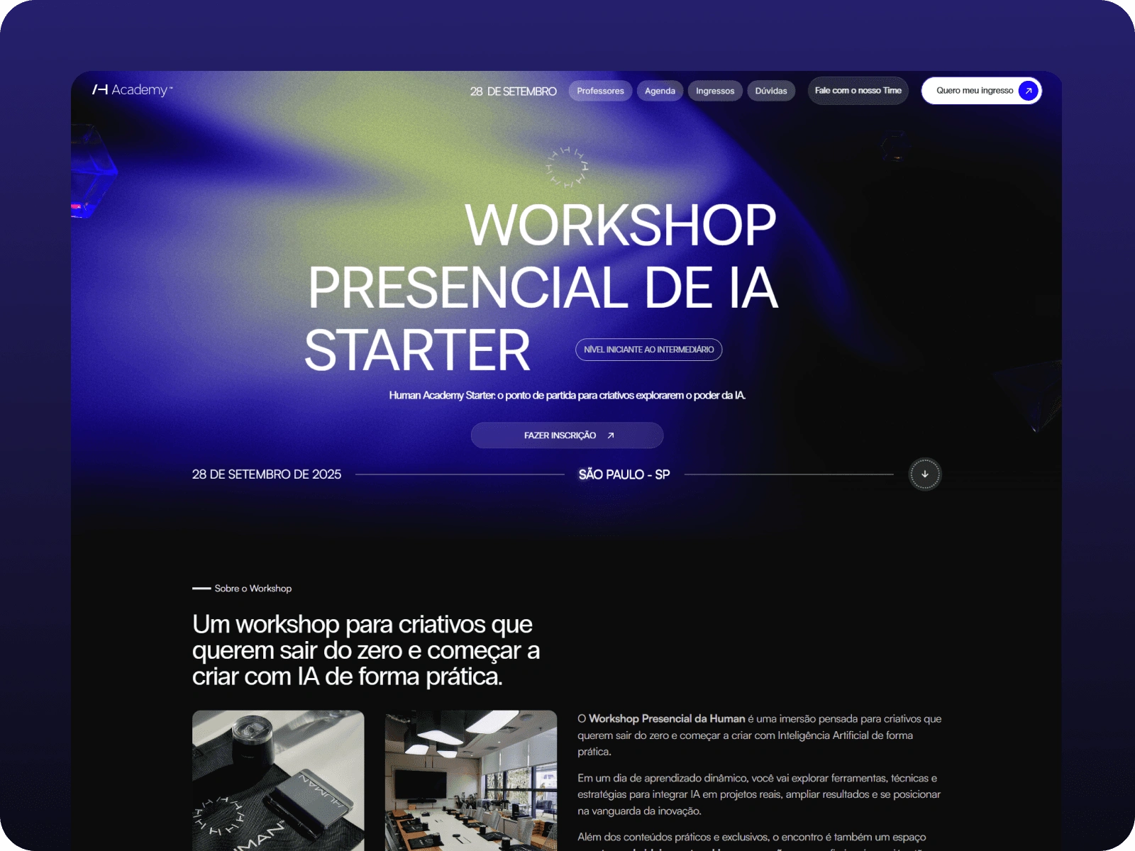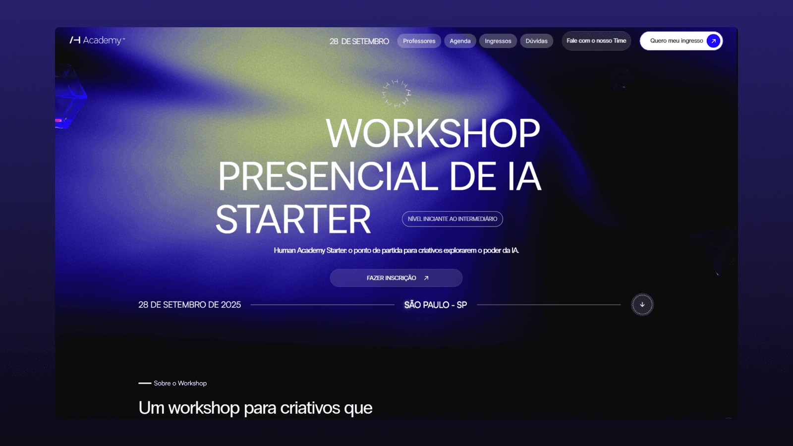 Para um evento sobre o futuro da tecnologia, era preciso uma página com o mesmo nível de impacto. Em apenas 48 horas, o GG Studio criou uma landing page fora da curva — com layout responsivo, UX envolvente e storytelling visual que refletisse o valor do workshop. O resultado superou expectativas e se tornou um dos cases mais rápidos e eficazes do estúdio.
