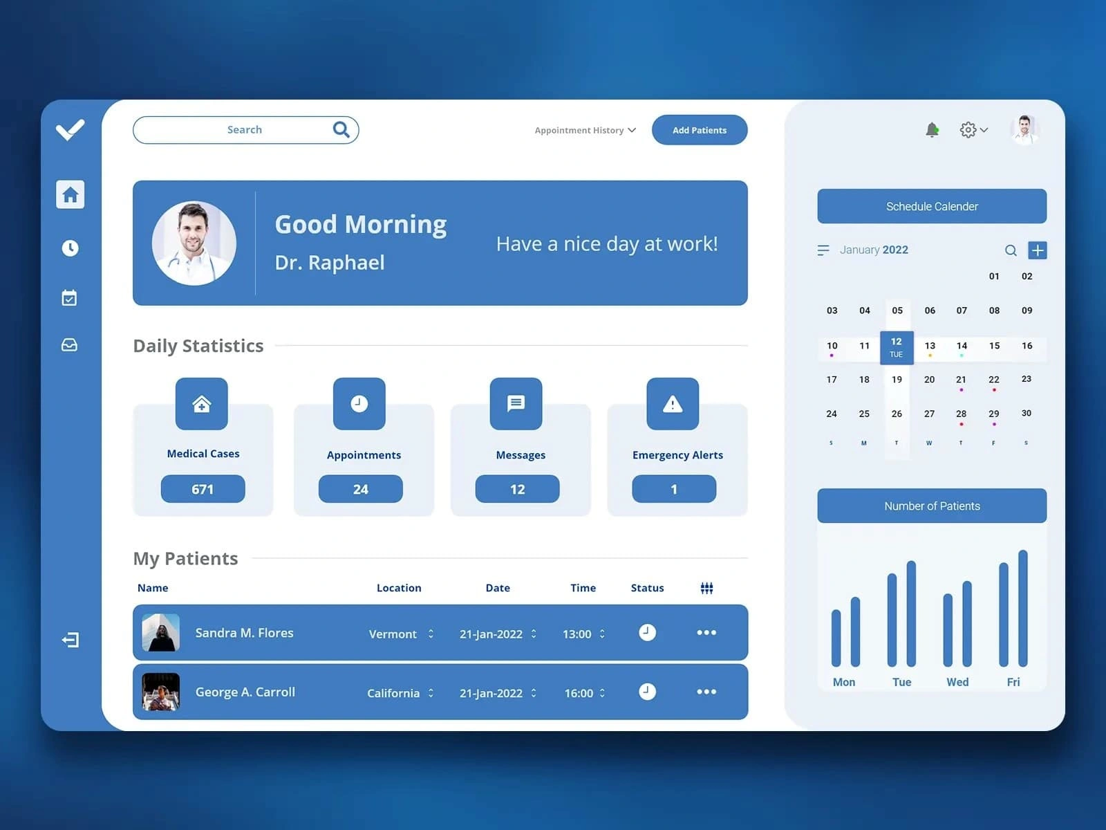 By focusing on clarity, personalization, and efficiency, this design aims to provide healthcare professionals with a streamlined and user-friendly platform for managing their daily tasks. The combination of vibrant visuals, intuitive navigation, and actionable data ensures a seamless and productive experience.