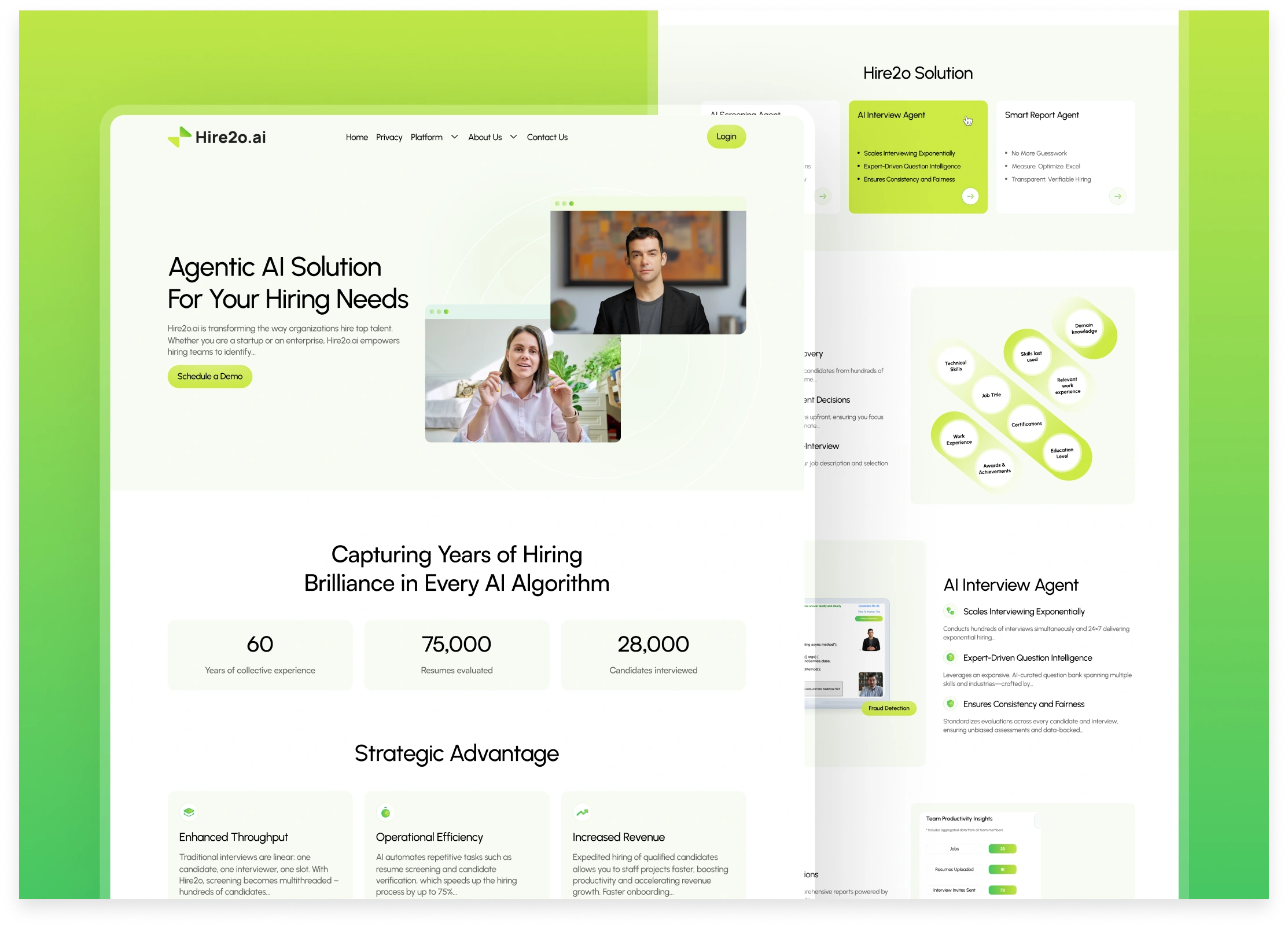 Hire20 is an agentic AI solution transforming how organizations hire top talent. Built on 60 years of collective hiring experience, 28,000+ candidates interviewed, and 75,000+ resumes evaluated, the platform automates screening, conducts AI-powered interviews at scale, and generates intelligent reports. Whether for startups or enterprises, empowers hiring teams to identify the right candidates faster—reducing time-to-hire by up to 75%.