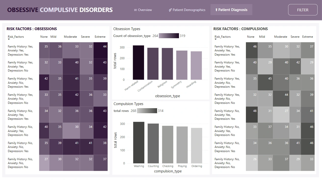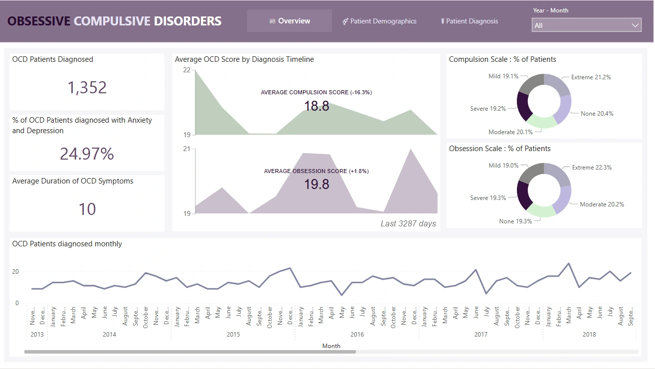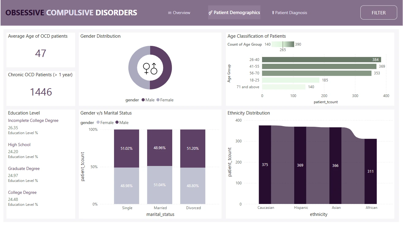 This project analyzes the "OCD Patient Dataset: Demographics & Clinical Data" to uncover patterns among 1500 individuals diagnosed with OCD. It focuses on demographic details like age, gender, and education, alongside clinical and risk factors such as symptom severity (Y-BOCS/Yale Brown Obsessive-Compulsive Scale scores), co-occurring conditions, and treatment methods. By exploring obsession and compulsion types, symptom duration, and the role of family history, the analysis provides insights into common risk factors and trends. The findings aim to better understand OCD's diverse presentations and support research and clinical efforts.