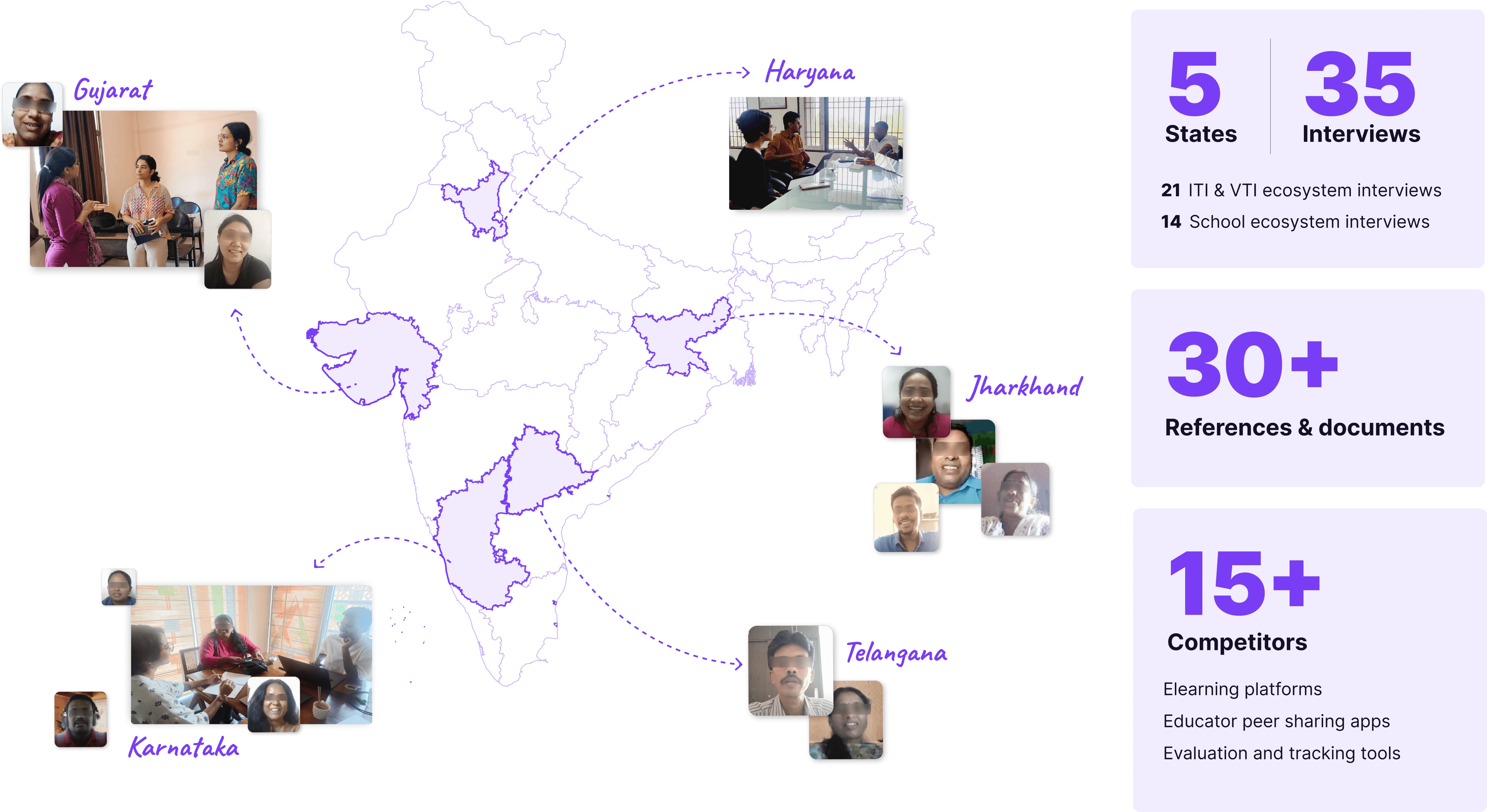 Through qualitative research across six states in India, we explored the public education ecosystem. The insights informed a co-creation workshop with Quest Alliance’s leadership to develop a focused product strategy and an MVP plan followed by design in Phase 2.