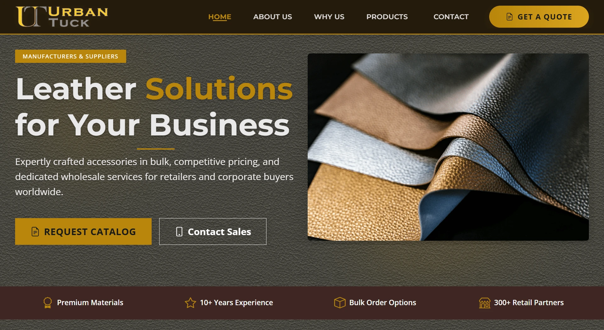 Built a sleek, dark-mode site for Urban Tuck—full-grain leather manufacturer—to drive wholesale leads and catalog requests. Hero & Trust Bar: Animated hero with dual CTAs; four credibility stats (materials, experience, bulk orders, partners). Products & Services: Responsive cards for belts, wallets, accessories; best-seller grid with tags and “View All” CTA. Lead-Gen Form: Quick-contact AJAX form with Turnstile captcha and SweetAlert2 feedback. Extras: Full SEO meta tags, sticky navbar, WhatsApp chat button, AOS scroll animations. Tech: HTML5 · CSS3 · JavaScript · Bootstrap 5 · jQuery · AOS.js.