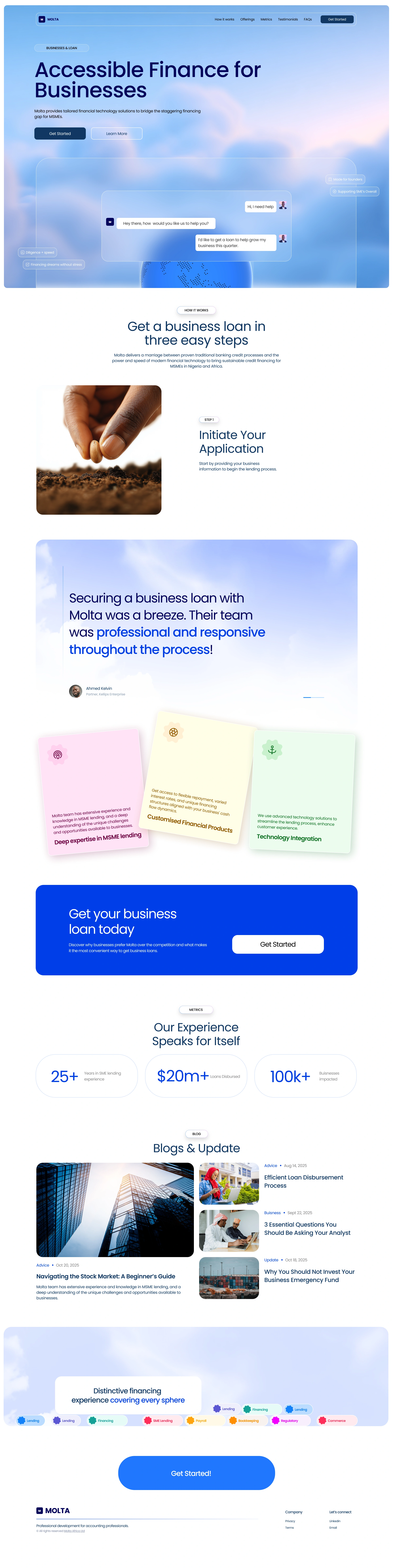 Molta is a financial technology platform designed to make business financing accessible and straightforward for small and medium enterprises (SMEs). The platform streamlines the loan application process, enabling businesses to secure funding quickly through a digital-first approach that emphasizes transparency and responsive customer support.