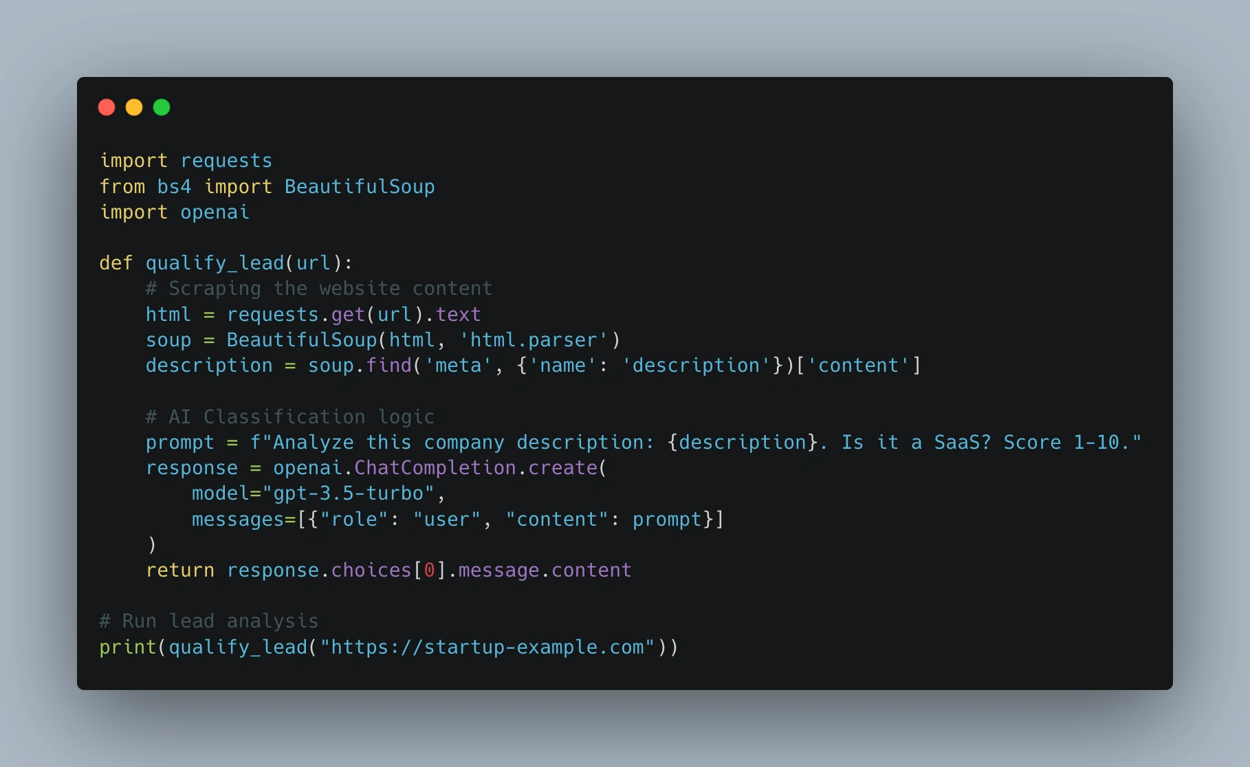 This project is a specialized script designed for sales teams. It automatically scrapes a list of company websites, analyzes their services and categorizes them