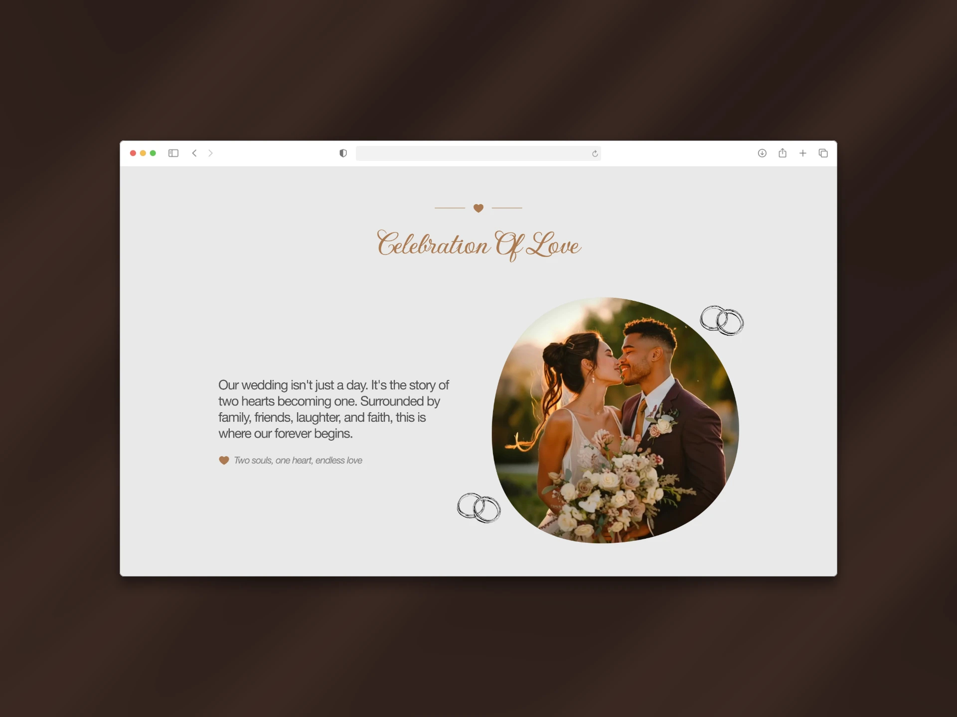 Dedicated sections highlight the couple’s journey using imagery, typography, and copy that create an emotional connection with visitors.