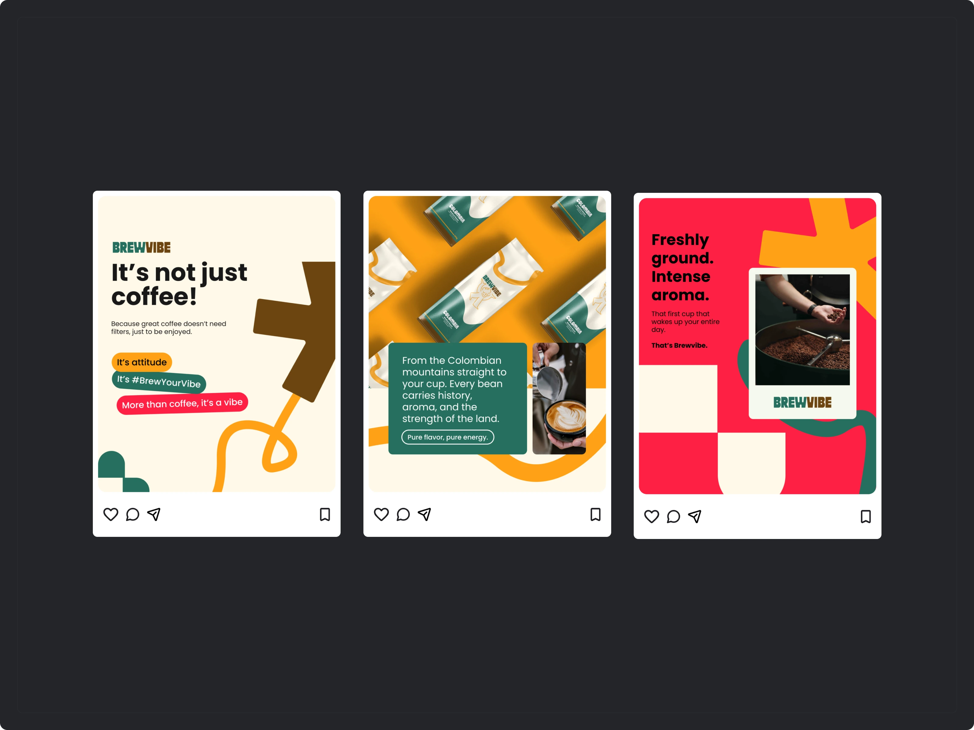BREWVIBE'S visual identity draws inspiration from the coffee fields of Colombia and the vibrant palette of its biodiversity. The earthy tones echo the richness of the mountains, while the brighter shades capture the spirit of tropical flora and wildlife. Together, these elements create a brand that feels fresh, authentic, and deeply connected to its origin, just like every cup of BREWVIBE coffee.
