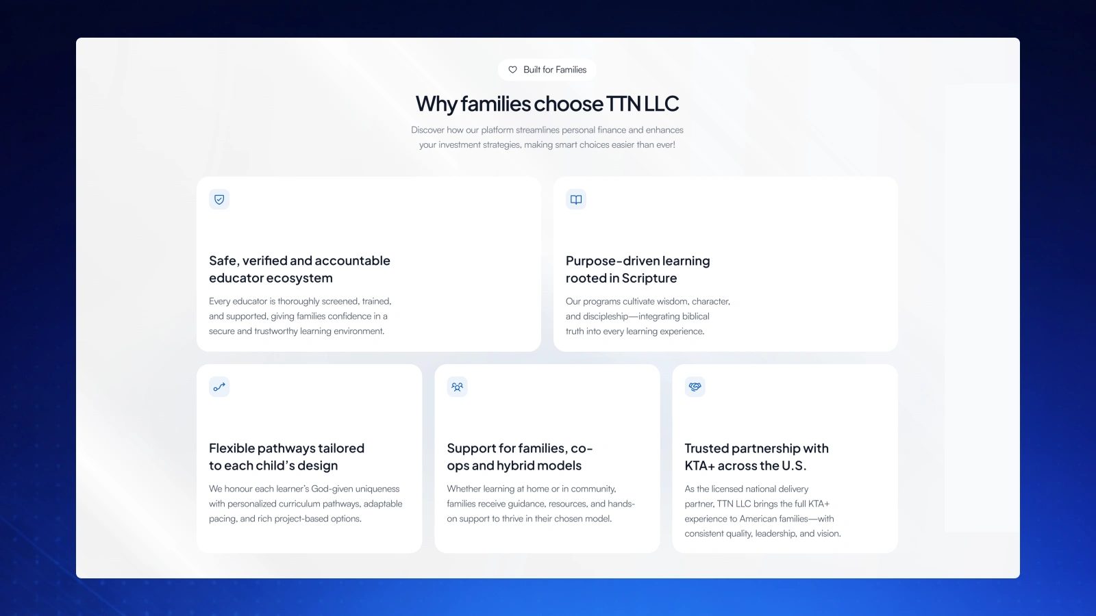 A focused hero combining a strong headline, concise supporting copy and curated animation that introduces TTN’s role in shaping the future of education — without overwhelming the user.