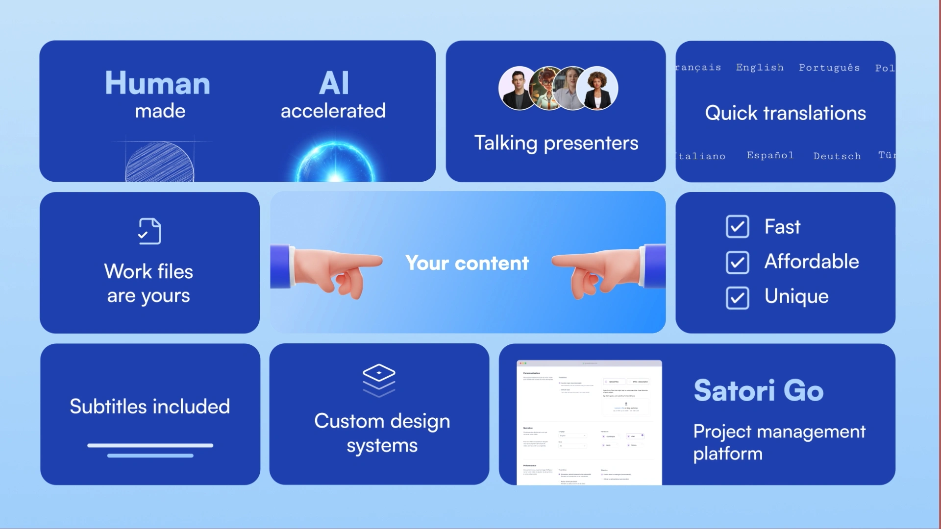 The solution of an AI-accelerated human-in-the-loop video production for faster and cheaper needs was developed in-house at Anymal and then spun-off on its own at satorivideo.com.