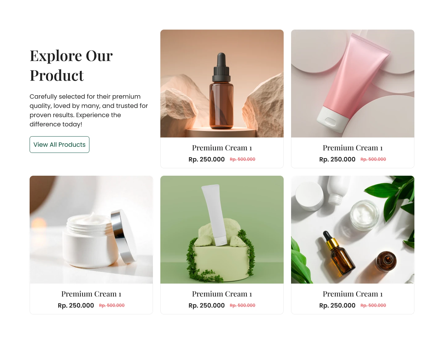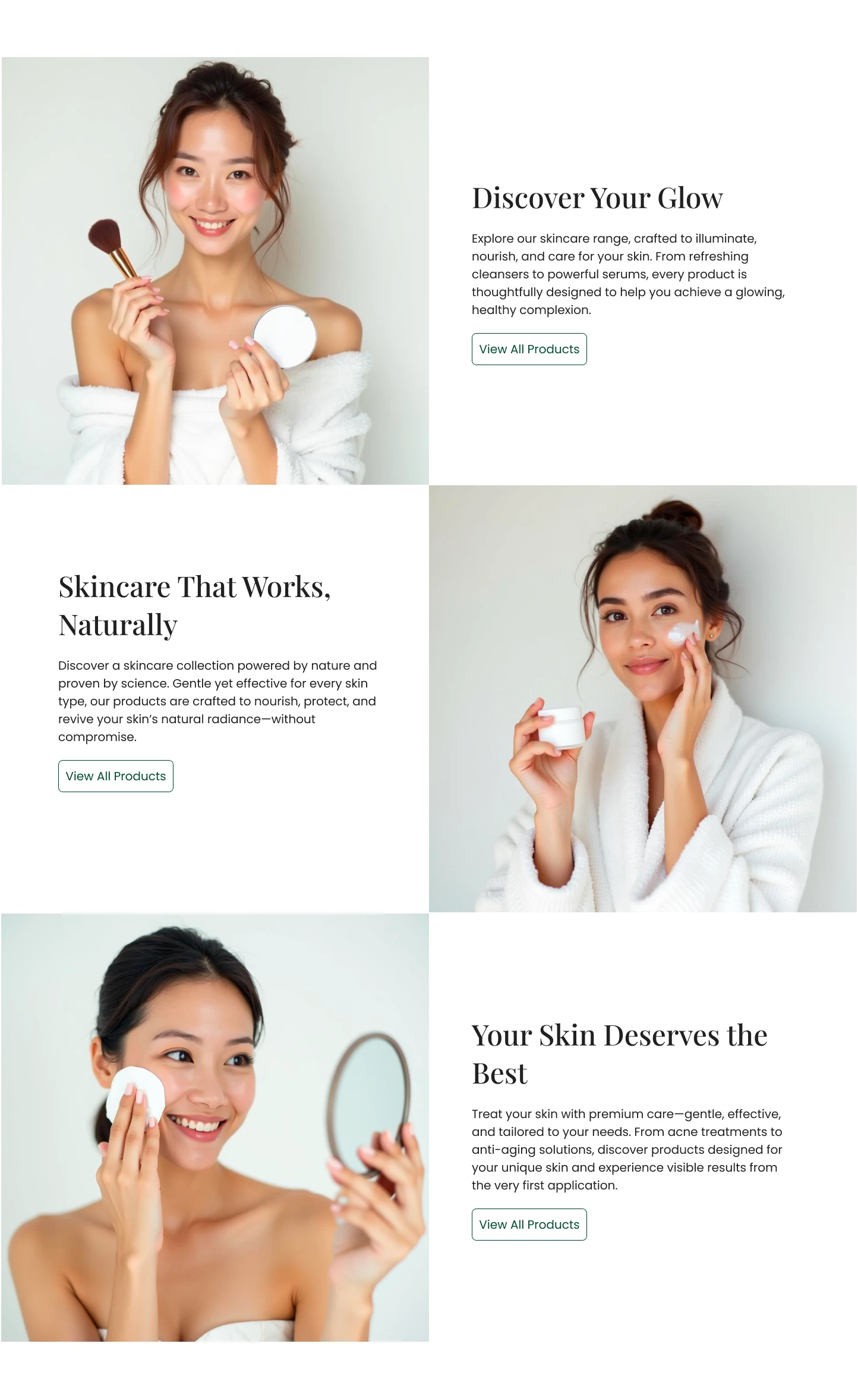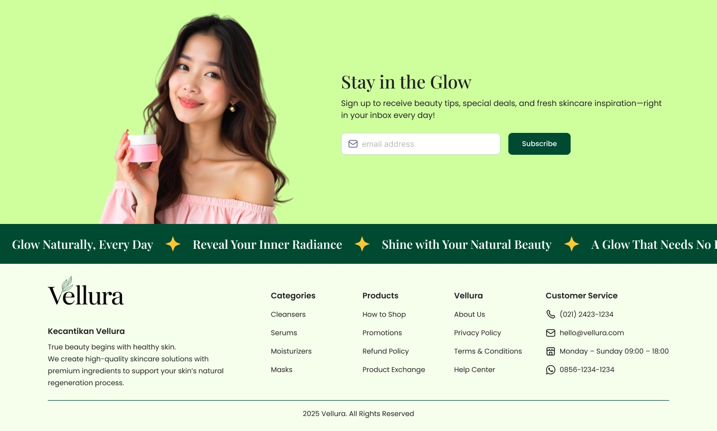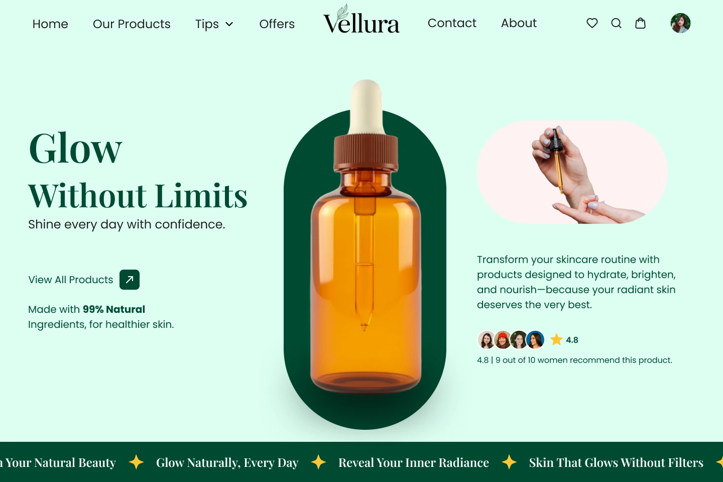The Vellura landing page was designed as the brand’s primary digital presence, highlighting its premium skincare line made with natural ingredients. With a clean, modern layout and soft pastel tones, the page delivers the core message “Glow Without Limits,” inspiring users to feel confident with healthy, radiant skin.