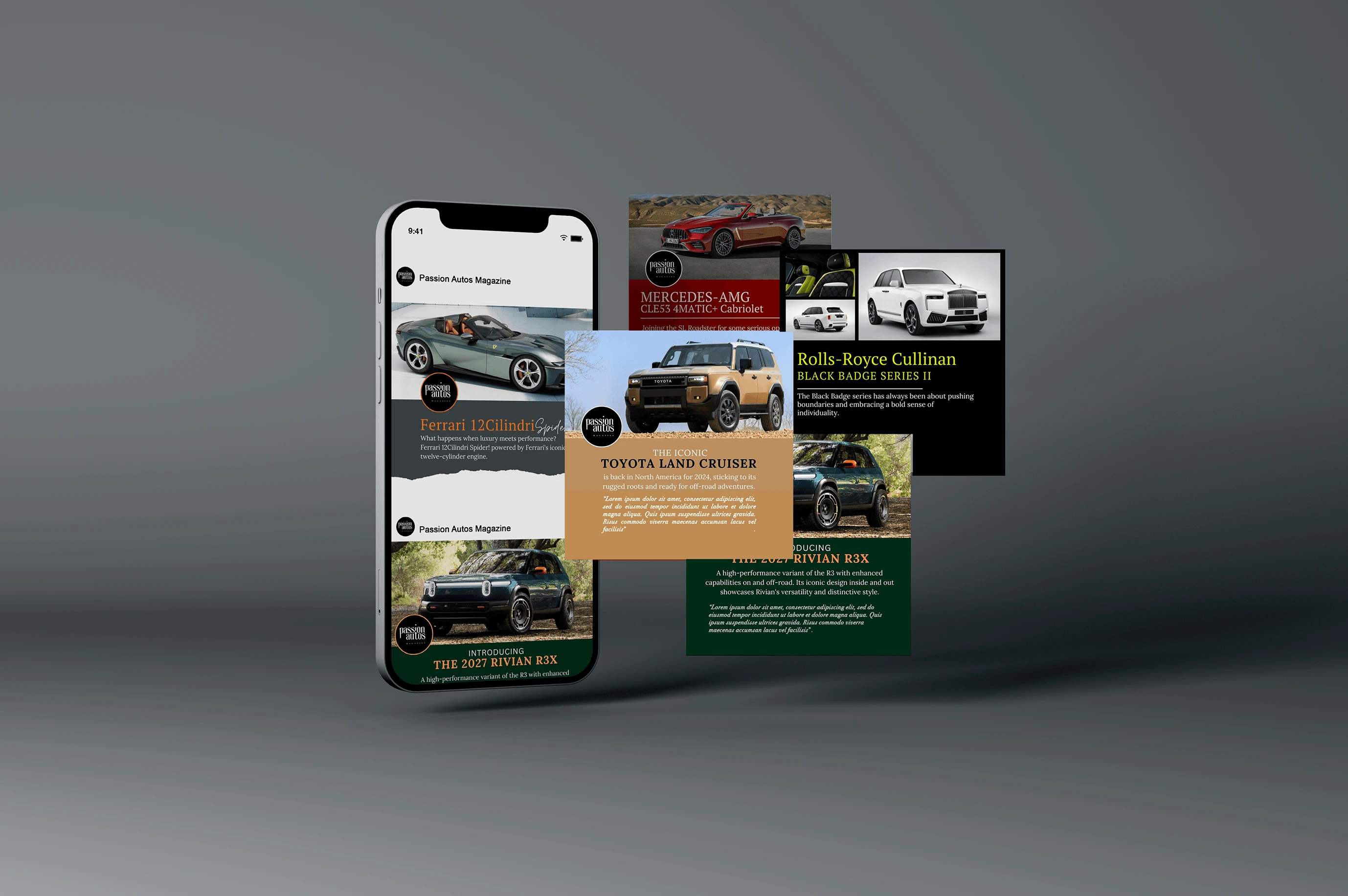 This collection of social media posts for Passion Autos Magazine uses an elegant, minimalistic design to showcase the luxury of high-end sports cars.