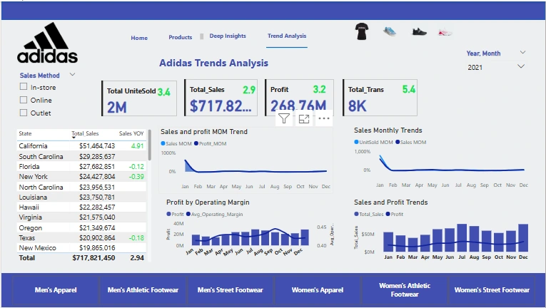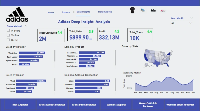 Adidas faced challenges in understanding granular sales performance across different states, retailers, sales channels, and product categories. Without a centralized dashboard, it was difficult to: