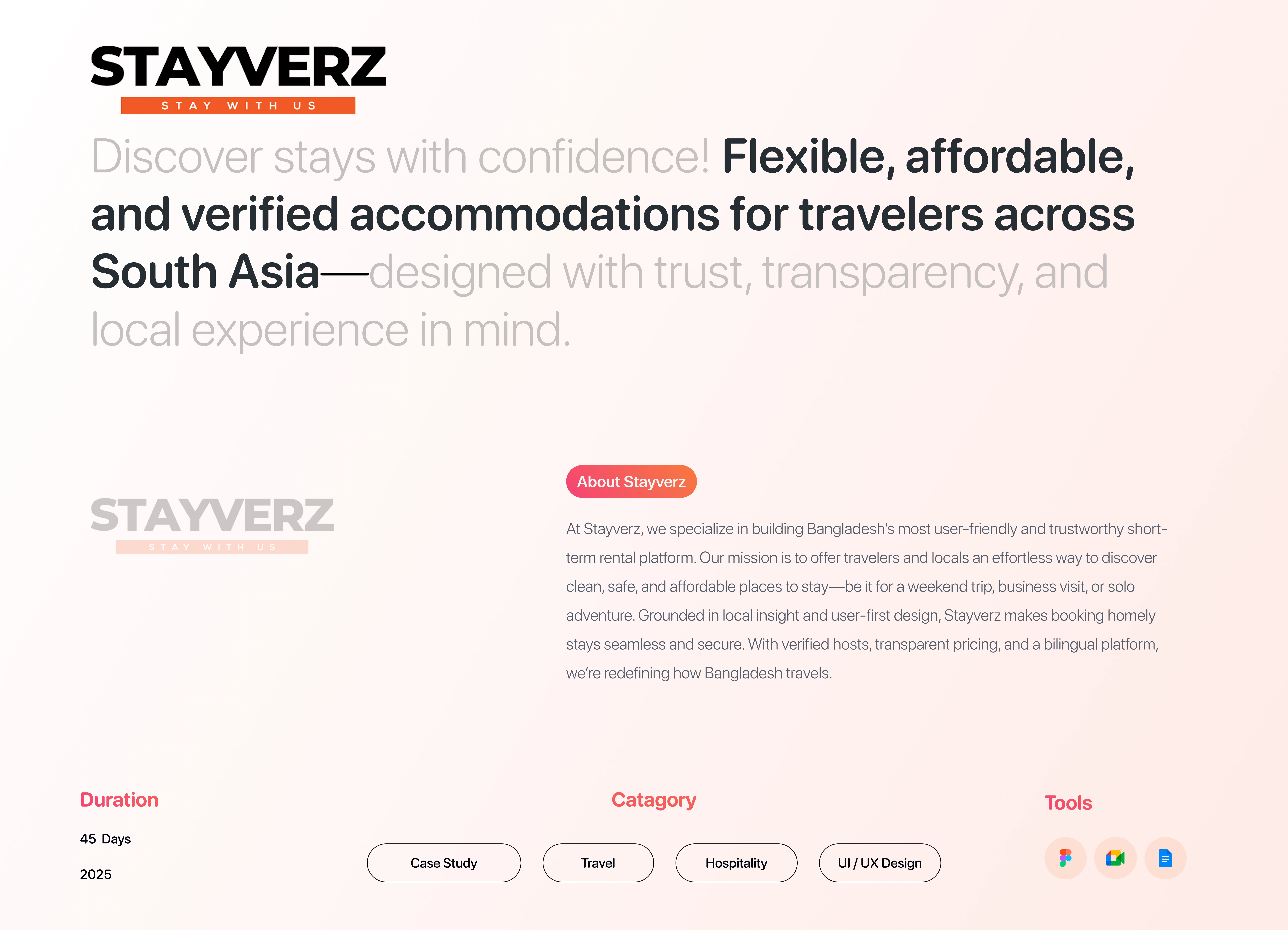 In this UX case study, our team shares the design process behind Stayverz, a short-term rental platform built from scratch to provide travelers in Bangladesh the “comforts of home, away from home.” Through comprehensive user research and persona development, we identified key challenges like navigation issues, unclear property information, and limited search functionality. Our collective focus was on creating a seamless user experience with intuitive design, effective features, and a streamlined booking flow. We also developed prototypes to visualize solutions and conducted user testing to refine usability. This case study demonstrates how a collaborative, user-centered design approach can result in a functional and engaging platform.