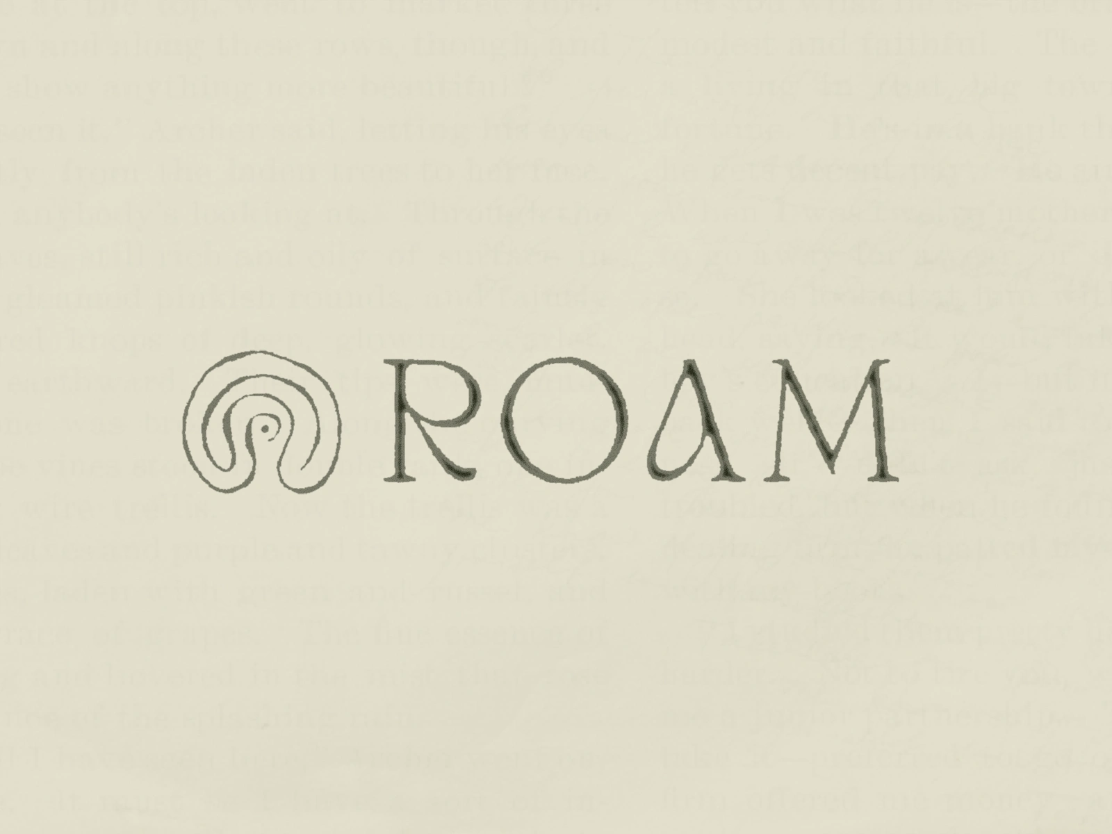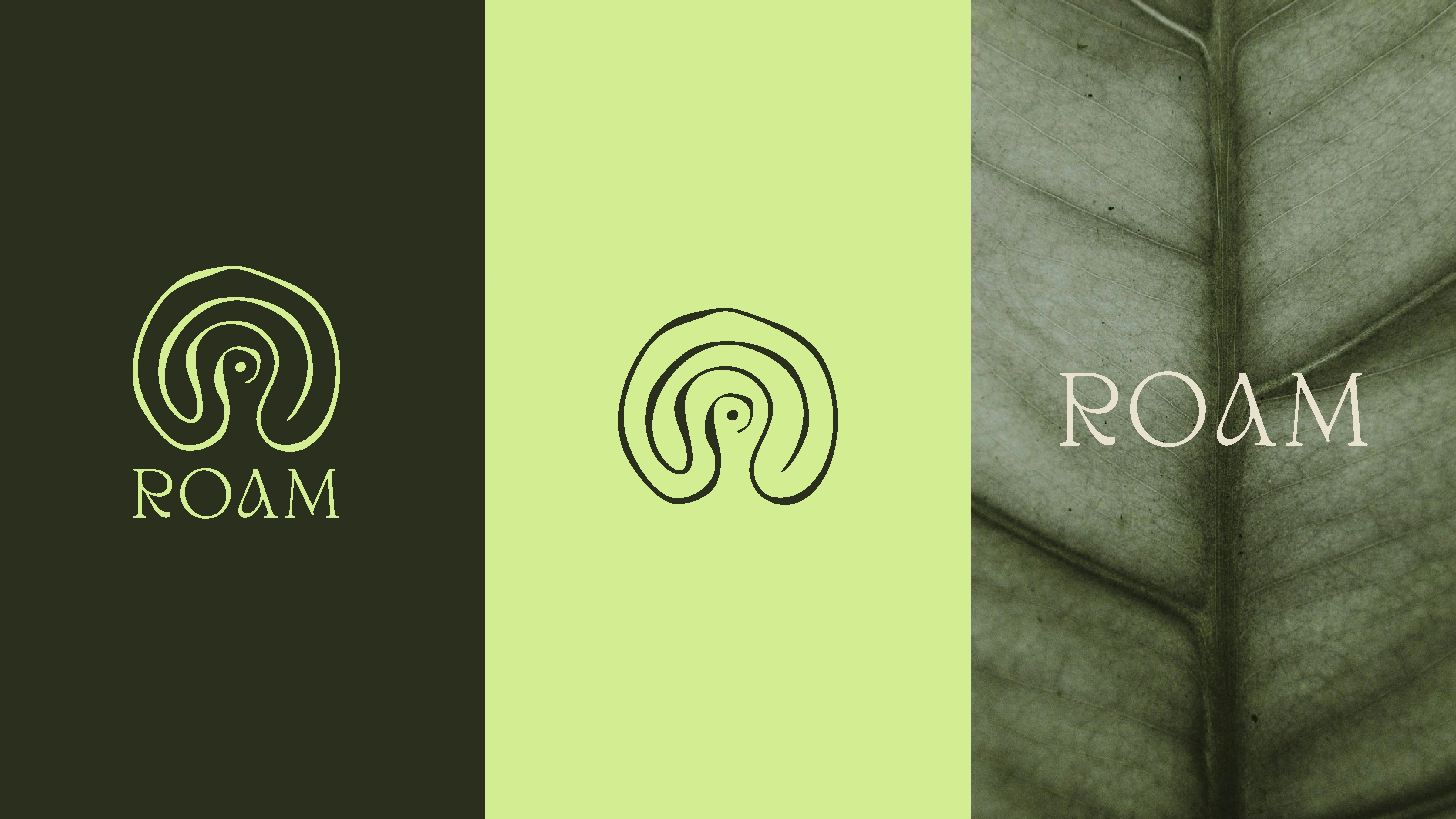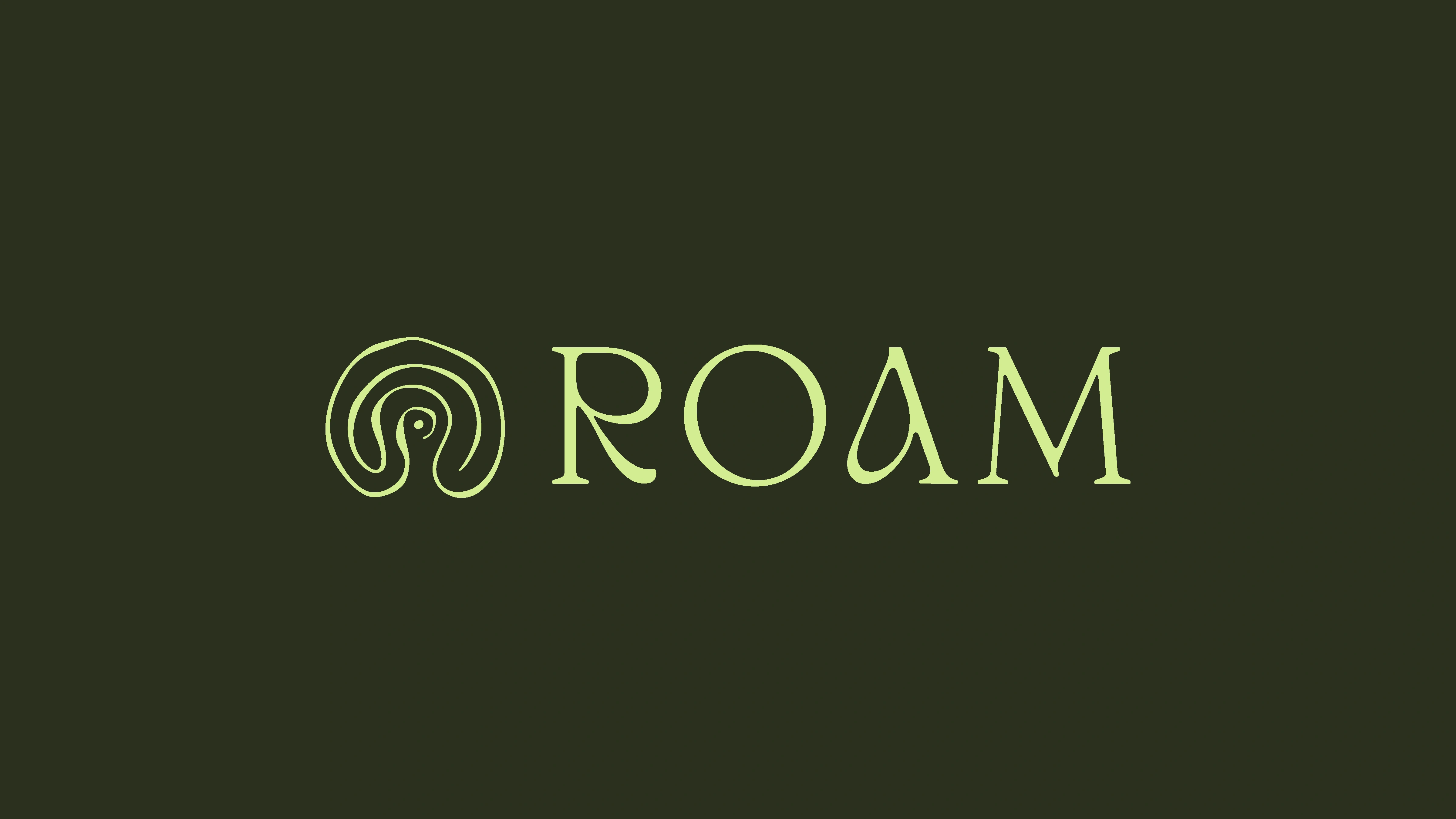 The ROAM icon is a hand-drawn, flowing form that symbolizes an outward journey, moving from the inner mind toward embodied awareness. It references the concentric rings of tree trunks, ripples in water, and other natural patterns, capturing the layered process of healing, growth, and connection. The icon stands confidently on its own or pairs seamlessly with the wordmark. The wordmark balances a grounded, classic design with soft, fluid details that reflect the harmony of structure and flow, which defines the ROAM experience.