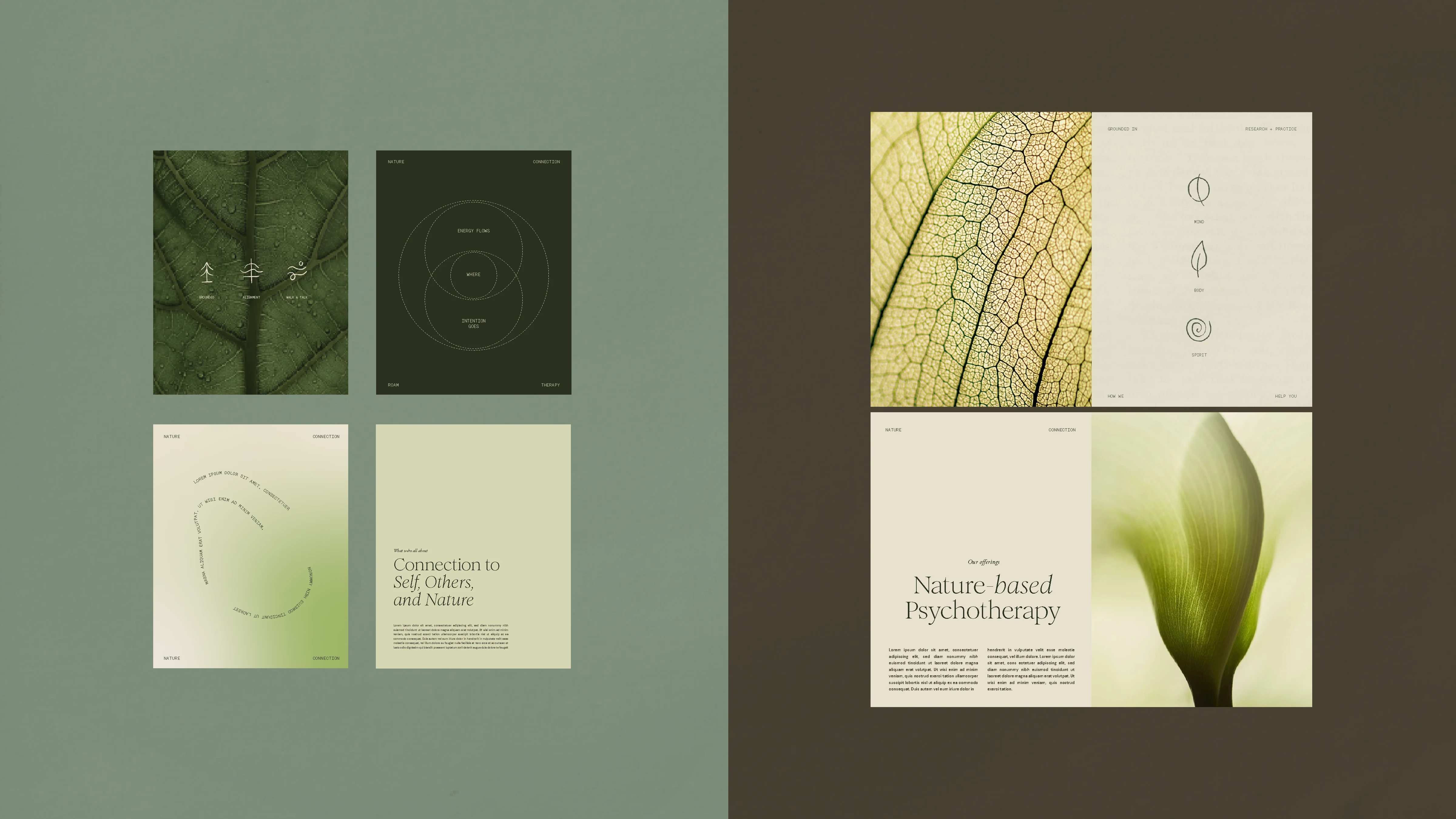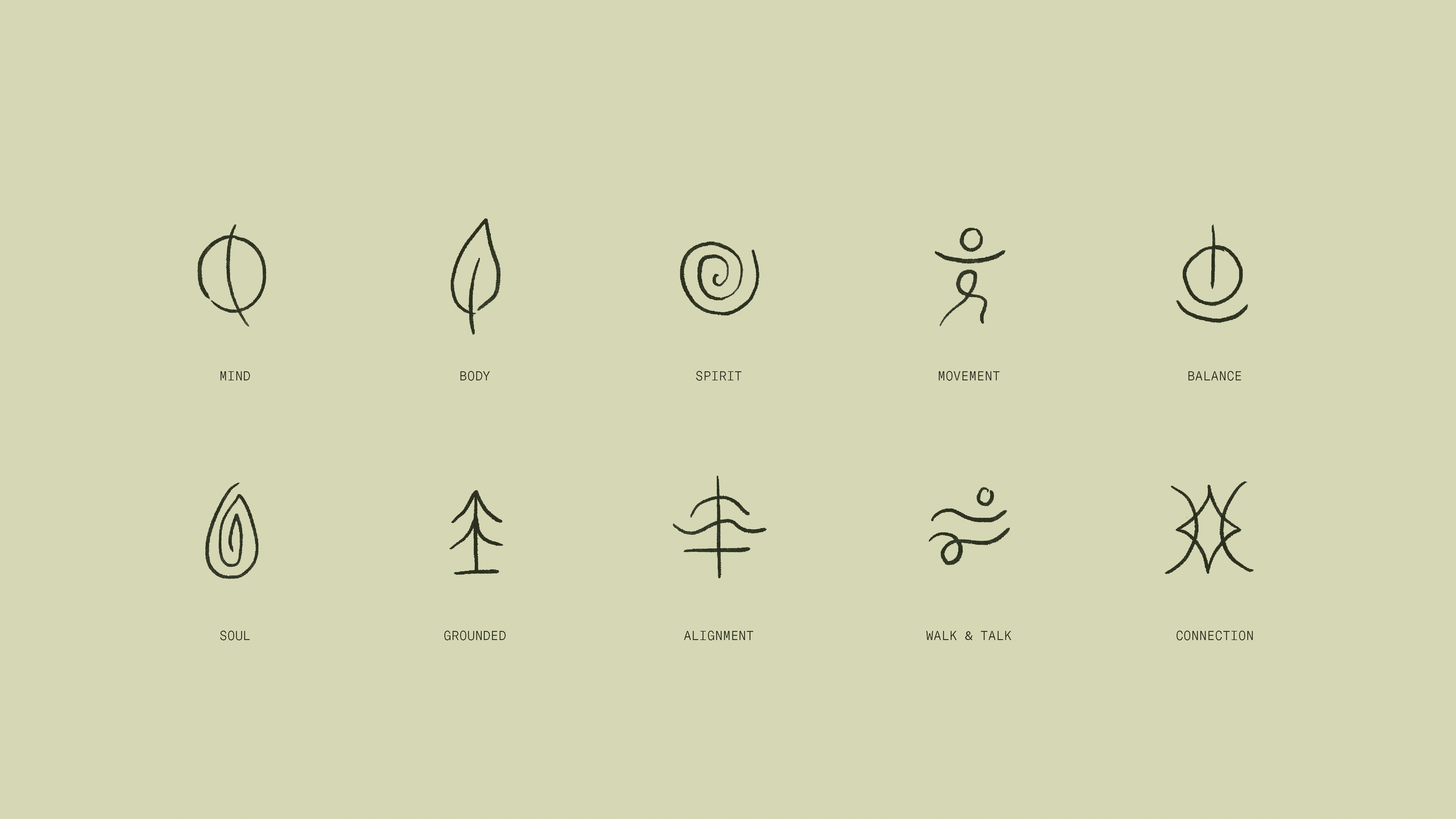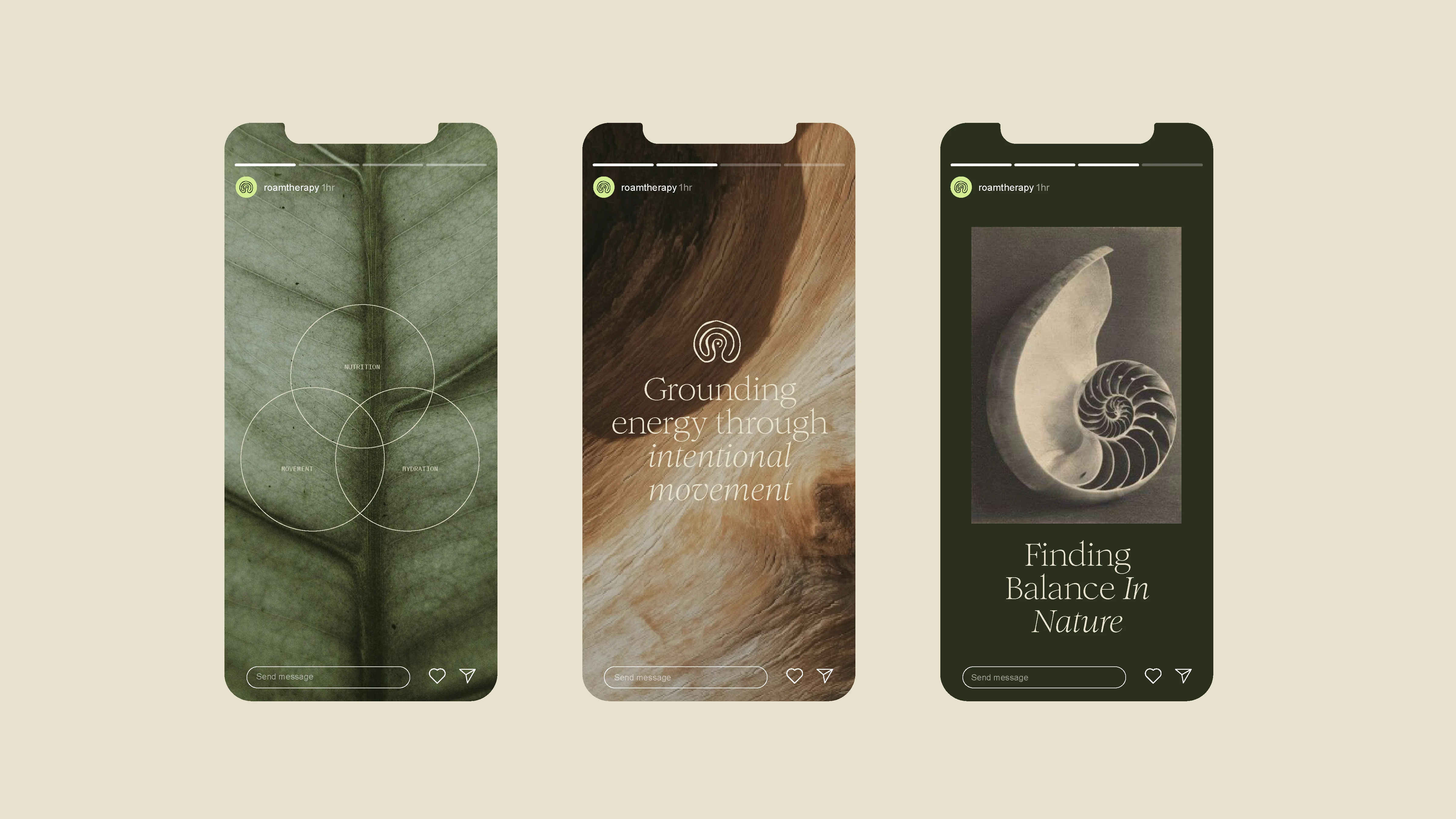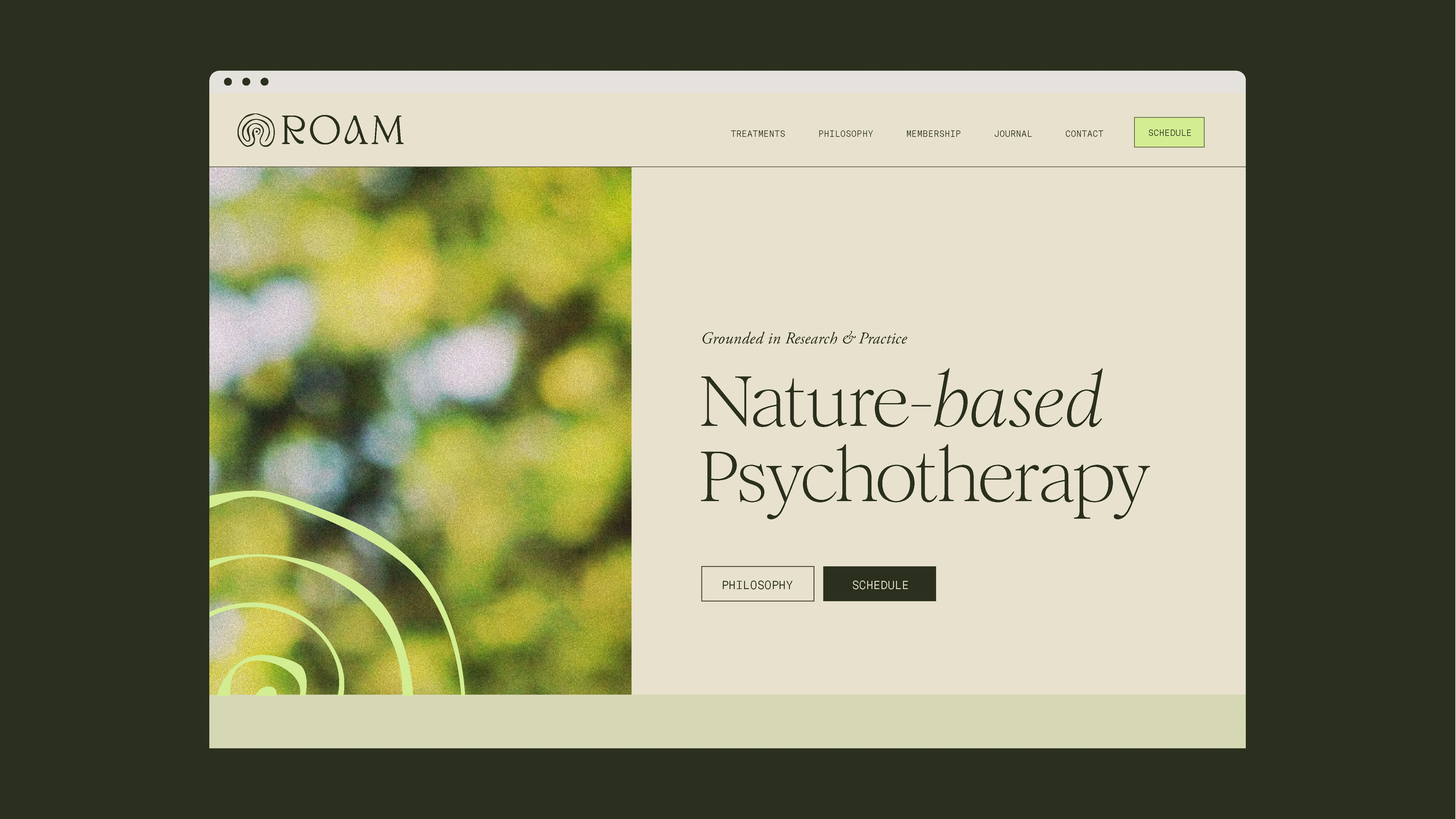 The ROAM icon is a hand-drawn, flowing form that symbolizes an outward journey, moving from the inner mind toward embodied awareness. It references the concentric rings of tree trunks, ripples in water, and other natural patterns, capturing the layered process of healing, growth, and connection. The icon stands confidently on its own or pairs seamlessly with the wordmark. The wordmark balances a grounded, classic design with soft, fluid details that reflect the harmony of structure and flow, which defines the ROAM experience.