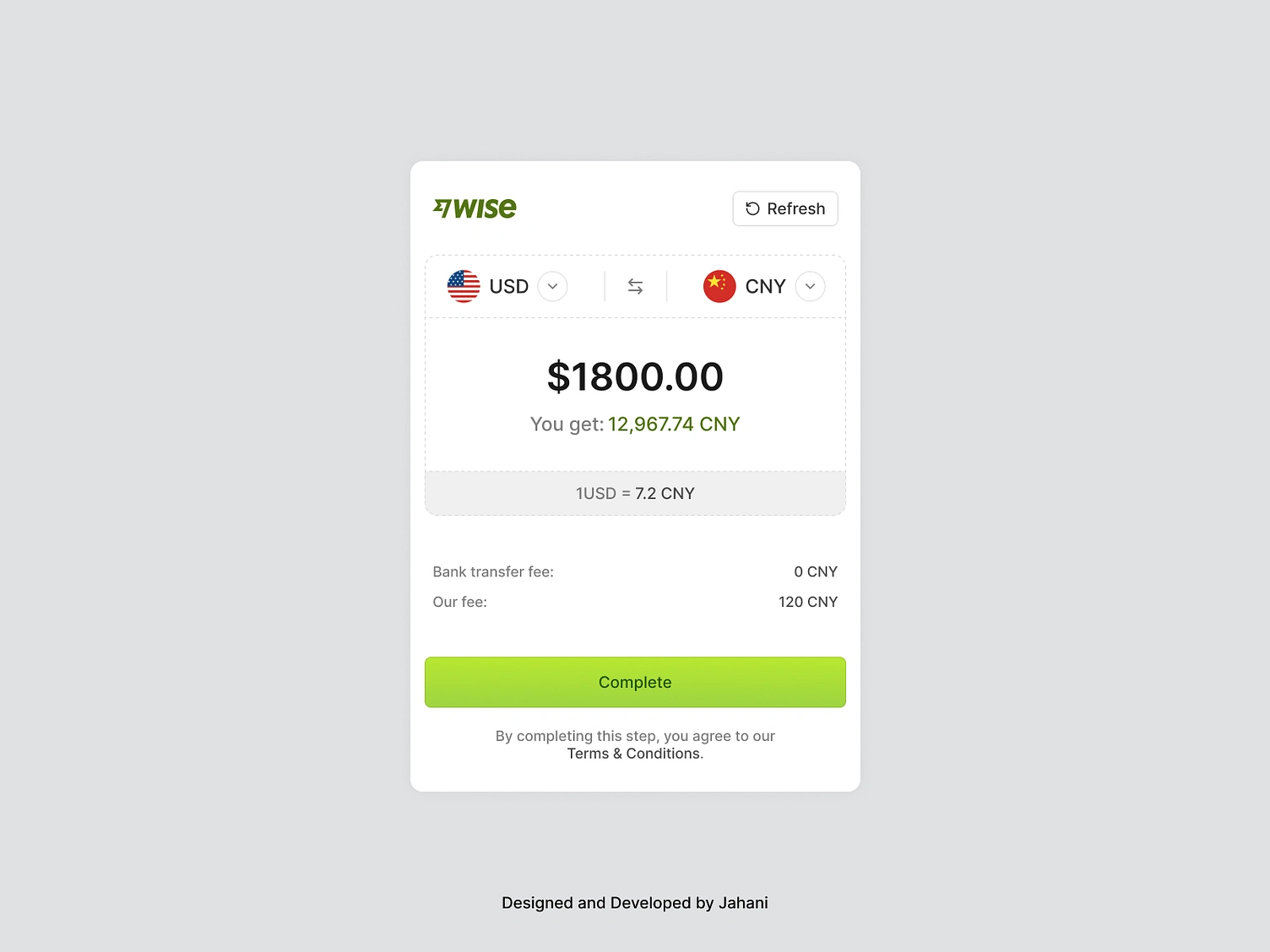 A minimal UI I designed and developed for a currency exchange flow – inspired by Wise's intuitive experience. Just enter the amount, see the real-time exchange rate (with no surprises), and hit Complete. Easy, clean, and user-friendly, with a sharp green CTA to seal the deal.