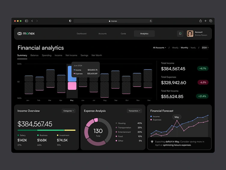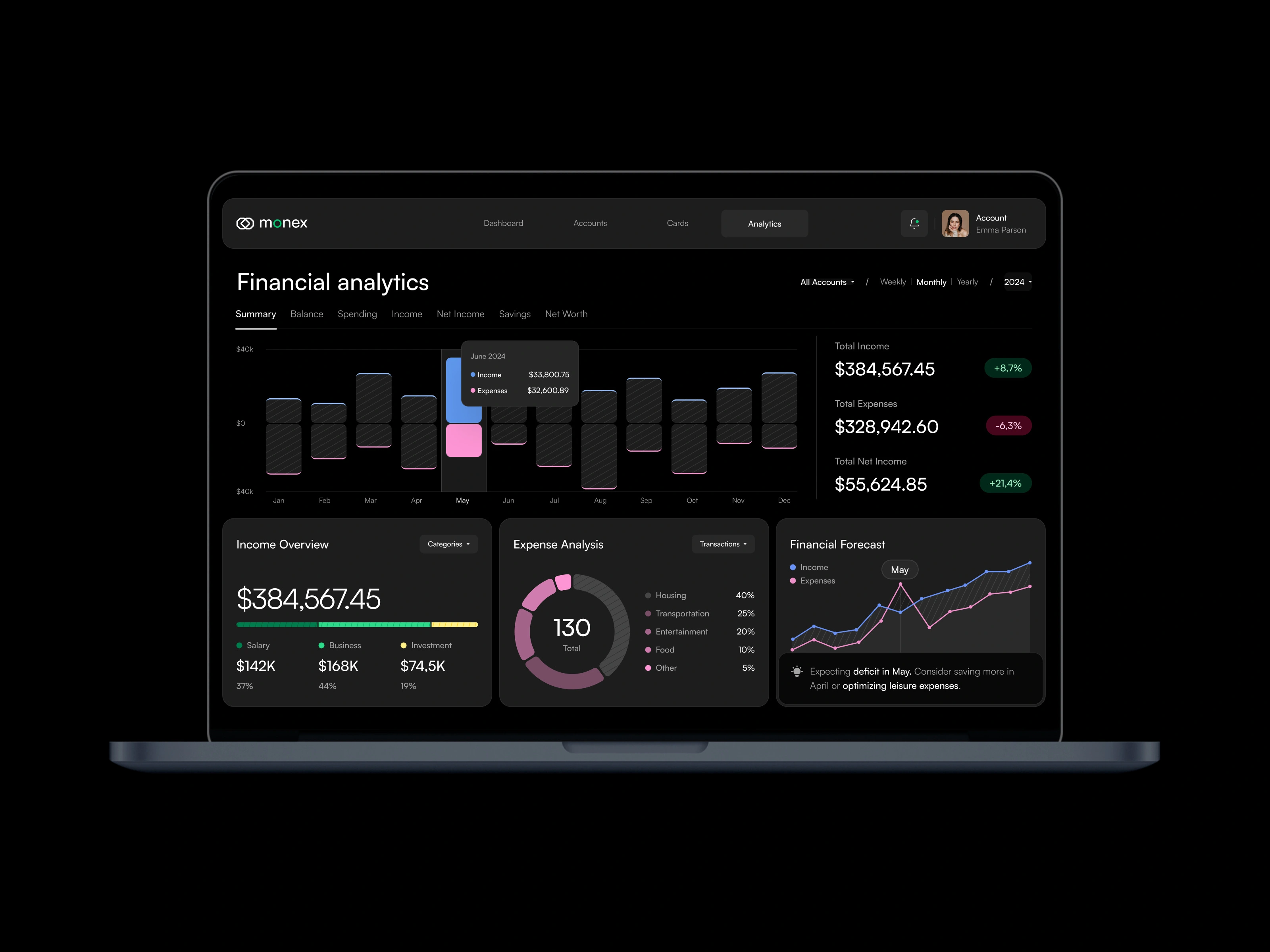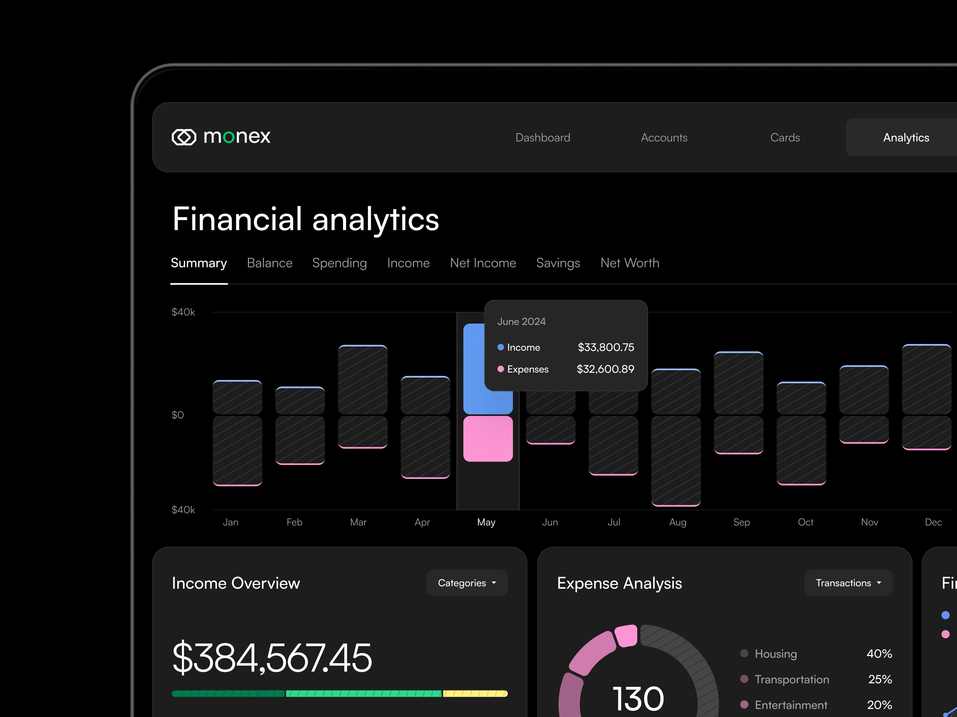 We designed Monex's Analytics page to transform raw financial data into clear, actionable insights. The layout balances structure and readability, ensuring users can effortlessly track income, expenses, and net earnings at a glance. A dynamic trend graph visually maps financial patterns over time, helping users make informed decisions.