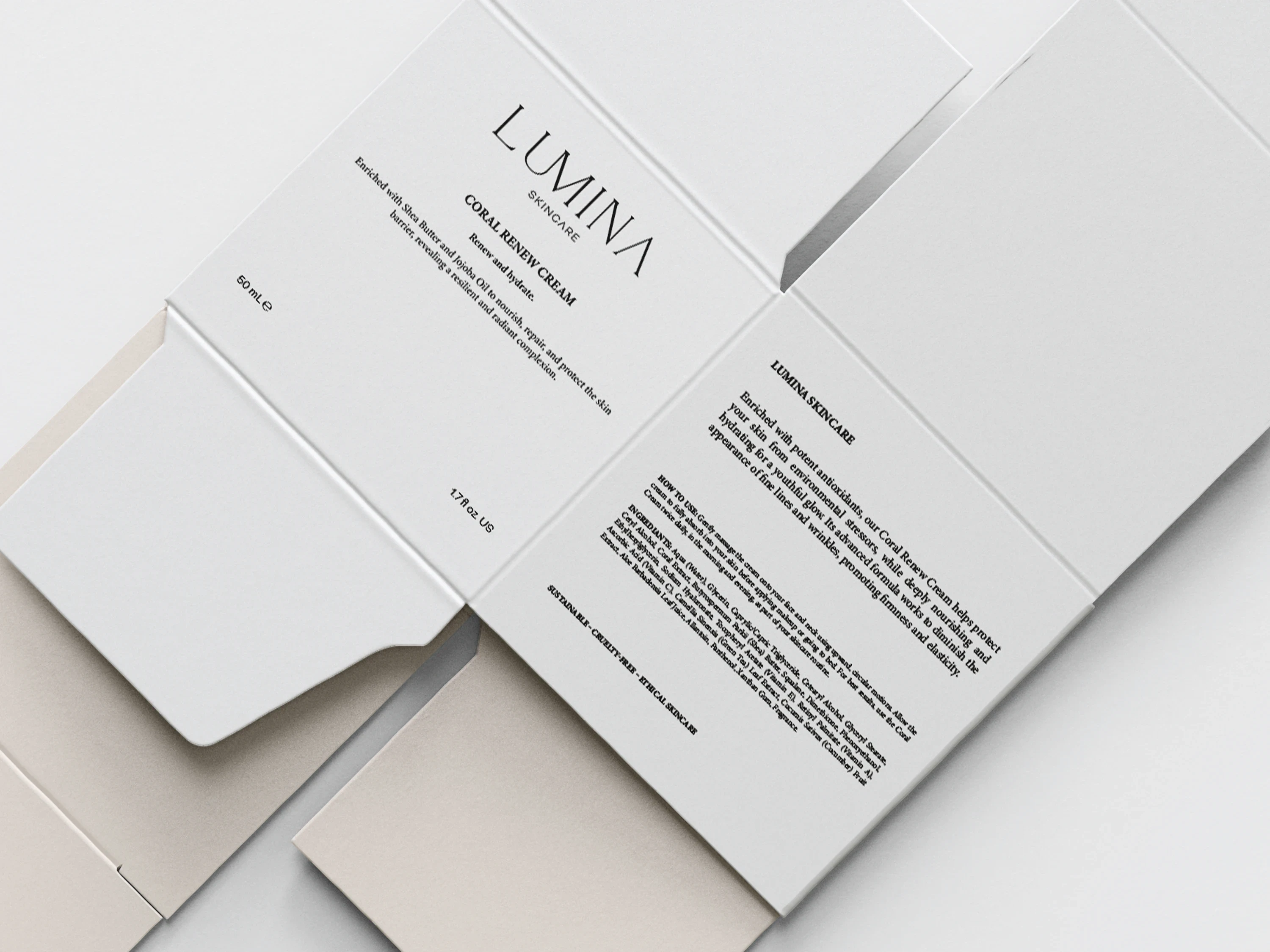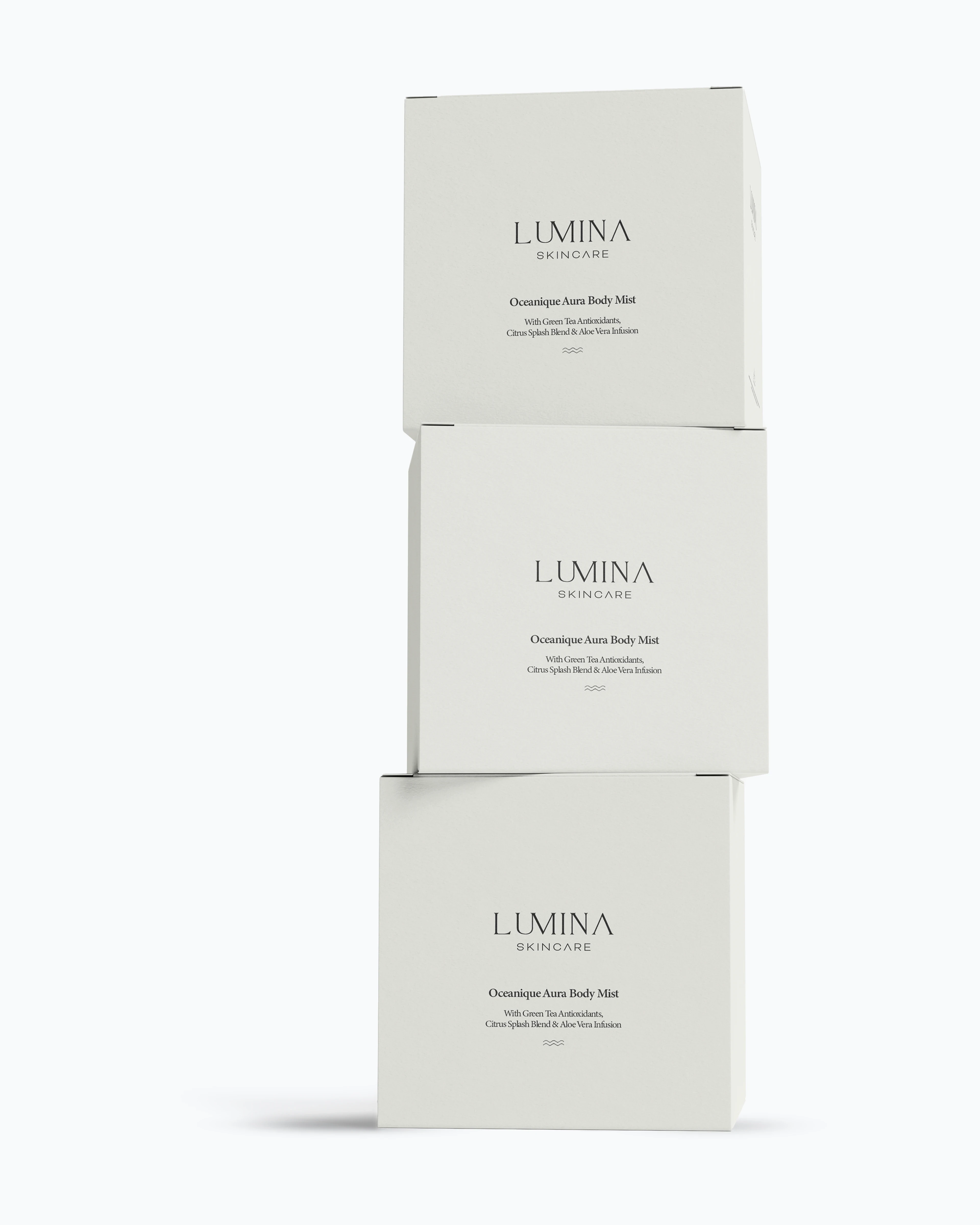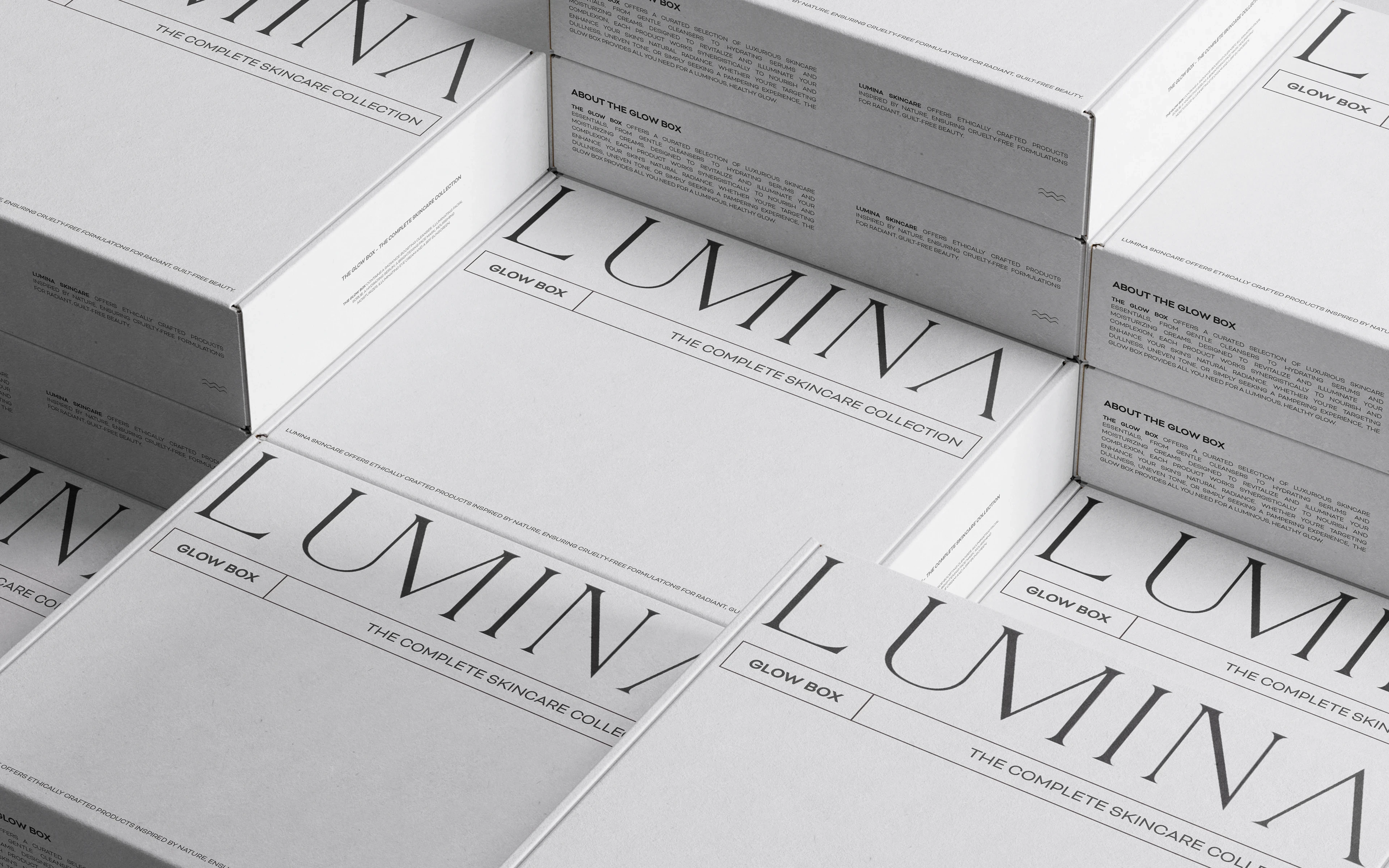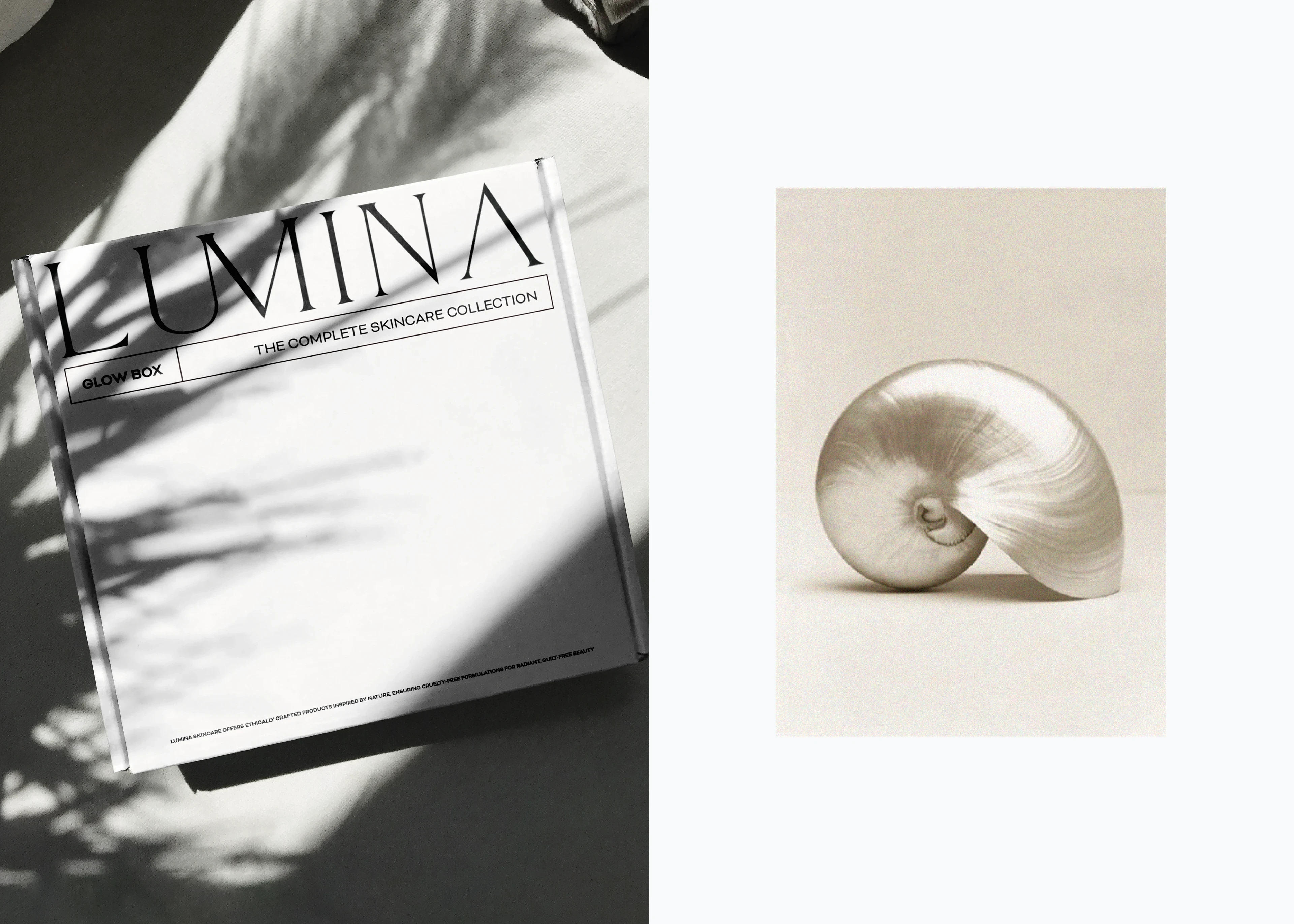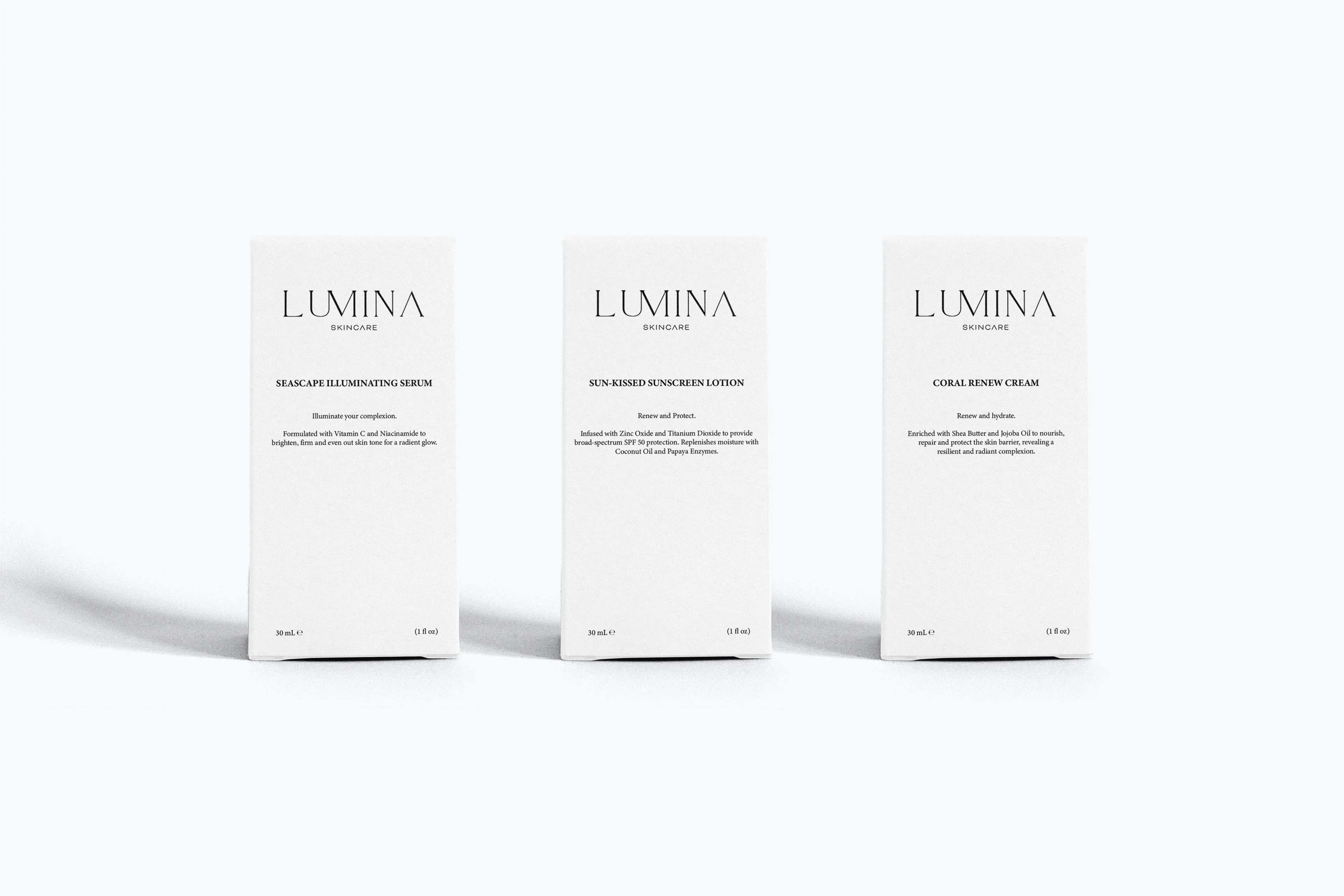 Skincare branding ID for "Lumina Skincare", a visionary brand commited to unveiling the luminosity within your skin, drawing inspiration from ocean and nature. Their mission is to redefine your skincare routine with a curated collection of high performance products that prioritize the radiant health and glow of the complexion.