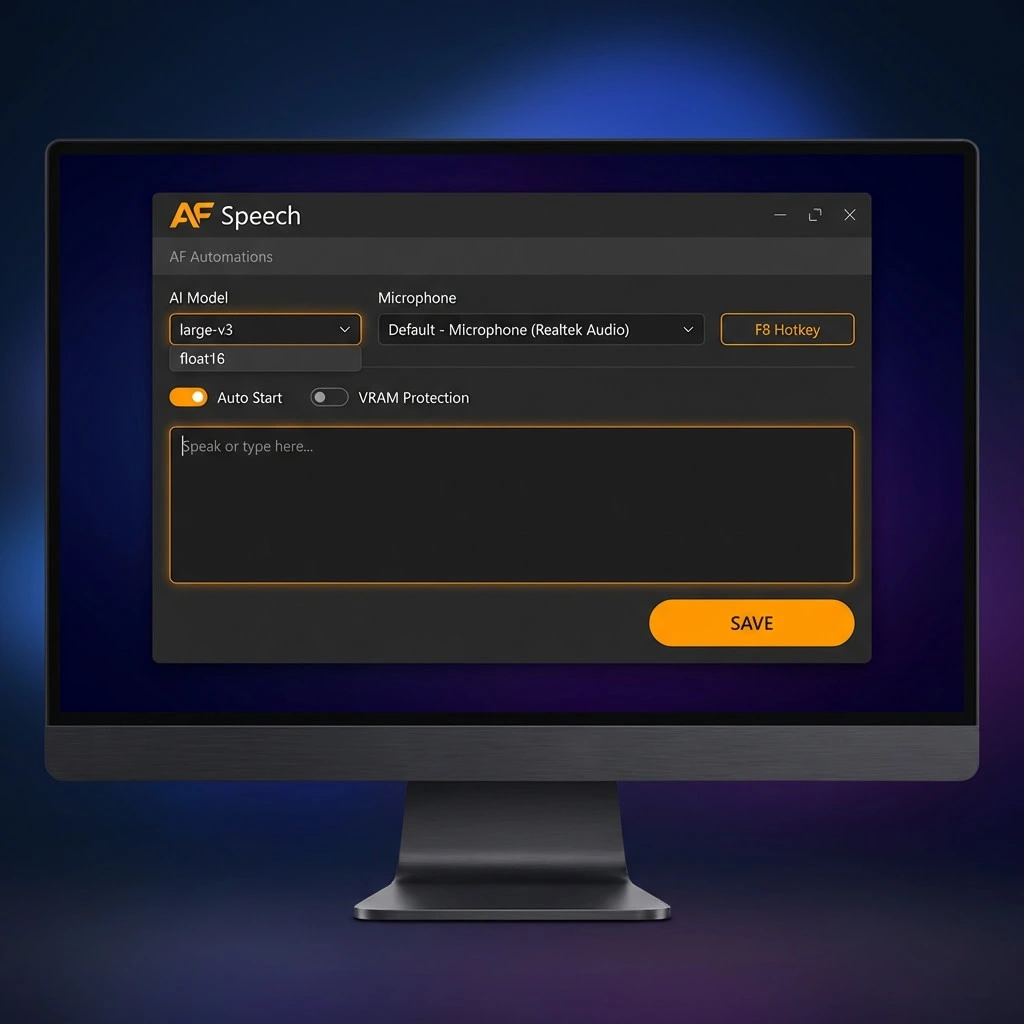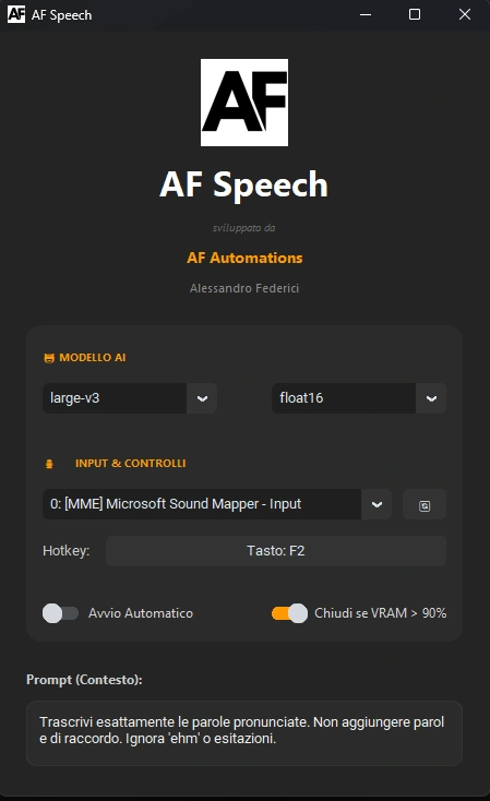 AF Speech is an intelligent dictation system that converts voice into text using advanced AI models executed entirely on the local machine.