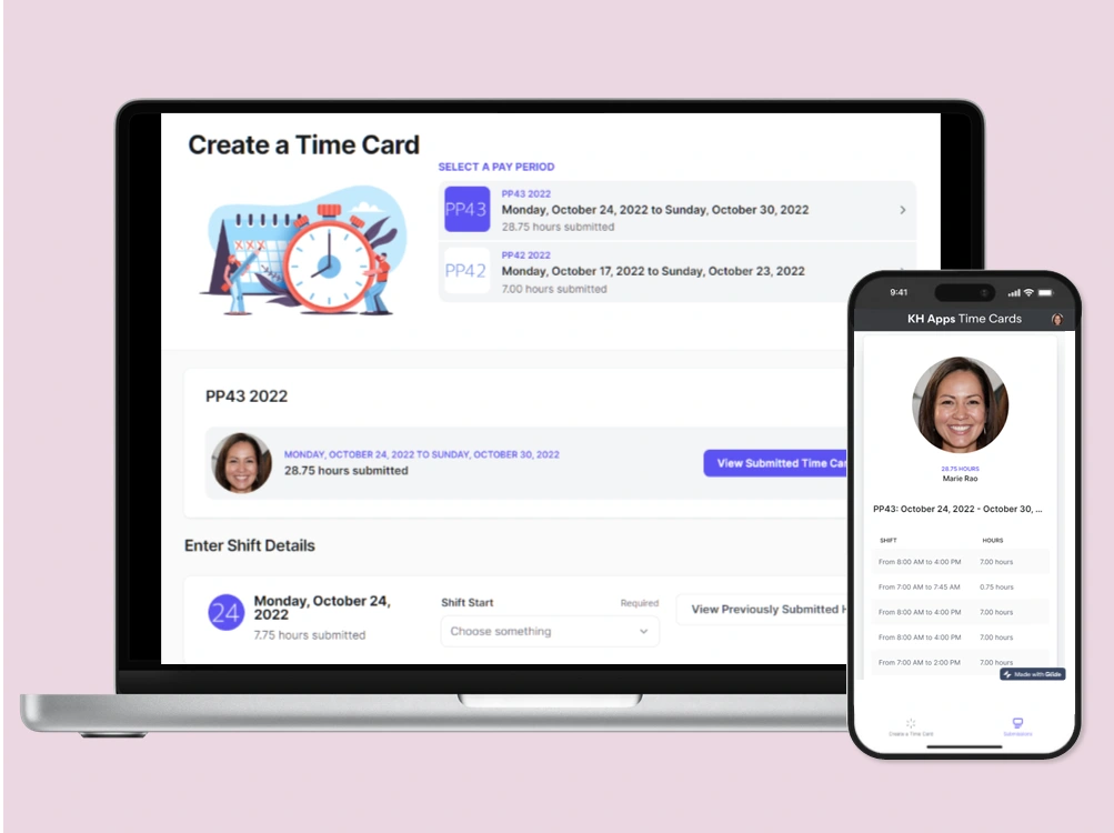 A user and an Admin interface where staff can submit time cards and Admin users can view and approve all the submissions.