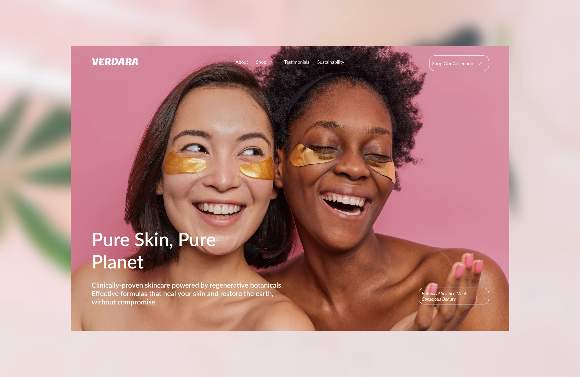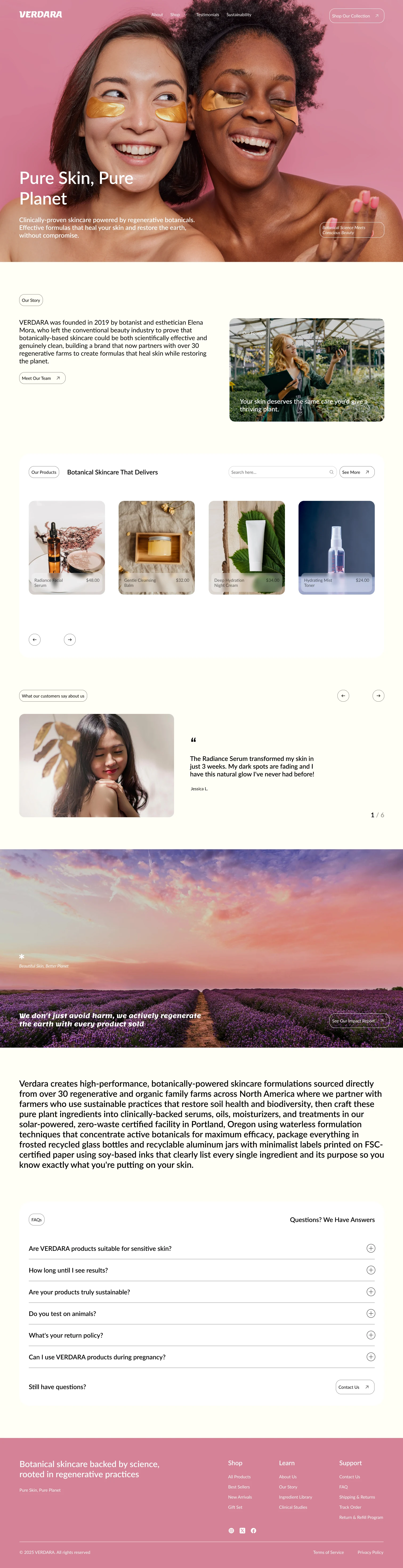 I designed VERDARA's complete landing page experience to convert conscious consumers while authentically showcasing their regenerative mission. The hero section features genuine diversity and real skin with bold typography over warm, approachable imagery that immediately communicates inclusivity and authenticity. I built a strategic visual flow starting with the founder story and farm partnerships to establish credibility, then moving into product showcases with clean photography on textured, earth-toned backgrounds that feel premium yet organic. The product presentation uses a card-based grid system that balances beautiful imagery with clear calls-to-action, making browsing effortless while reinforcing brand values. I designed a powerful testimonial section with authentic customer photography and impactful pull quotes that build social proof without feeling manufactured. The sustainability section uses a stunning lavender field hero image paired with bold messaging that turns environmental commitment into emotional connection, making visitors feel part of something bigger. I created an intuitive FAQ accordion system that addresses concerns transparently while maintaining visual breathing room. The design architecture guides users from emotional connection through education to conversion, with each section reinforcing trust through real photography, honest messaging, and strategic use of whitespace. My color choices balanced warmth with sophistication using dusty rose, sage green, and sunset gradients that feel natural without being cliché, while typography hierarchy ensures readability and premium positioning across all devices.