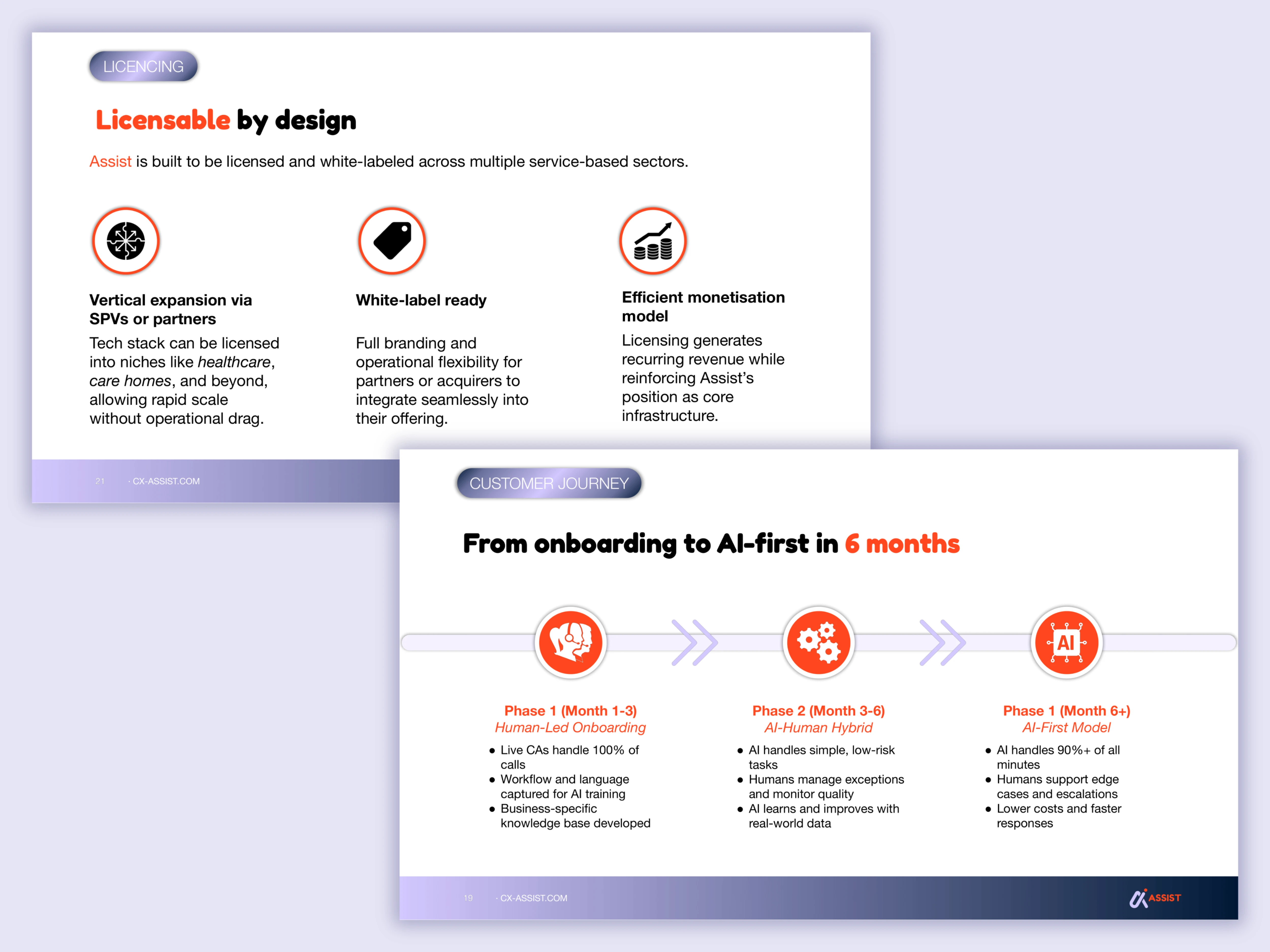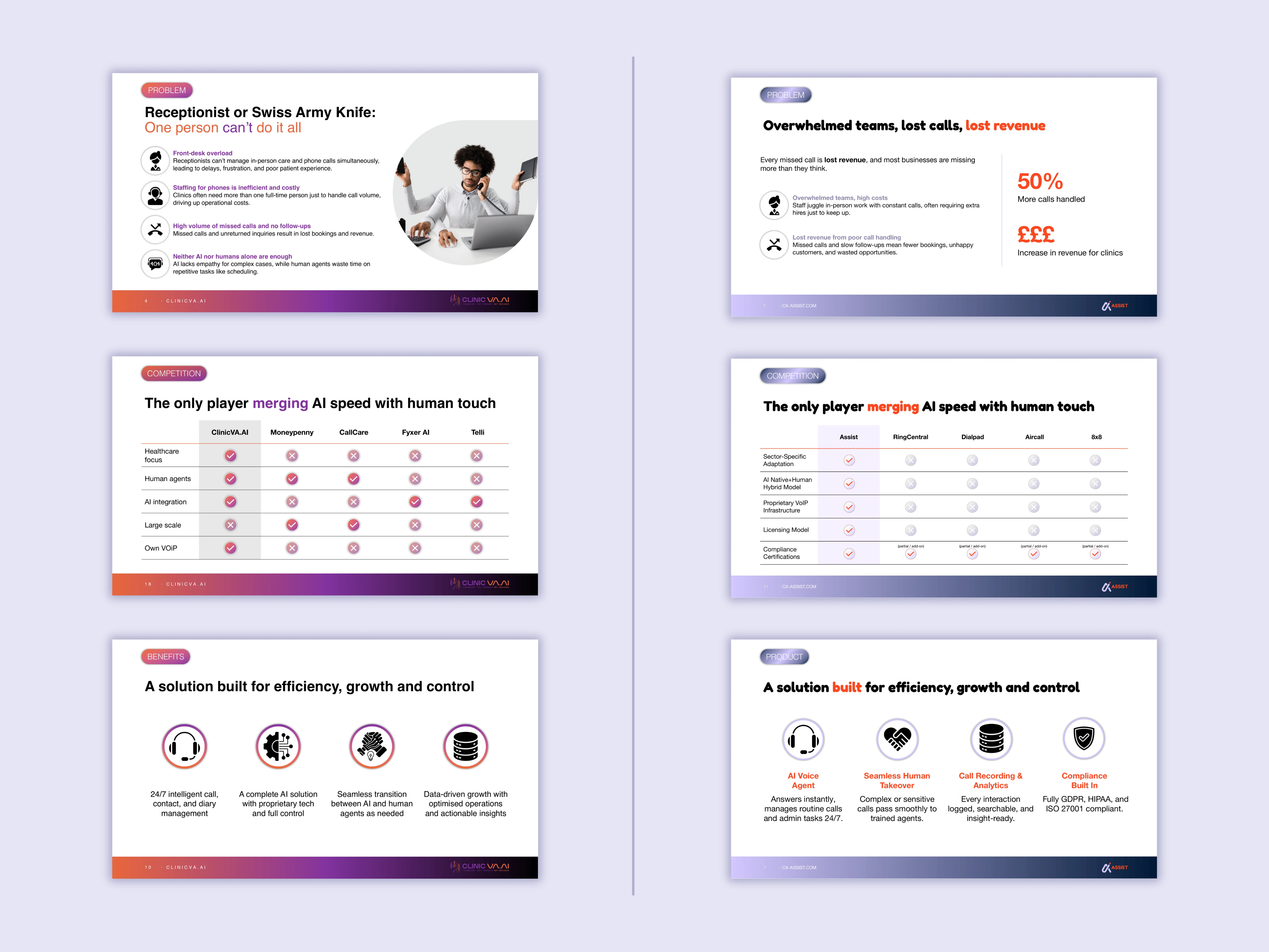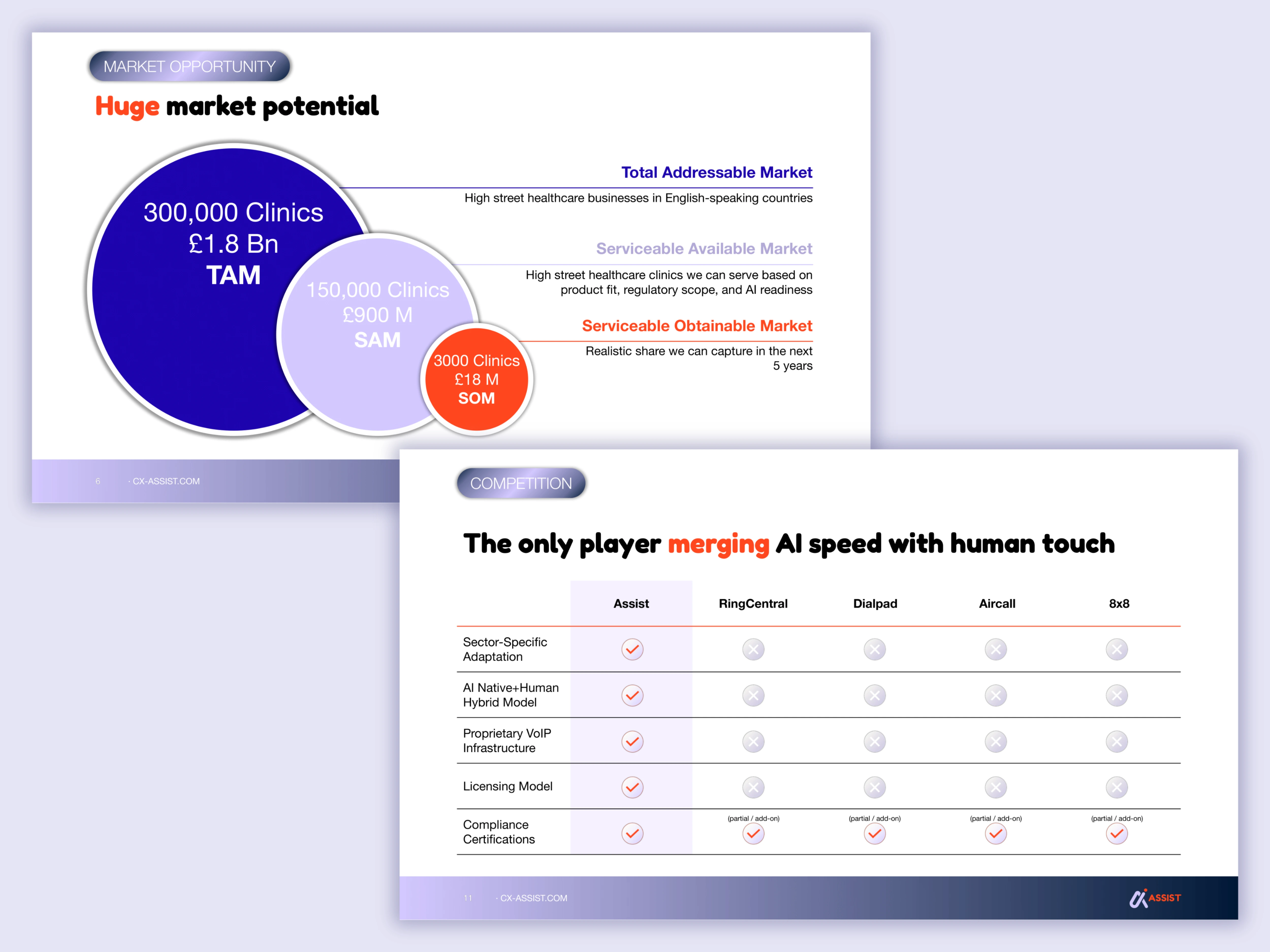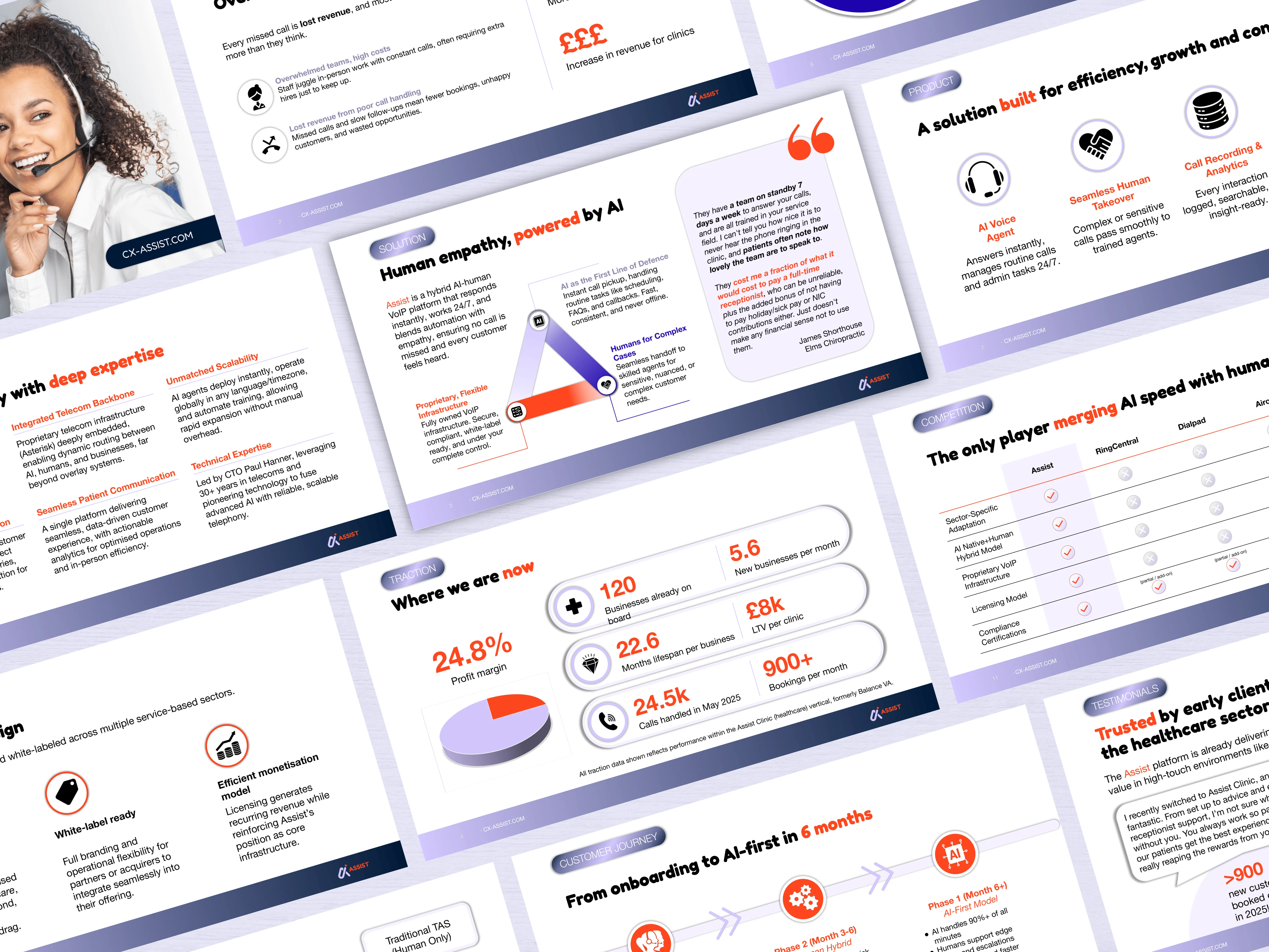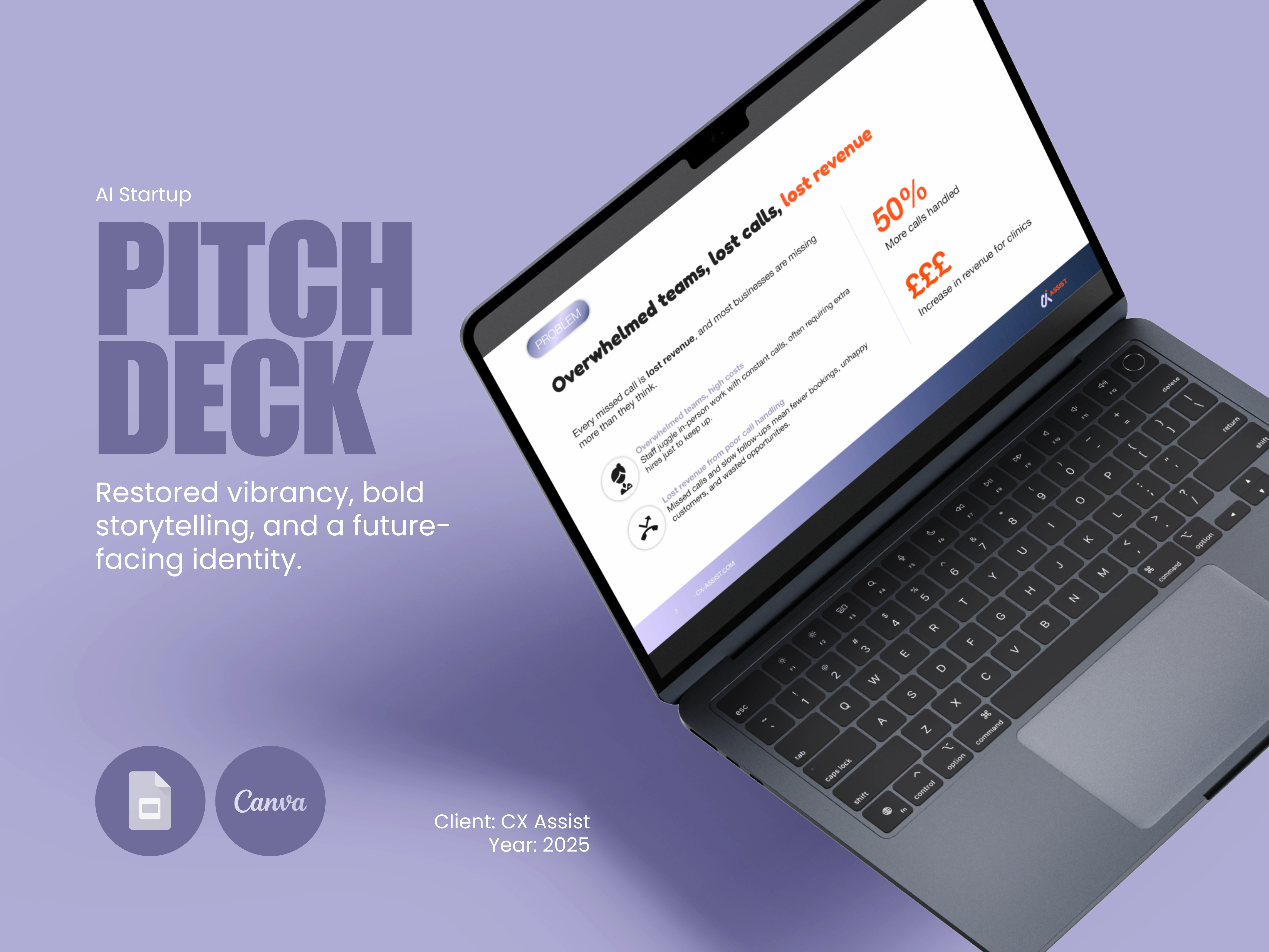 Built an investor-ready pitch deck from scratch, then rebranded and repositioned it as CX Assist expanded beyond healthcare.