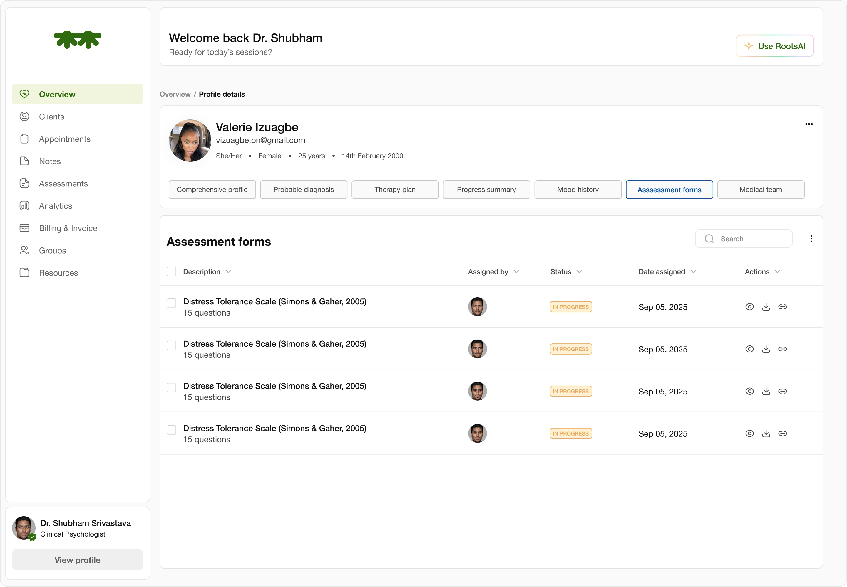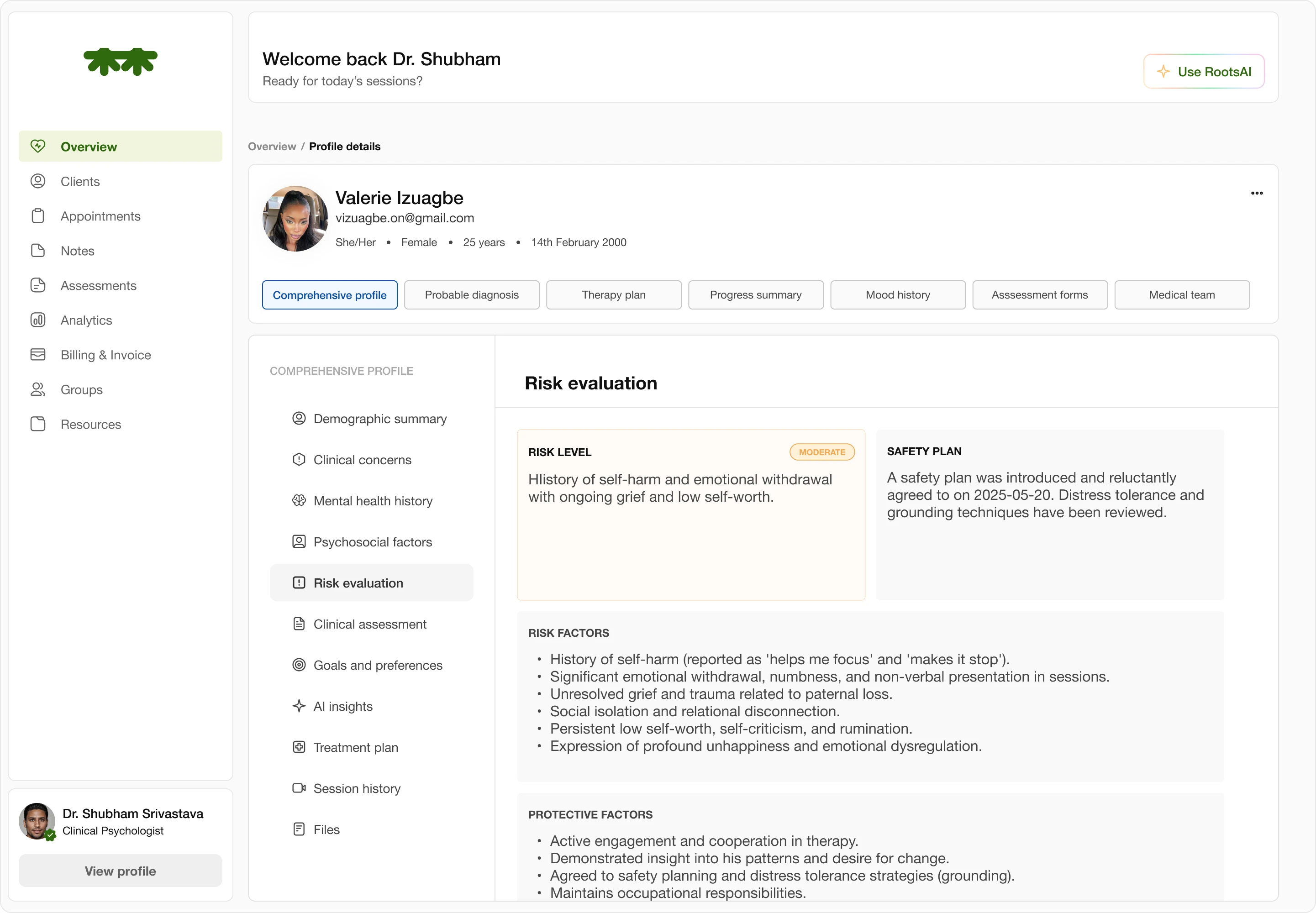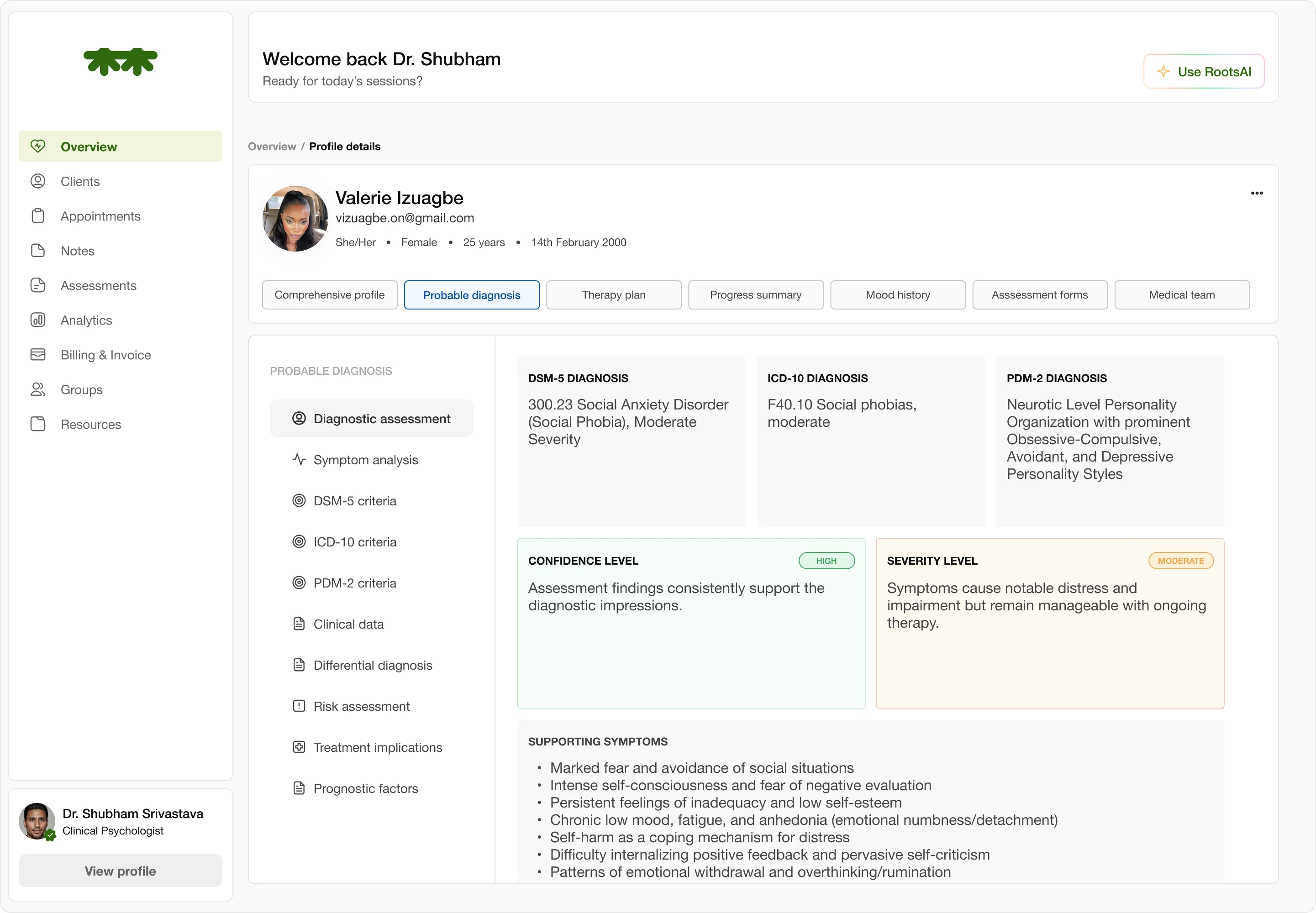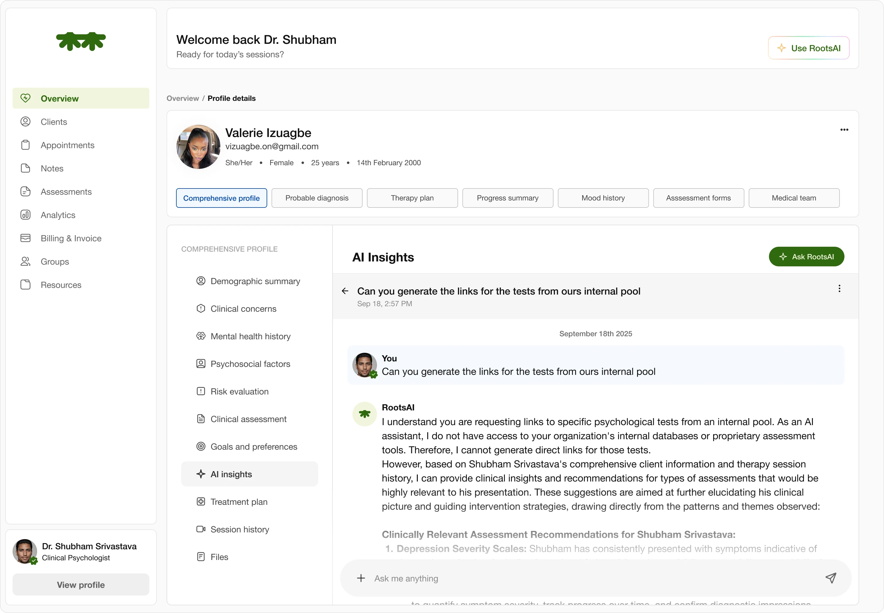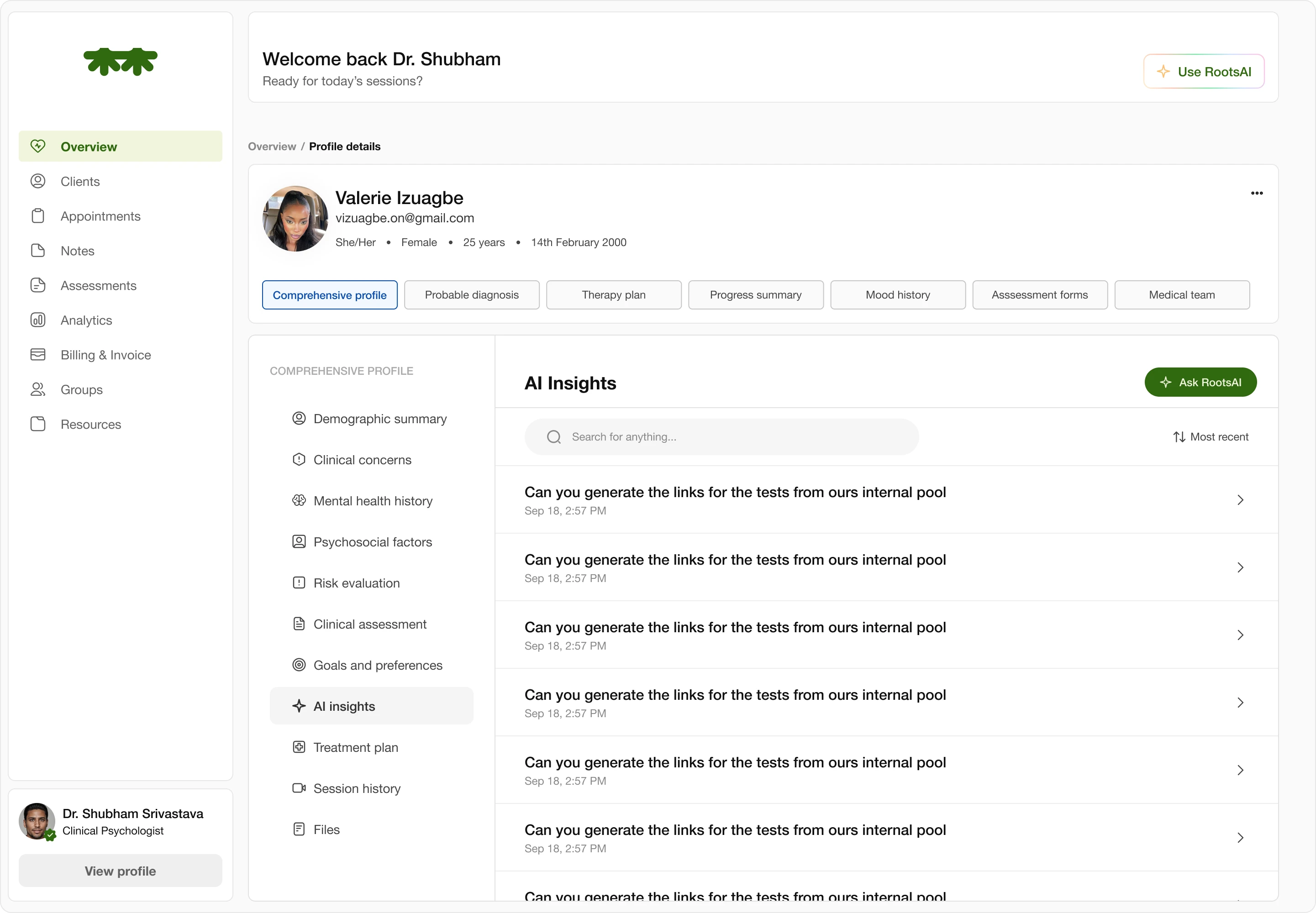 The RootsAI Insights organizes large amounts of clinical data—session notes, assessment trends, and emotional patterns—into a clear, conversational layout that helps therapists quickly understand what’s most important. I designed it to reduce cognitive overload by using a chat-style interface, progressive disclosure, and a calm visual hierarchy, allowing clinicians to ask targeted questions and receive structured, actionable recommendations without being overwhelmed by the complexity of the information.