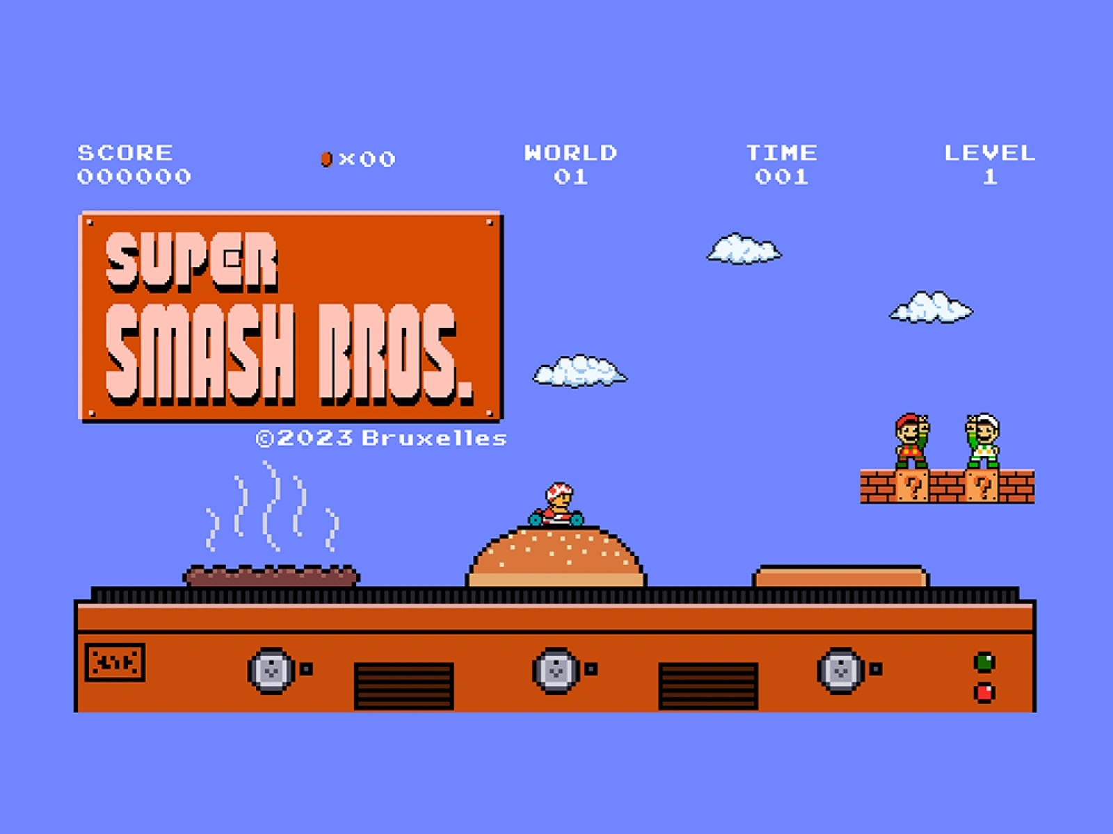 Super Smash Bros. reimagined in a vibrant 16-bit restaurant scene with detailed characters, food, and retro charm—perfect for games or themed art displays.