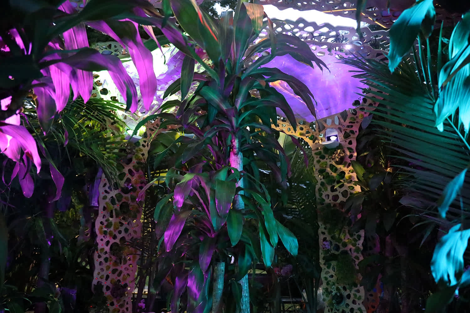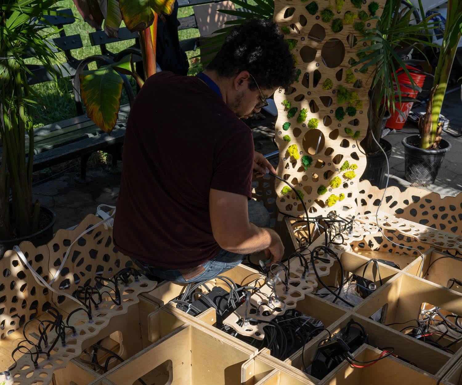 Plants served as interfaces, triggering projections, breezes, and colorful LEDs. I led the projection design, showcasing humanity’s impact on carbon sinks—soil, sky, forests, and oceans. Video footage was overlaid with animated Voronoi patterns, which distorted the imagery based on proximity data from radar sensors.