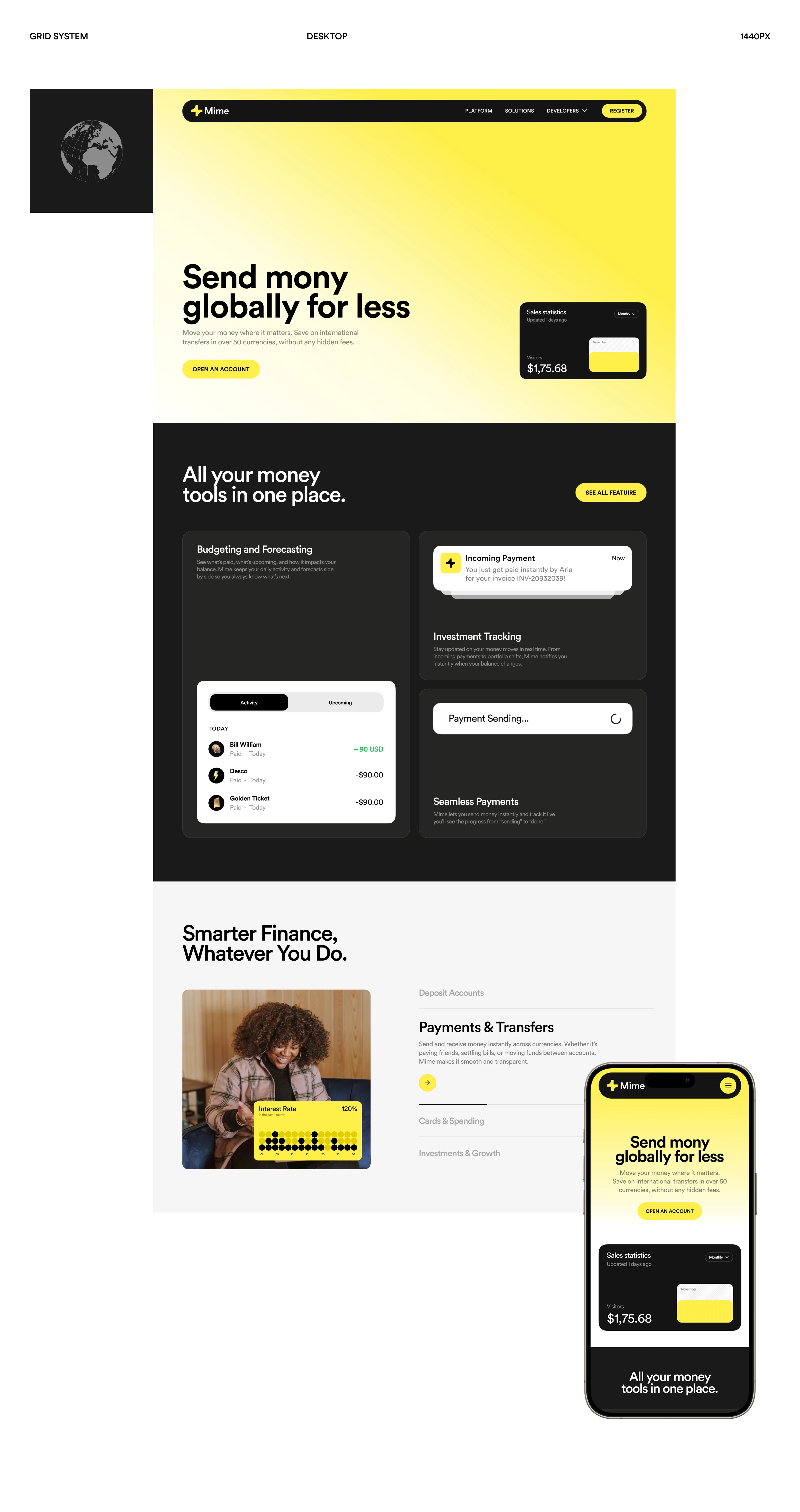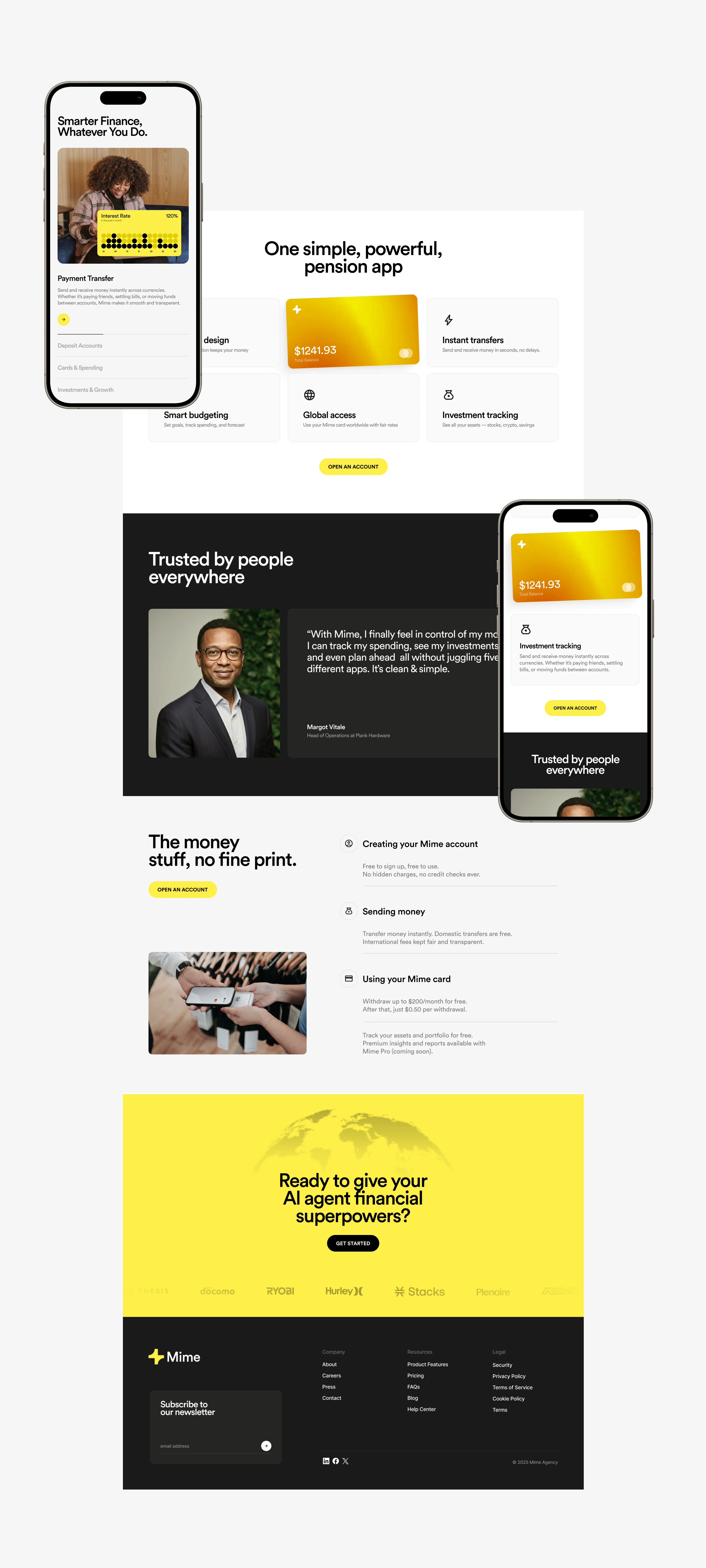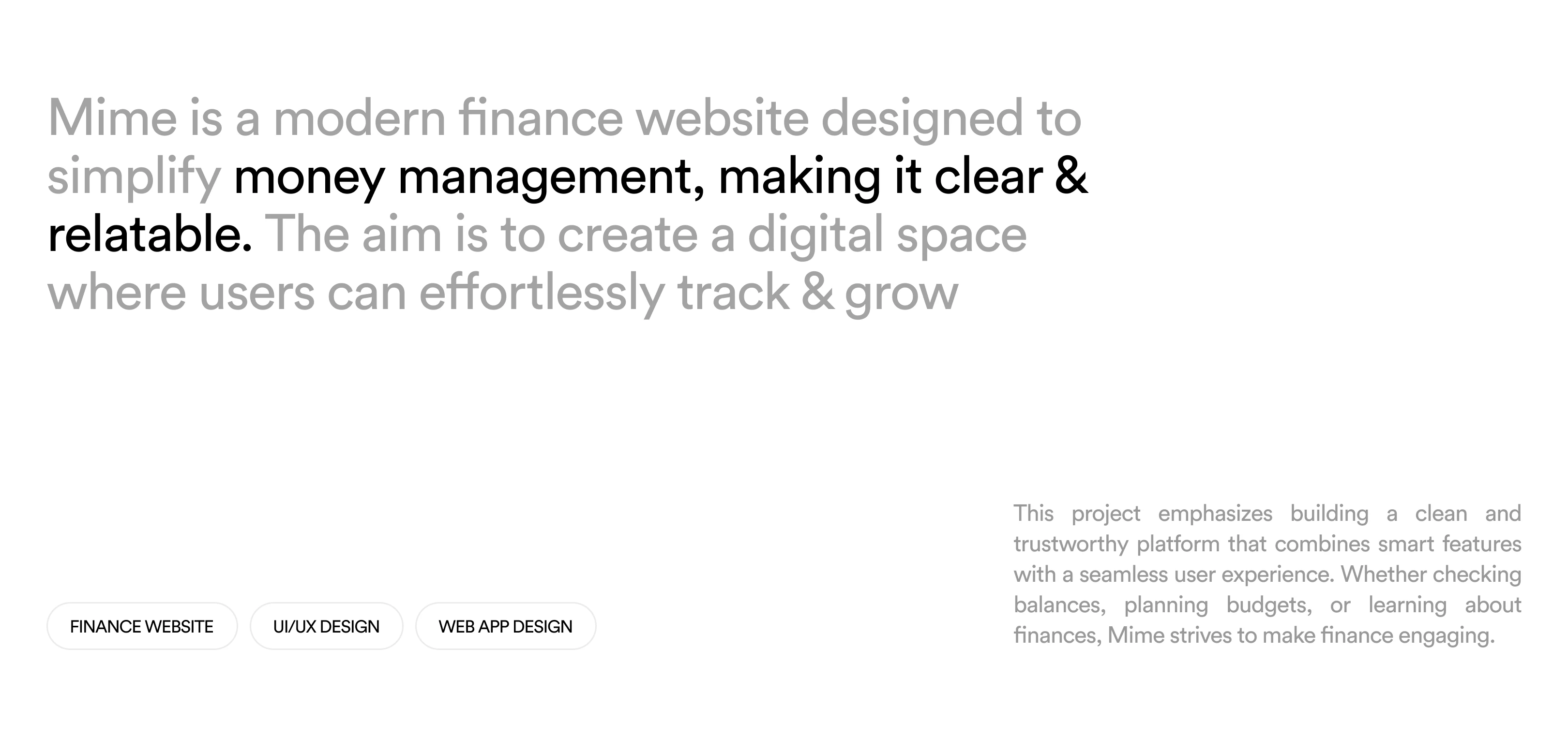 Mime Finance is a next-generation fintech platform built to simplify personal finance management and empower users with smarter financial decisions. The goal was to create a modern, trustworthy, and human-centered digital experience that balances clarity with confidence.