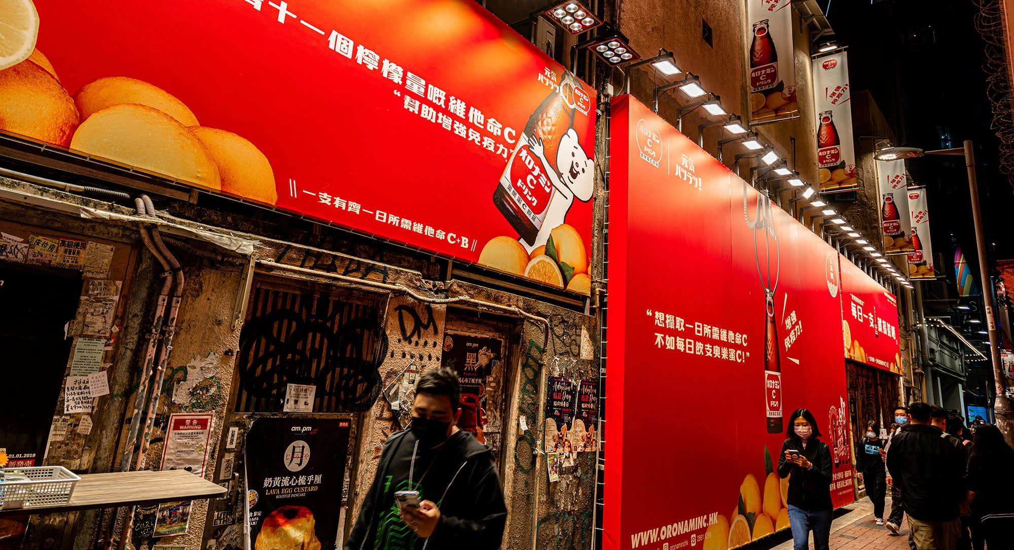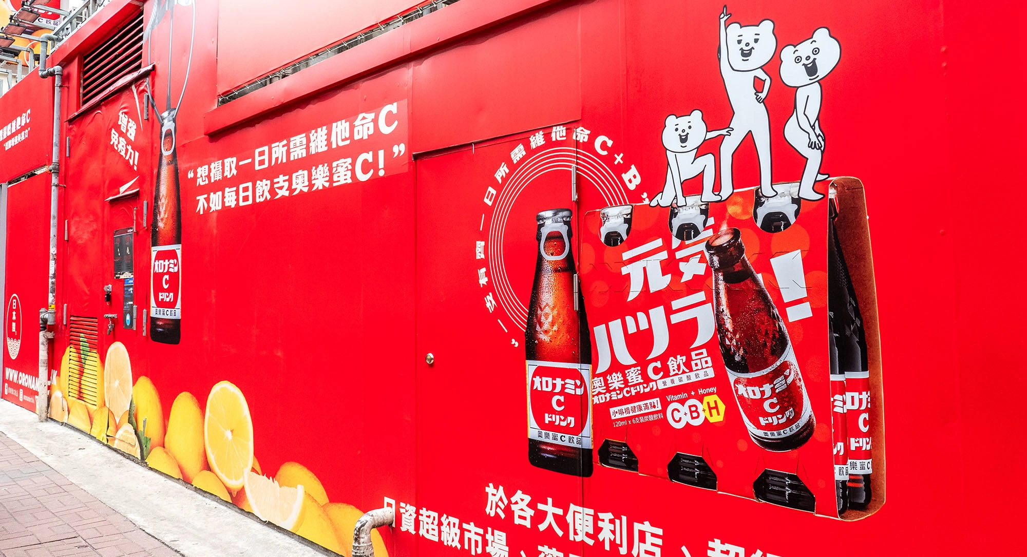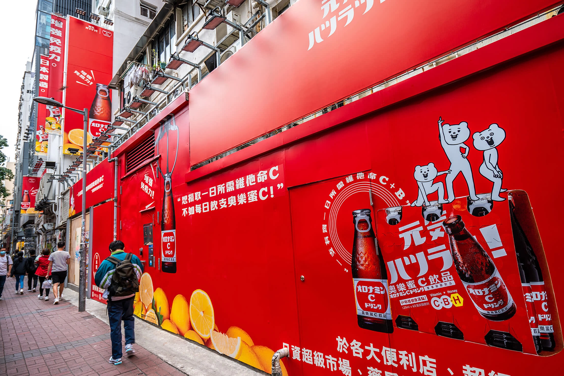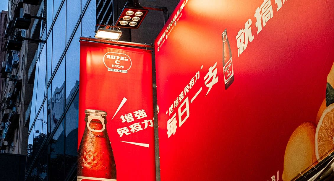 The background was entirely red, reinforcing the brand’s identity while standing out in the narrow, crowded back alley where the billboard was placed. The bold color helped deliver the message instantly and matched the lively energy of Japanese advertising aesthetics.