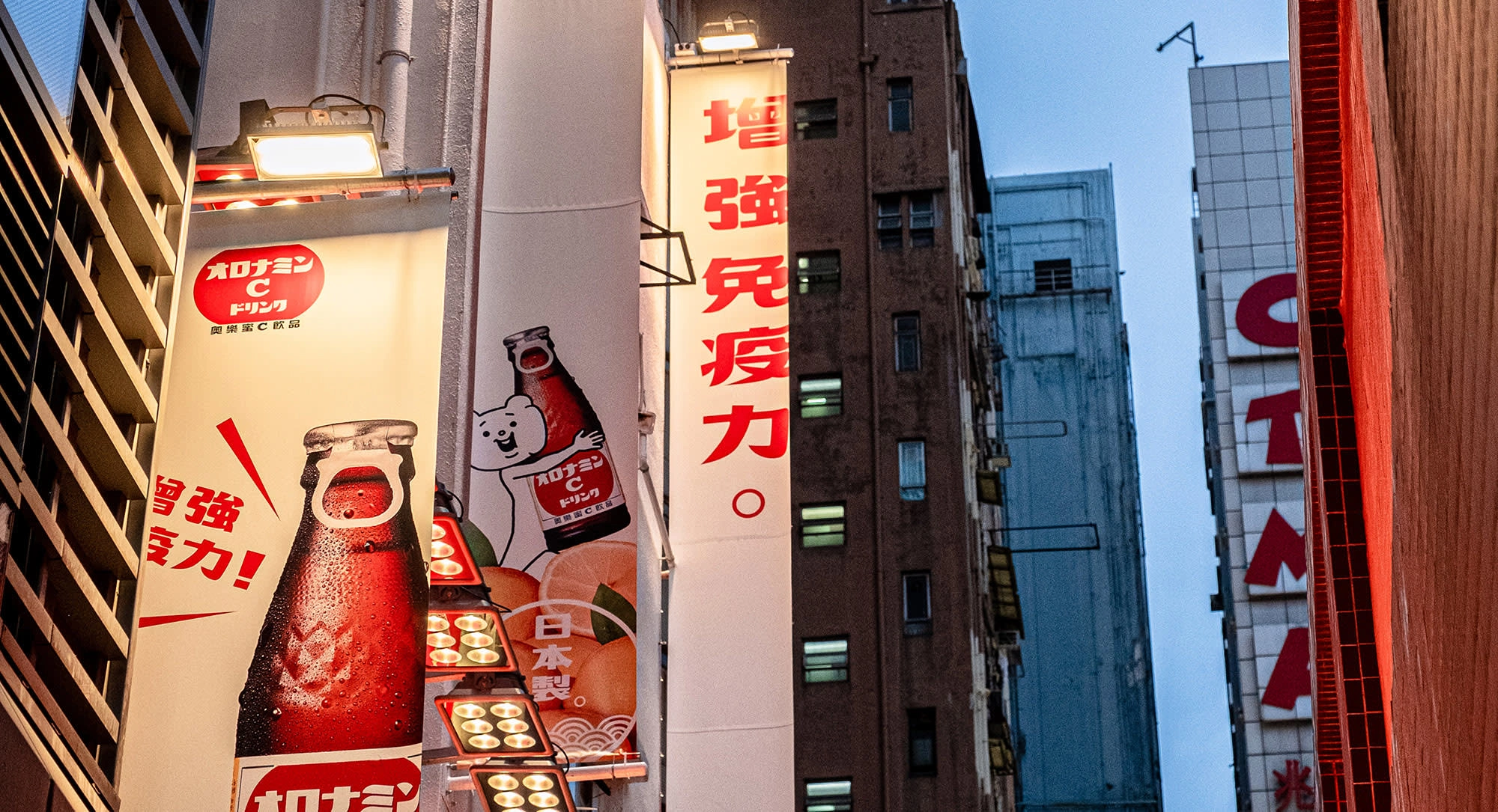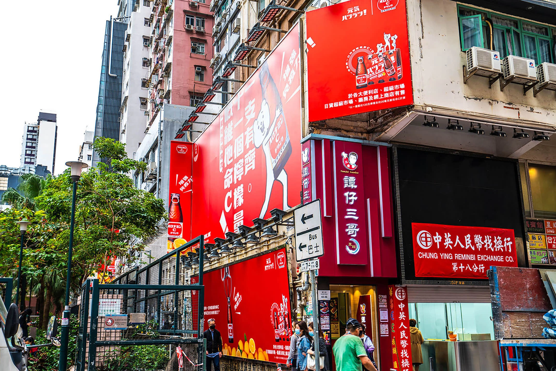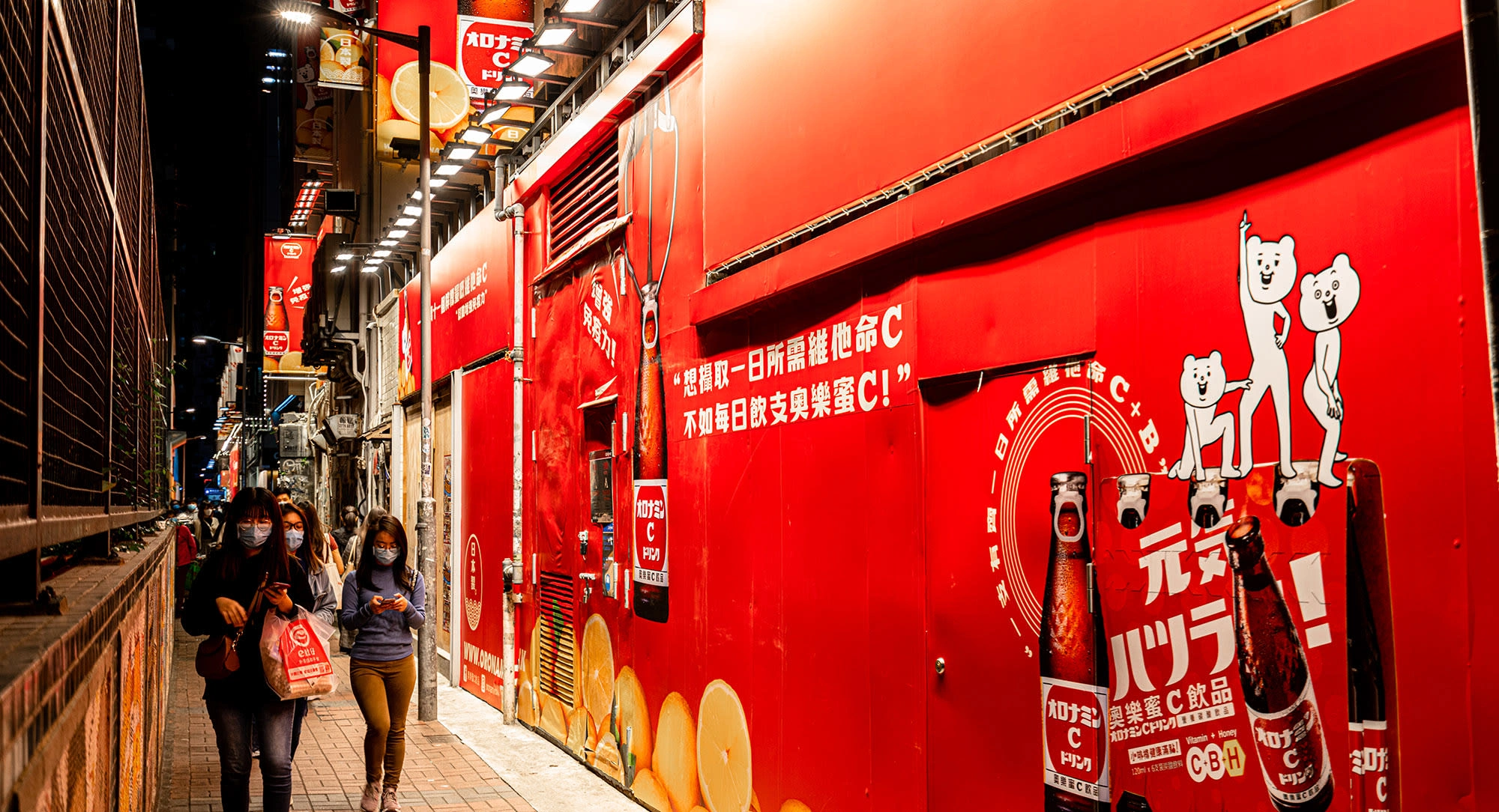 The background was entirely red, reinforcing the brand’s identity while standing out in the narrow, crowded back alley where the billboard was placed. The bold color helped deliver the message instantly and matched the lively energy of Japanese advertising aesthetics.