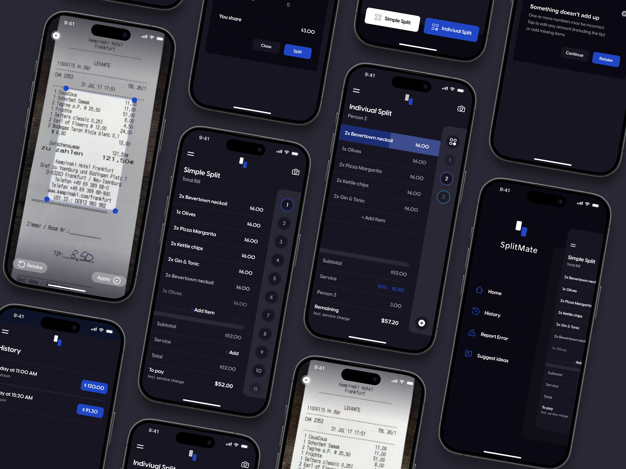 A black, simple UI helps to concentrate on the bill specifics. High-contrast highlights direct users through crucial tasks: scanning, assigning, and validating totals. The design is perfect for using with one hand, which makes it easy to keep track of even in places like bars or restaurants.