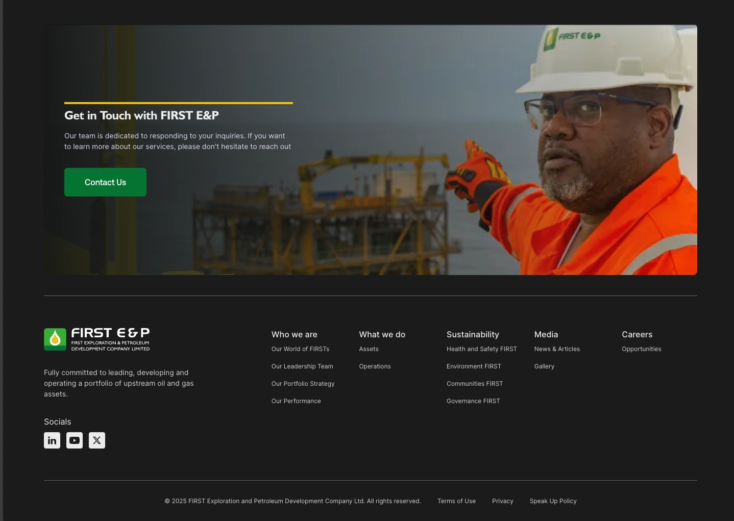 The “Who We Are” page focuses on storytelling, introducing FIRST E&P’s mission, leadership, and governance through a mix of structured grids, portrait imagery, and subtle scroll animations. Built in Webflow, reusable components were used for team profiles and section dividers, ensuring easy updates as the company grows.