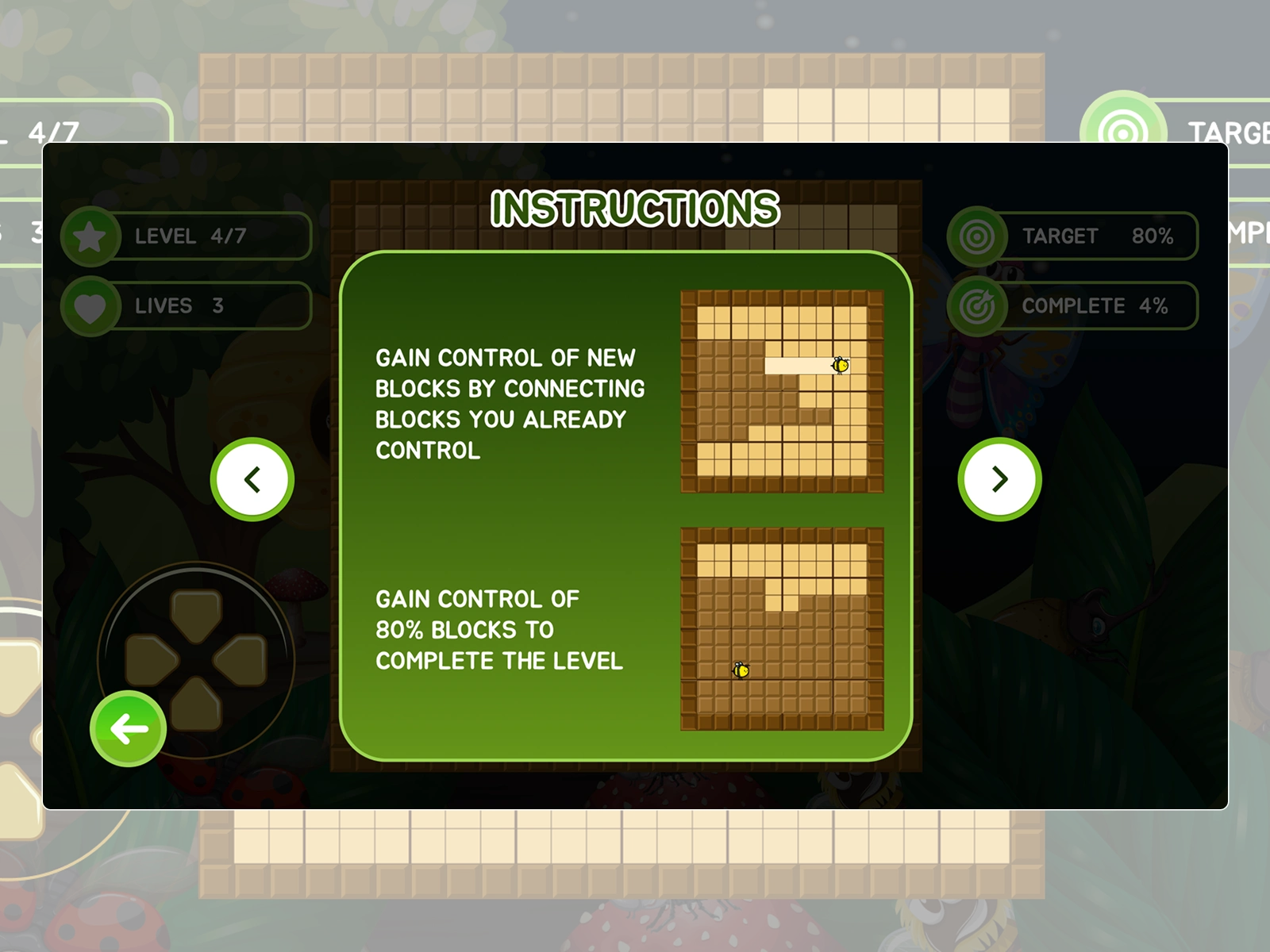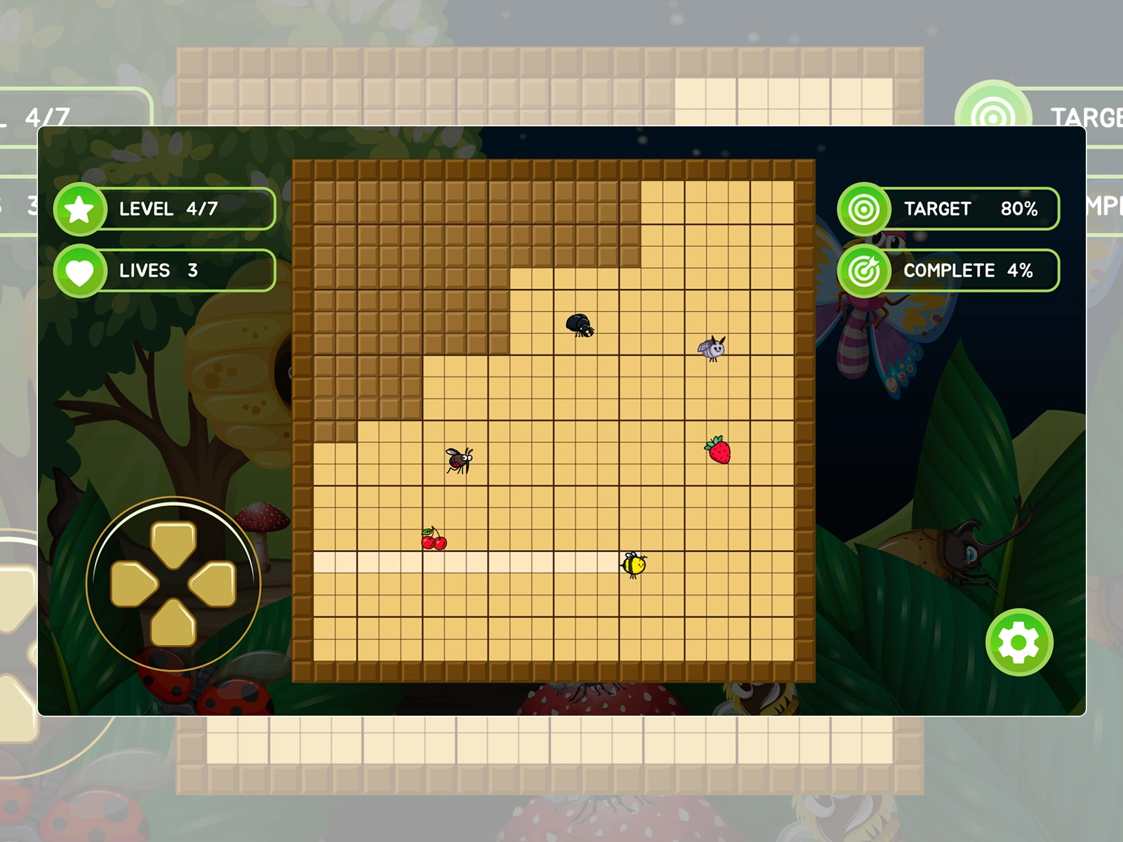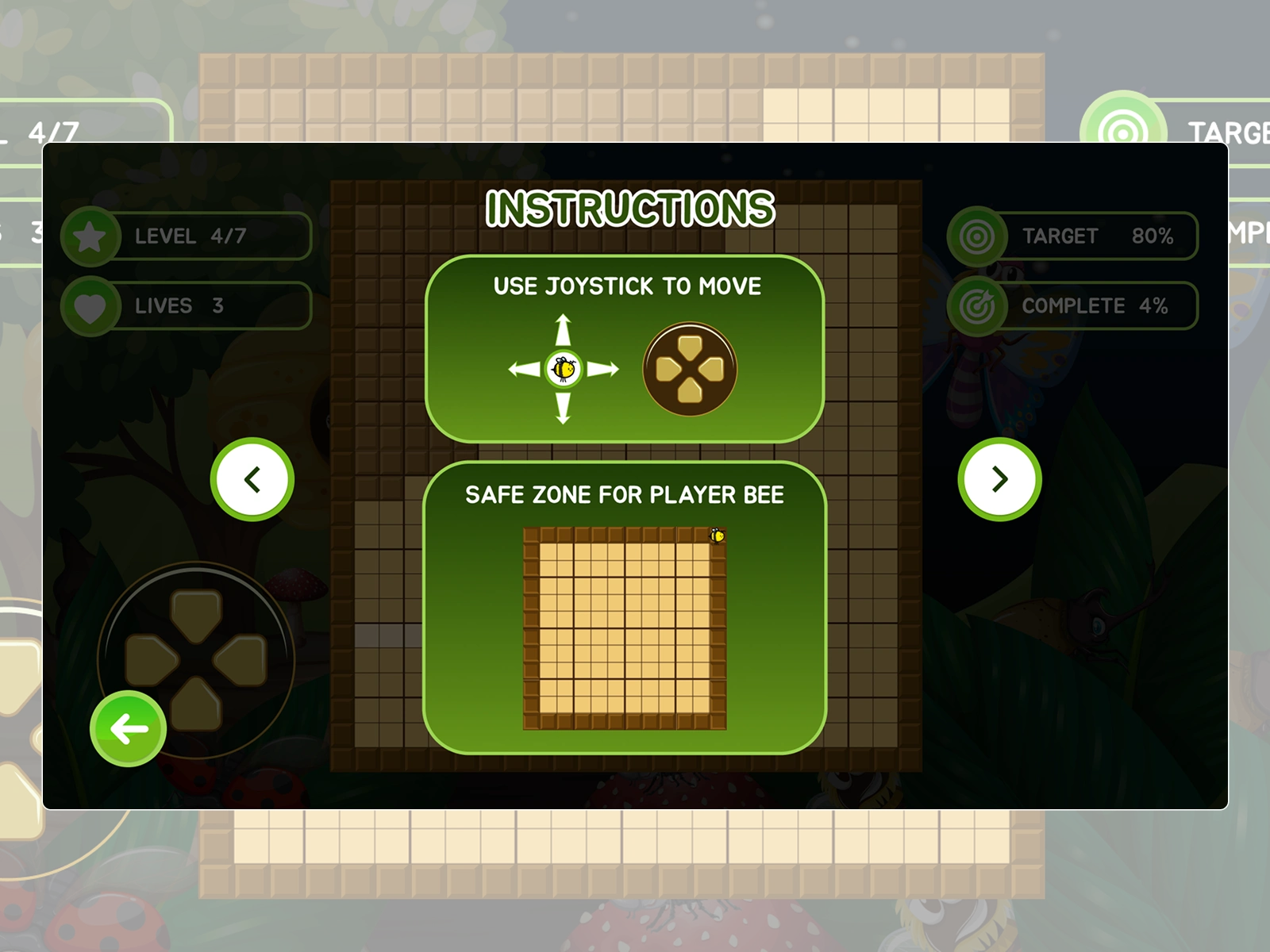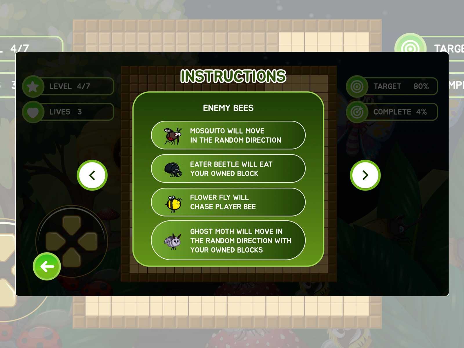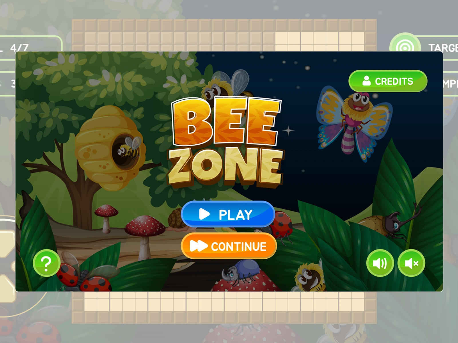 Bee Zone is a PC game where a bee fills boxes on a board while avoiding enemies, with music, sounds, instructions, help, and credits for a full experience.