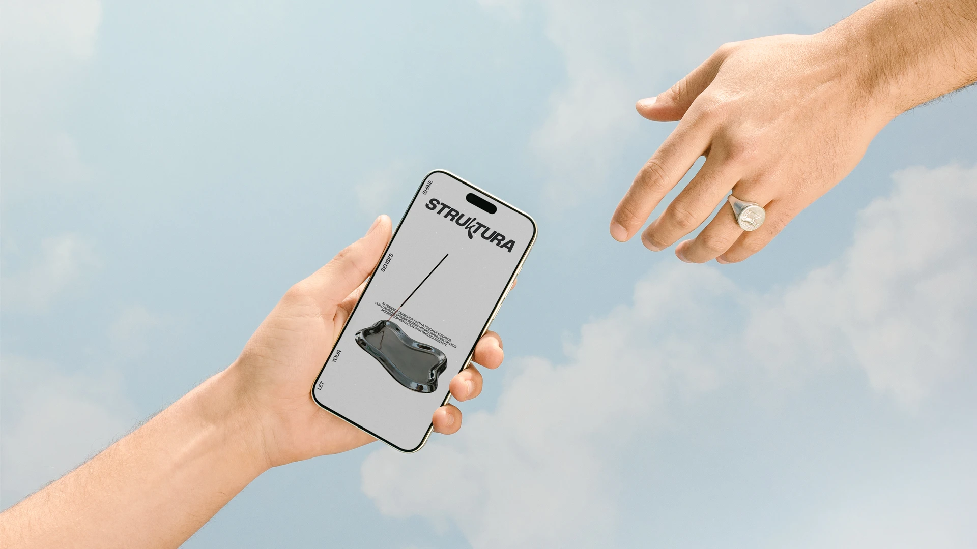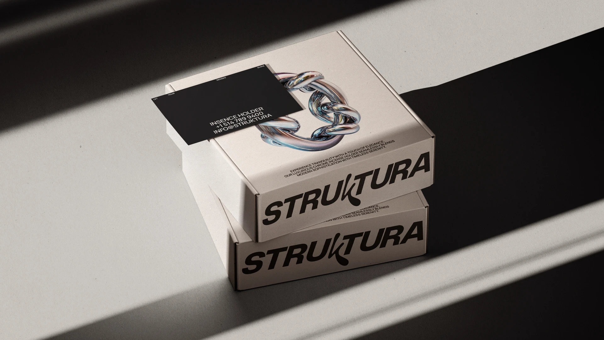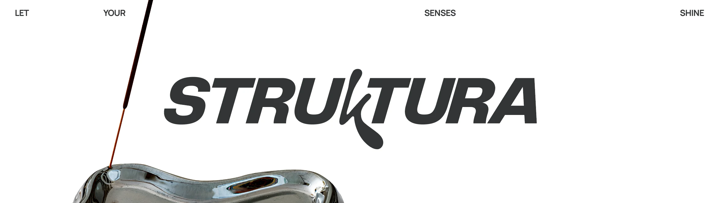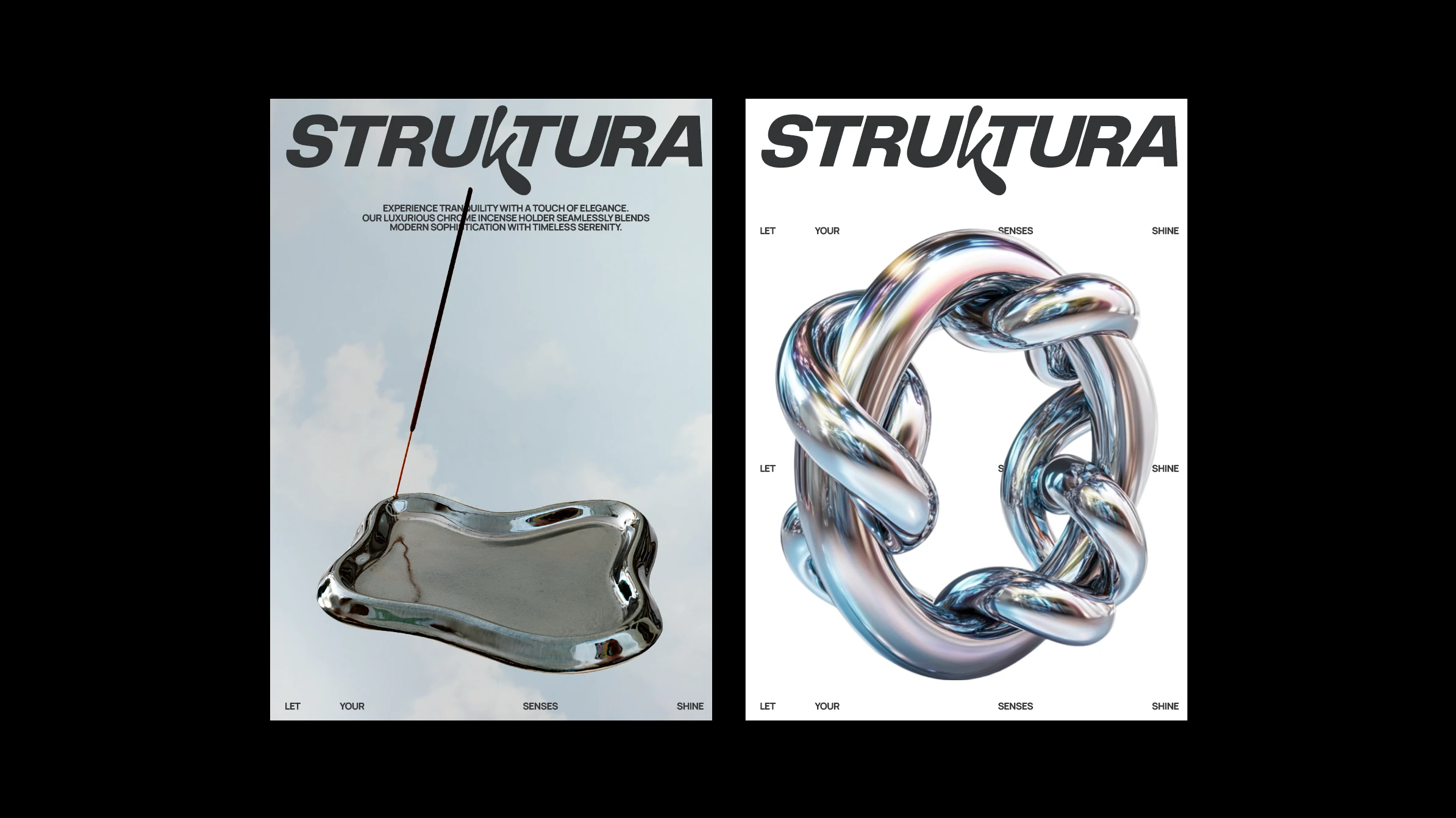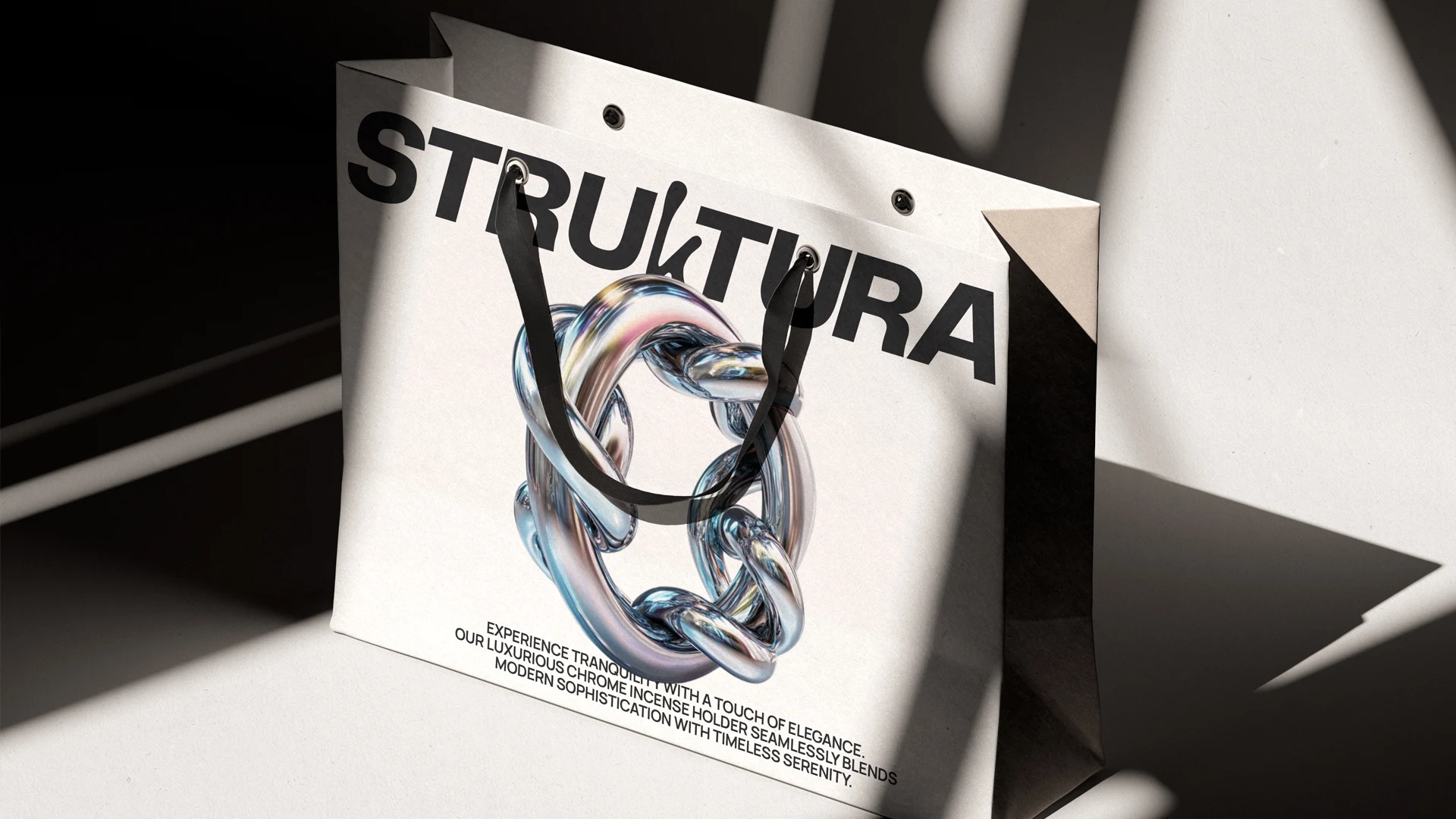 Struktura is a design piece that embodies modern elegance. Its visual identity balances sharp geometry with fluid motion, reflecting the duality of strength and softness. The bold, minimalist logo is defined by clean lines, while the letter K introduces an organic contrast — a dynamic form inspired by the fluidity of melted chrome. This striking element captures the essence of the incense holder, where industrial material meets sculptural beauty.