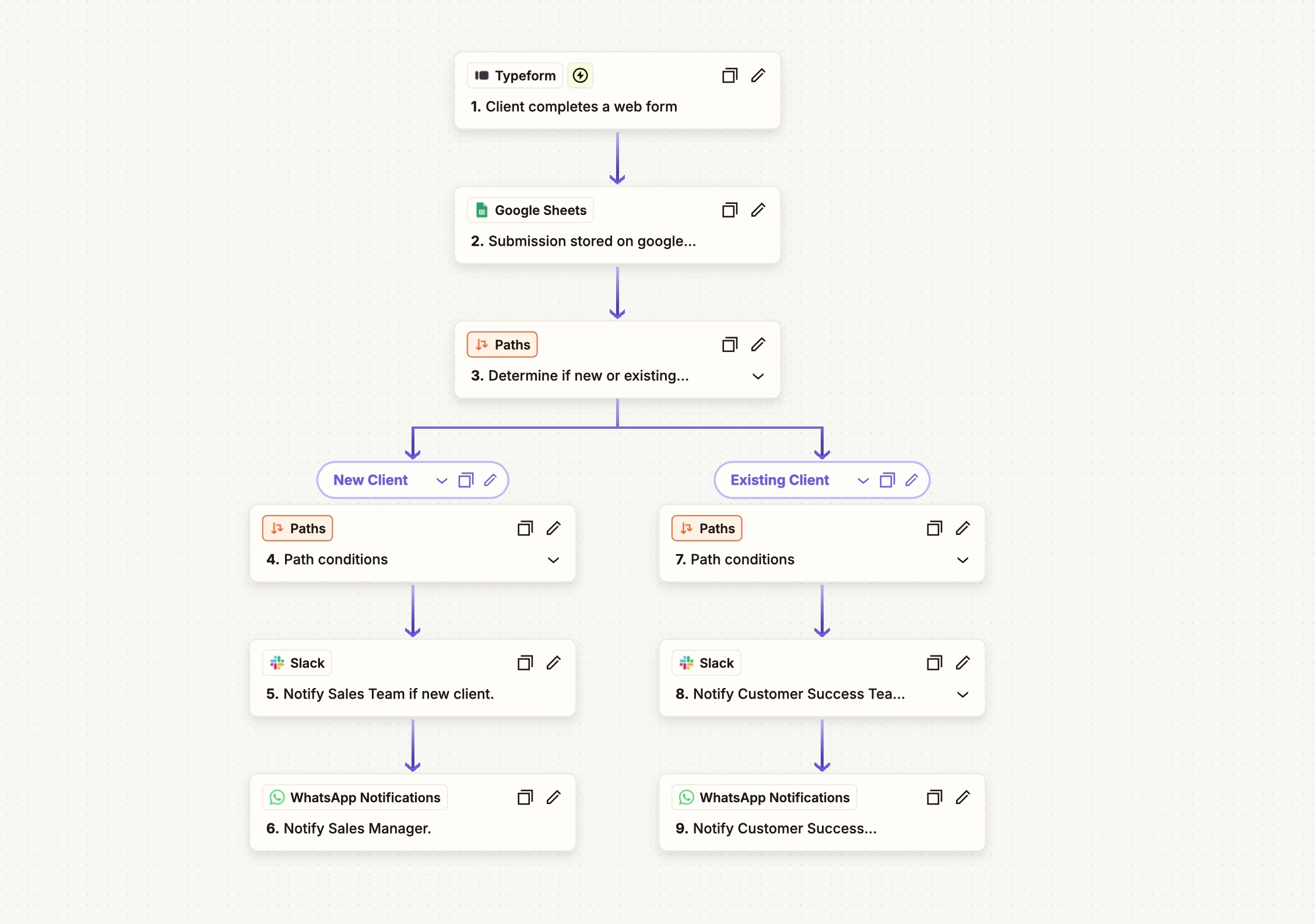 Lead routing automation using Zapier. Form submissions are classified (new vs. existing clients), routed to the right team, and trigger custom alerts.