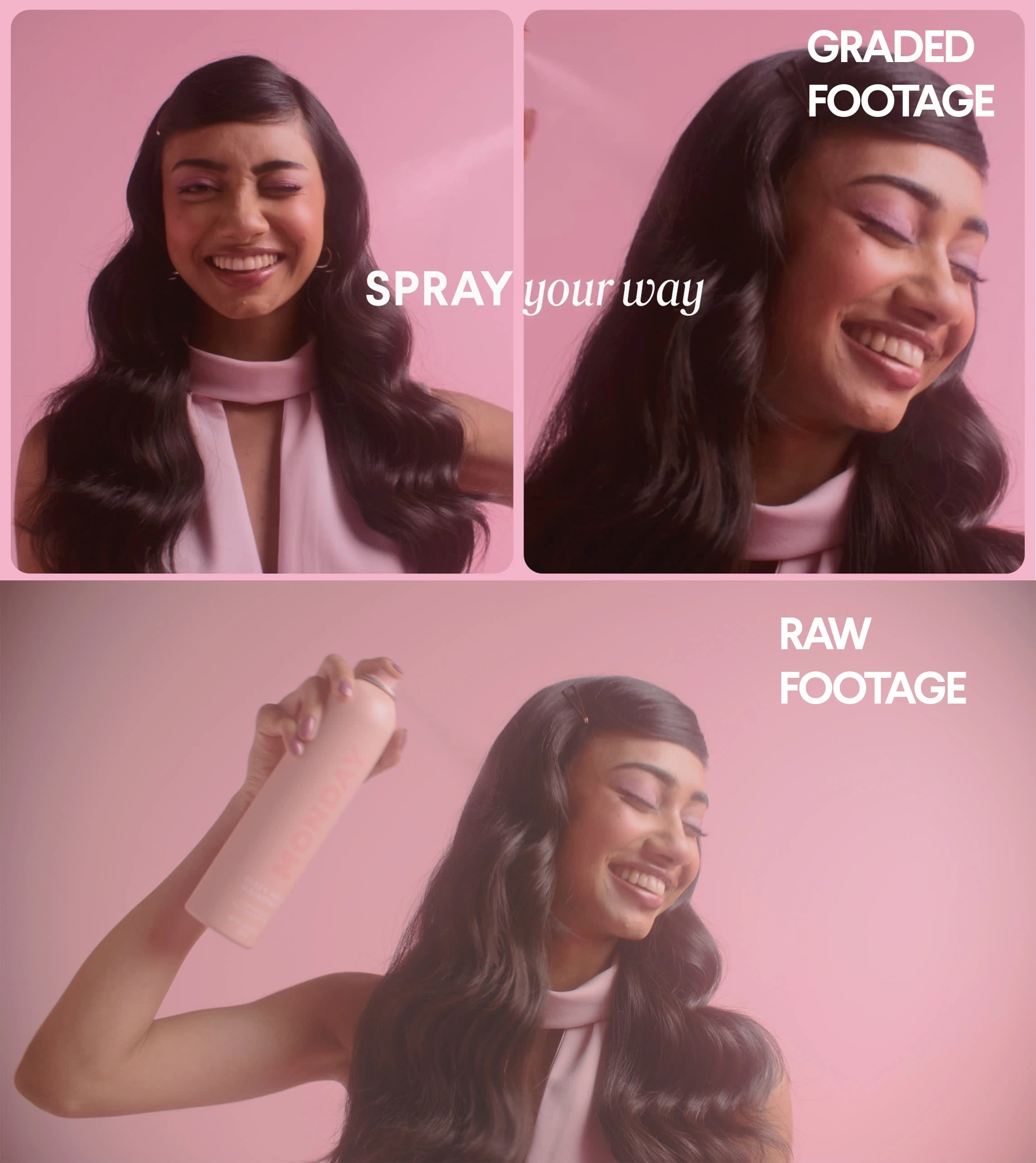A new bodywash, i made my edit to include some steamy/sauna effect to the footage in post, as well as make sure the talent looked like they had got out of the shower/bath - achieved through adjustment layers and layers of water droplets superimposed. We were limited on shots for this one so i decided to create a middle section that rotoscoped out the same model to give the impression she was in multiple scenes, and then move her in the background on a 4-color gradient to blend.
