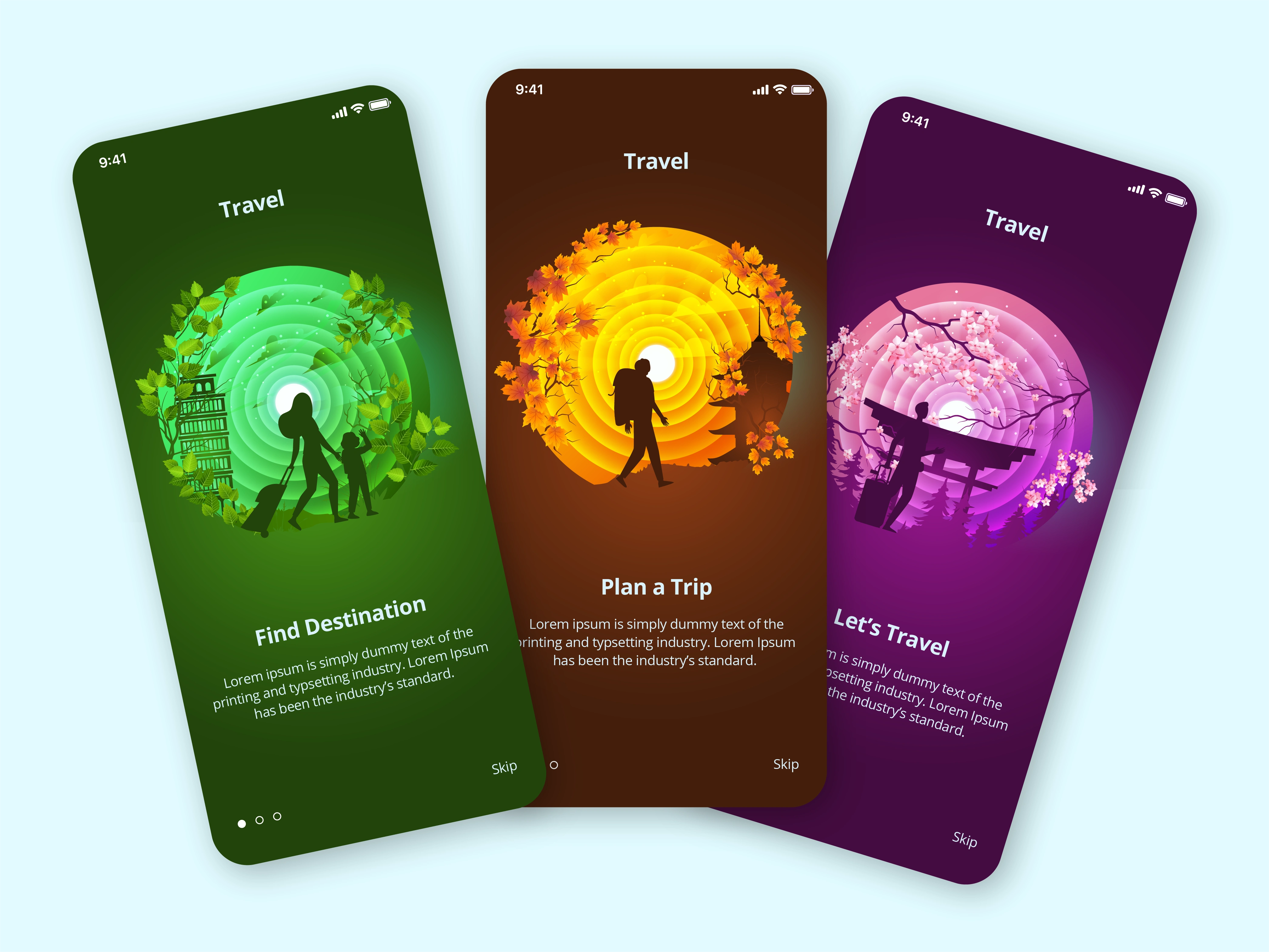 These travel onboarding screens aim to create a welcoming first impression for a user-friendly travel app.