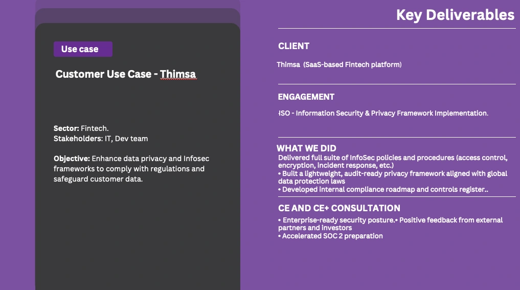 Implemented a complete set of InfoSec policies and a scalable privacy framework for Thimsa, a SaaS Co. Delivered controls and documentation with ISO,GDPR&SOC2