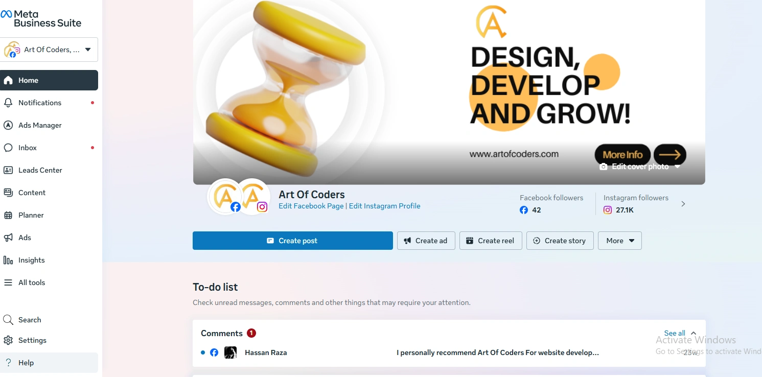 Using Meta Business Suite, I created and scheduled targeted posts that aligned with the brand's identity and message: "Design, Develop, and Grow!" I also coordinated graphics, reels, and stories that boosted visual appeal and drove consistent engagement.