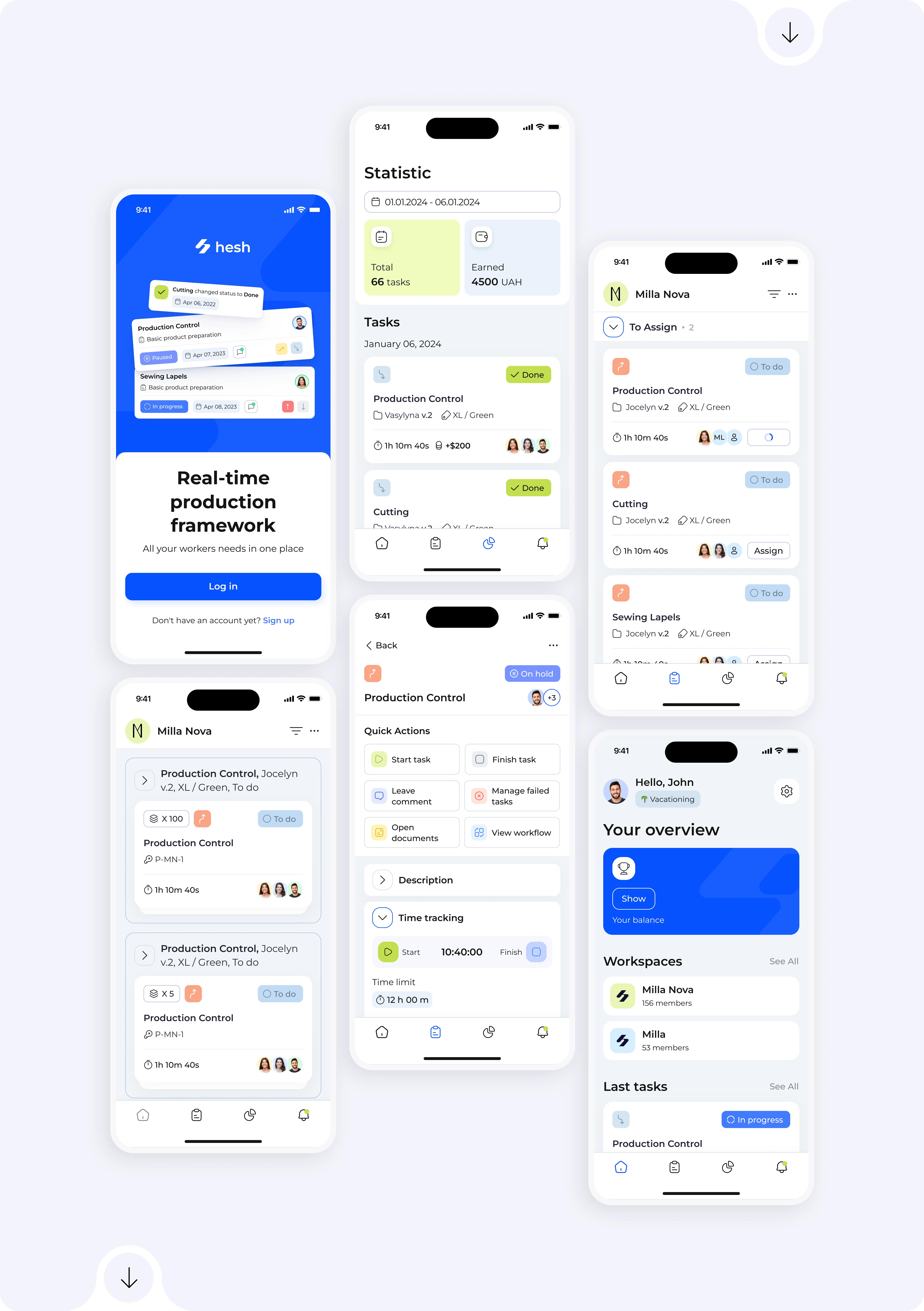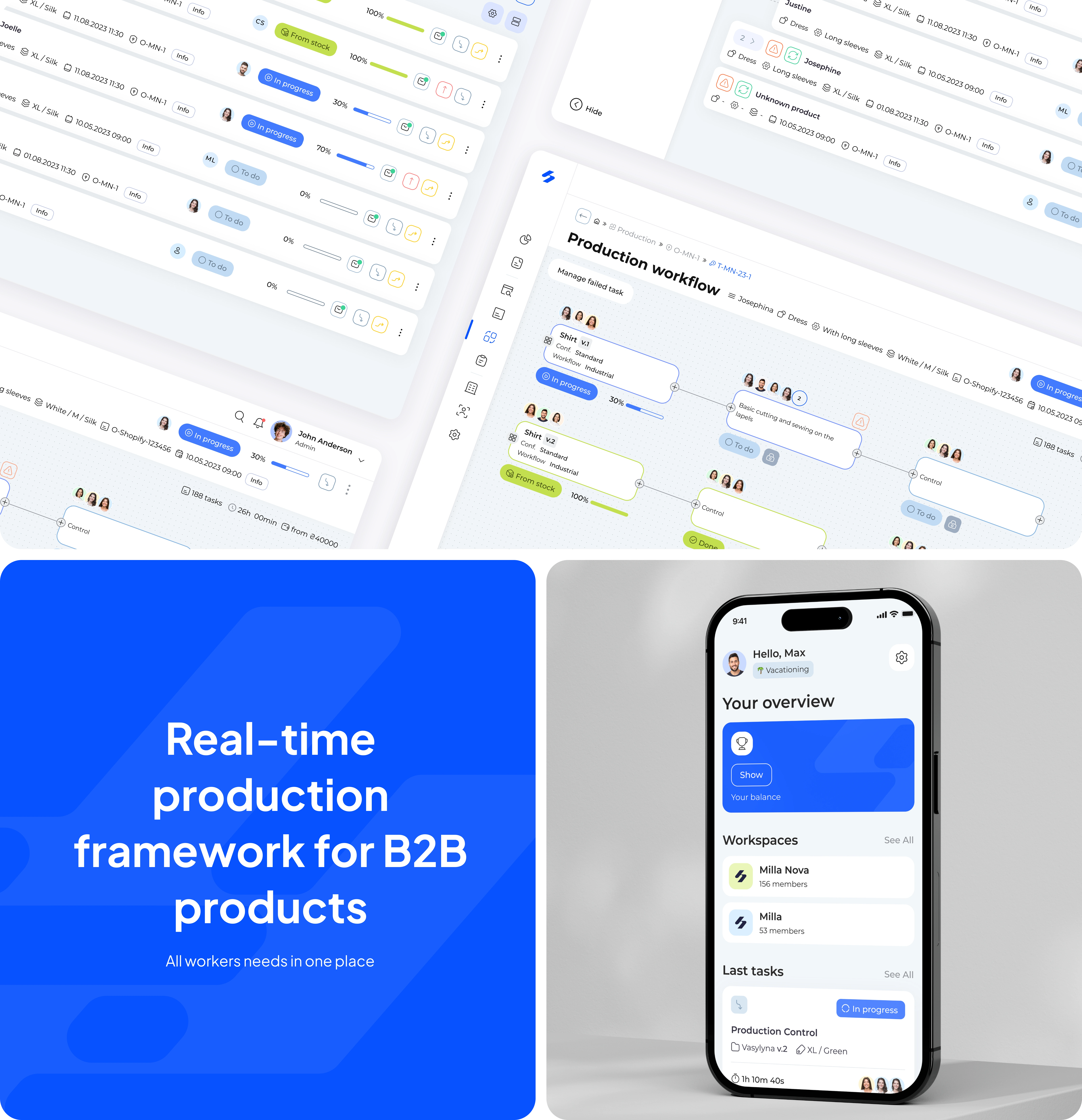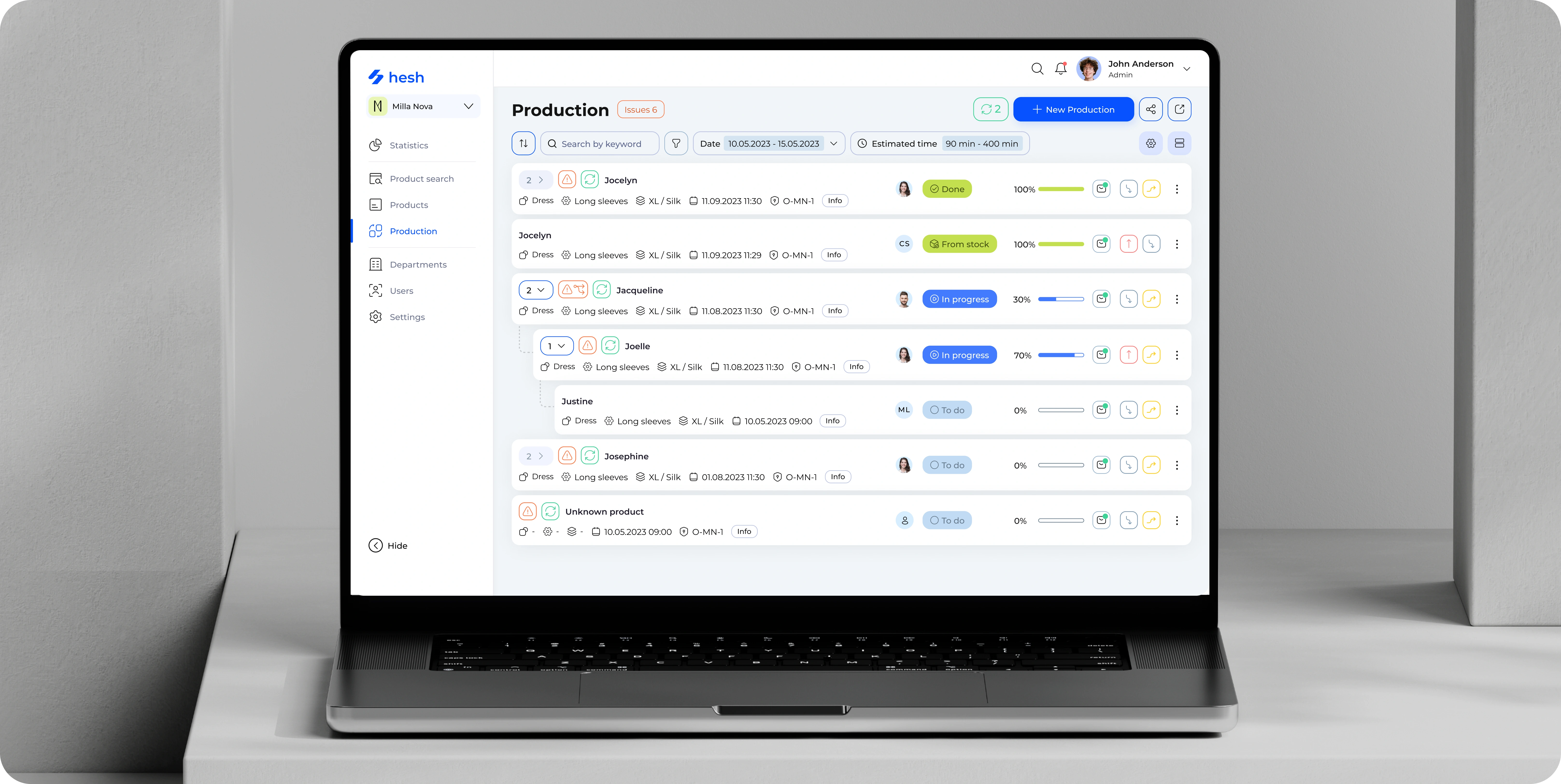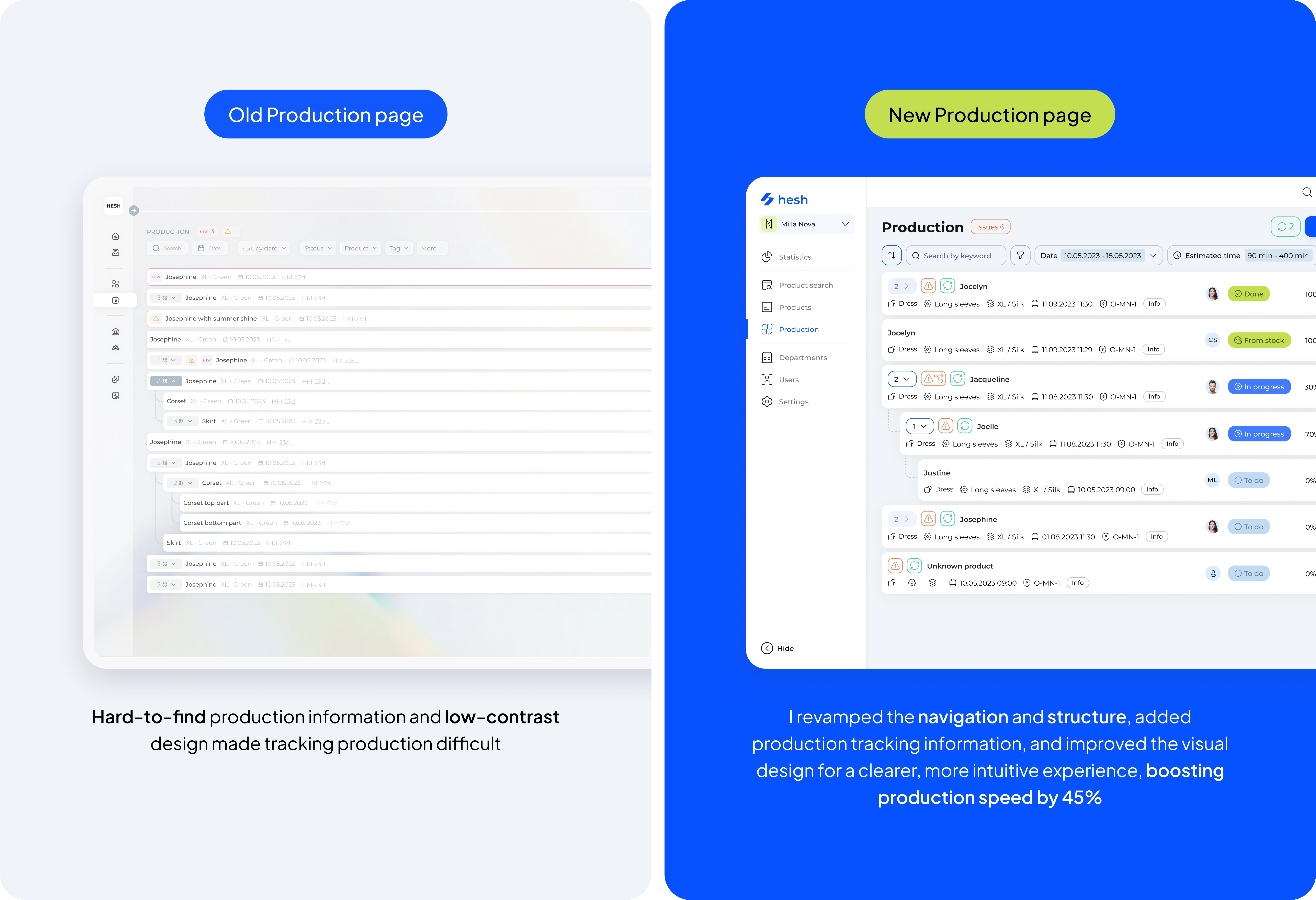 Hesh is a real-time manufacturing execution system (MES) designed to streamline and optimize production processes for a fashion brand operating in the U.S. I led the end-to-end redesign of the platform, introducing a more intuitive experience for industrial teams and improving operational visibility and task management.