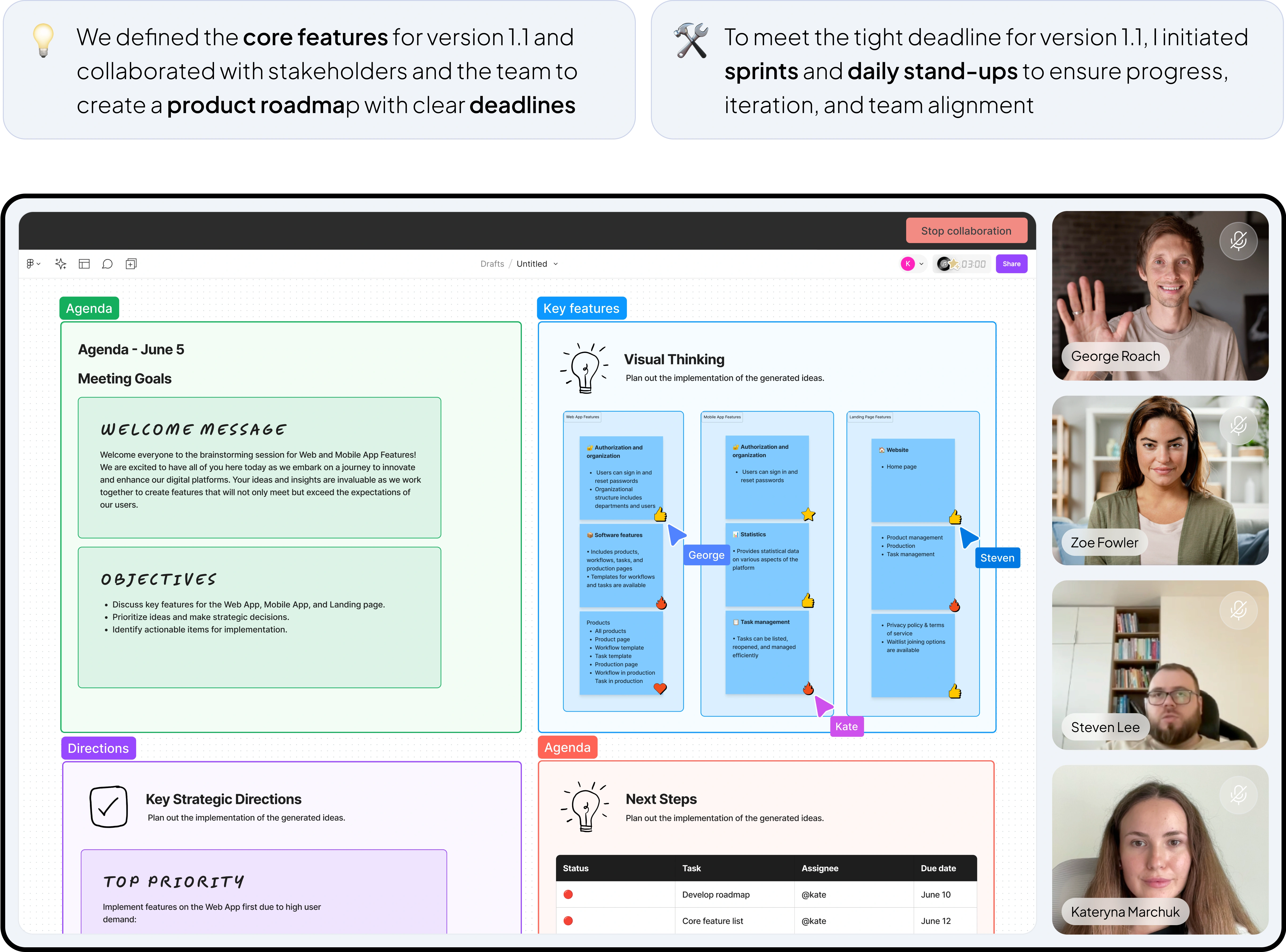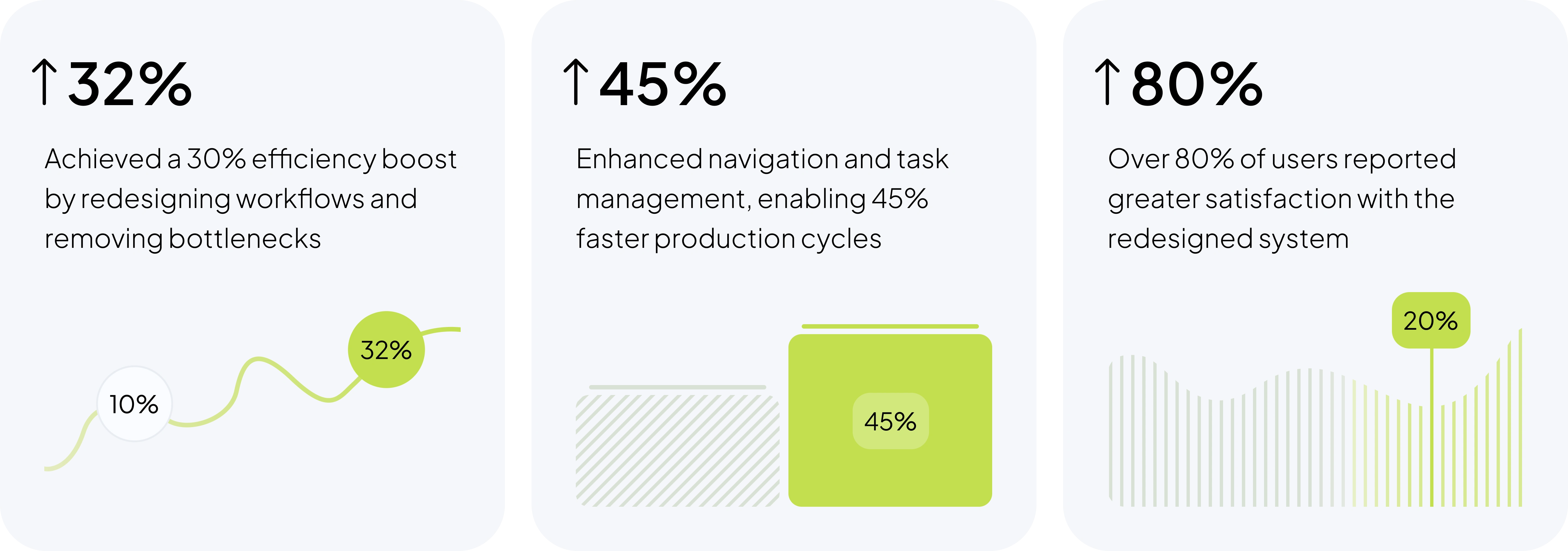 The new experience boosted production efficiency by 30%, improved navigation and task distribution, and increased team alignment. The mobile solution improved communication speed by 20%, while the design system reduced inconsistency and developer friction.