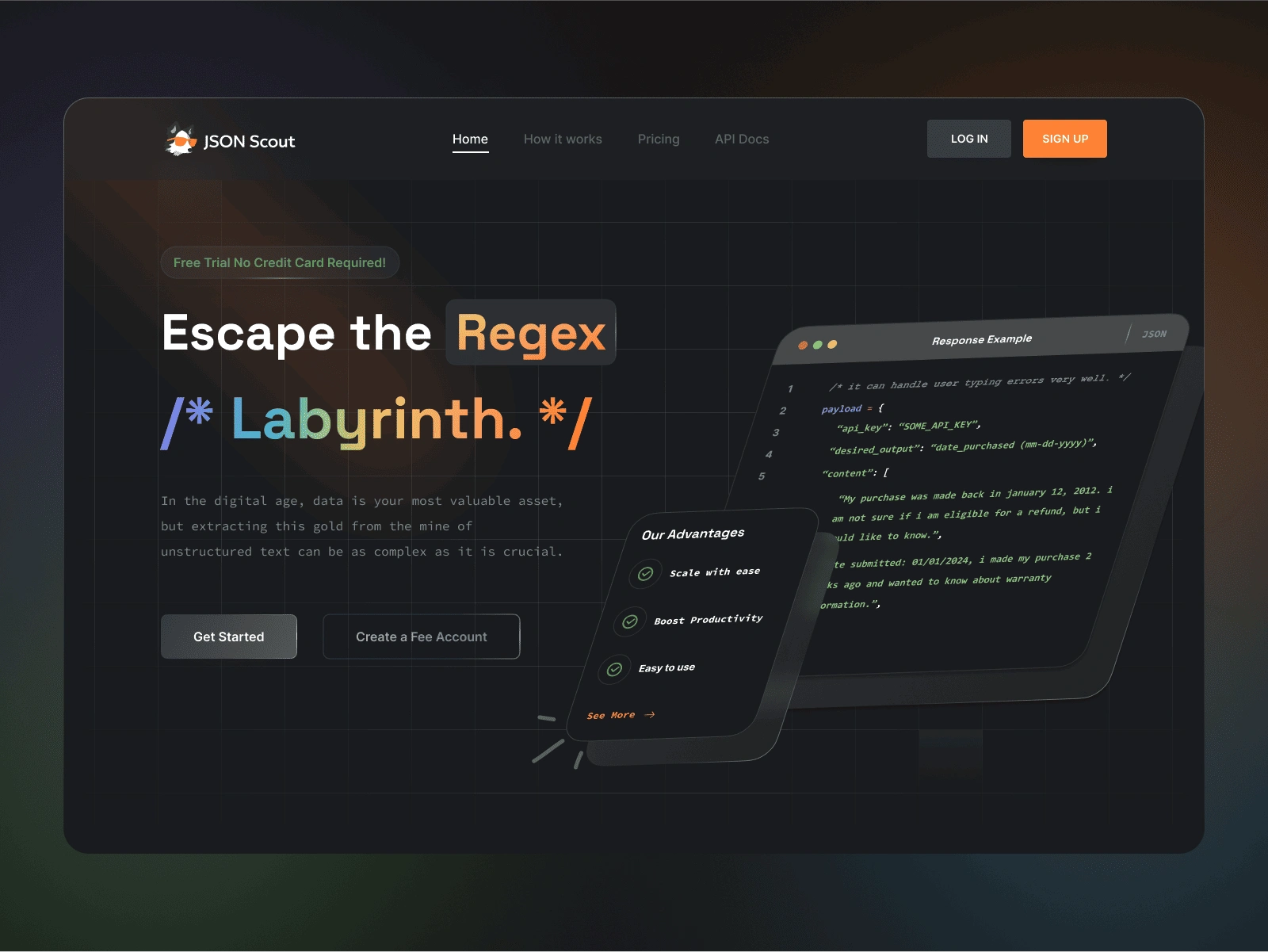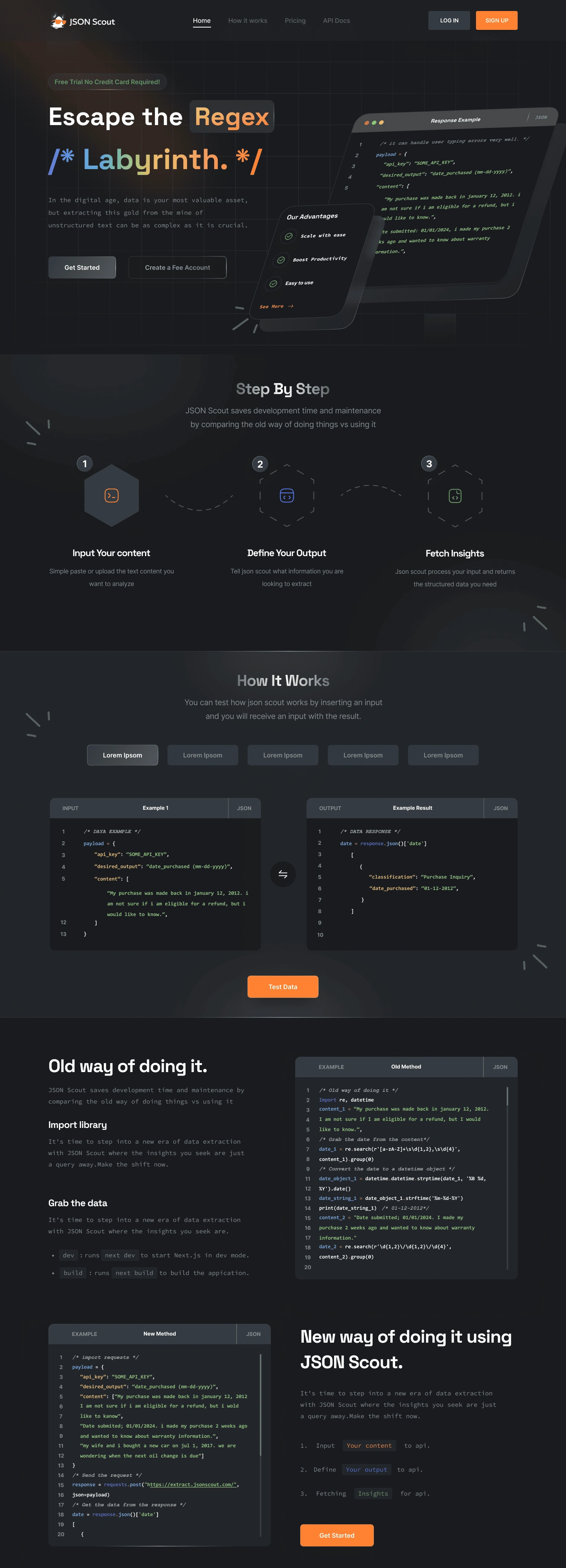 Landing page for JSON Scout, simplifying unstructured data extraction with a modern, developer-focused UI.