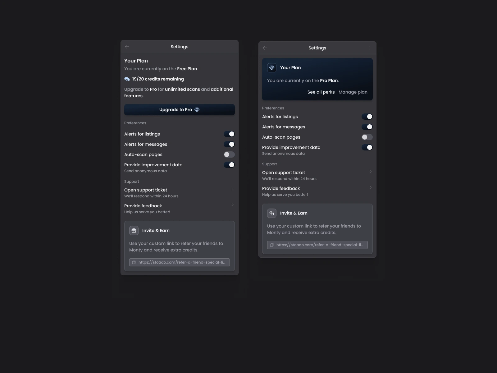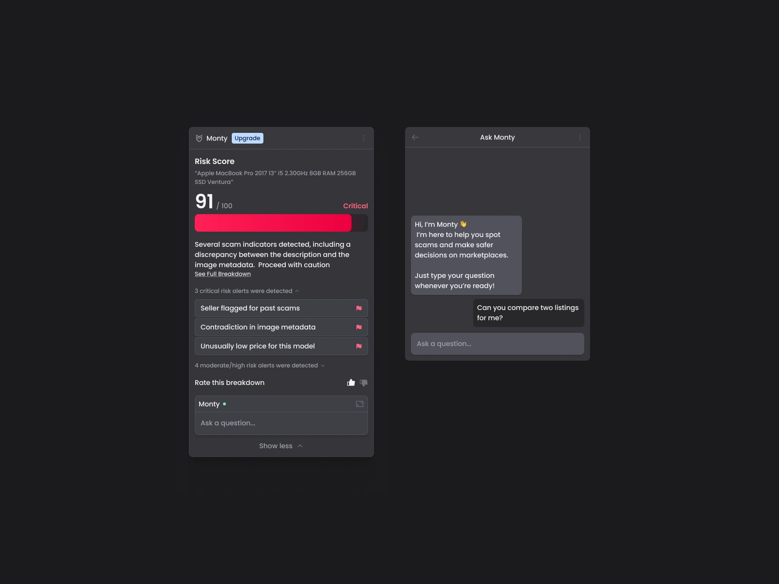 Complete UI/UX design for Monty by Stoado, a web extension that helps users analyze risks involved with buyers, sellers and listings on marketplaces such as eBay, and more.