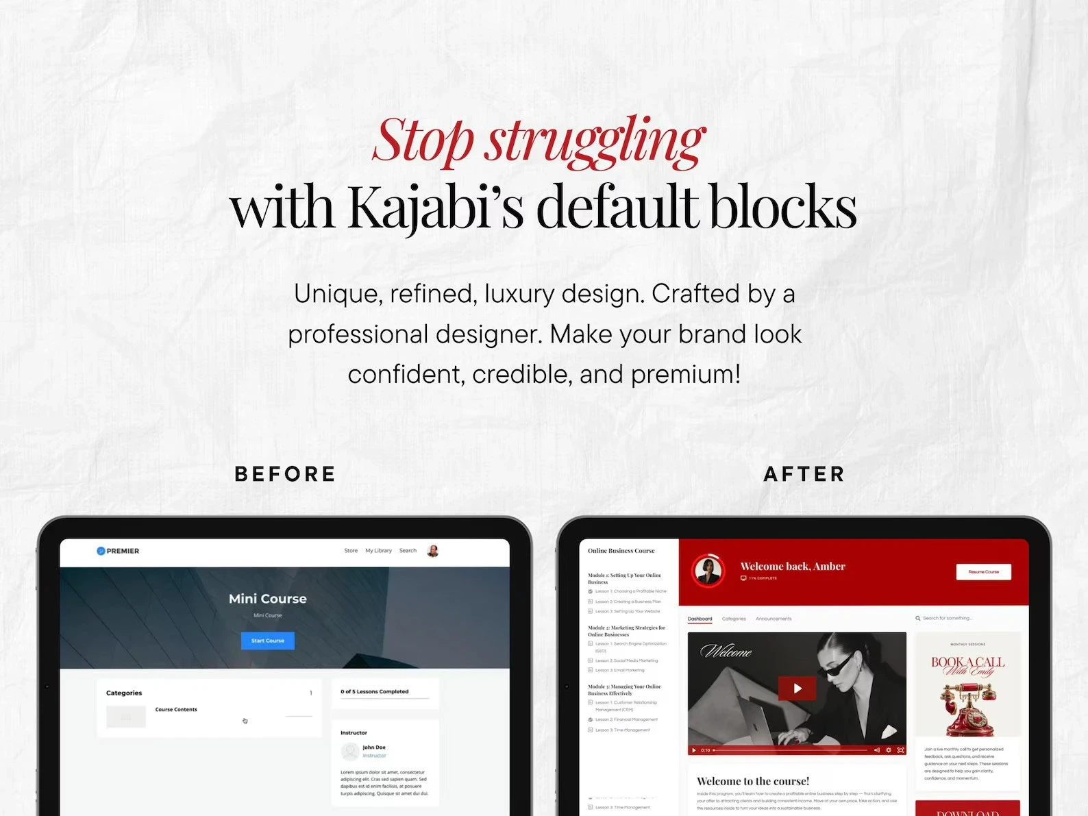 Online courses often rely on Kajabi’s default layouts — functional, but visually generic and lacking brand authority.