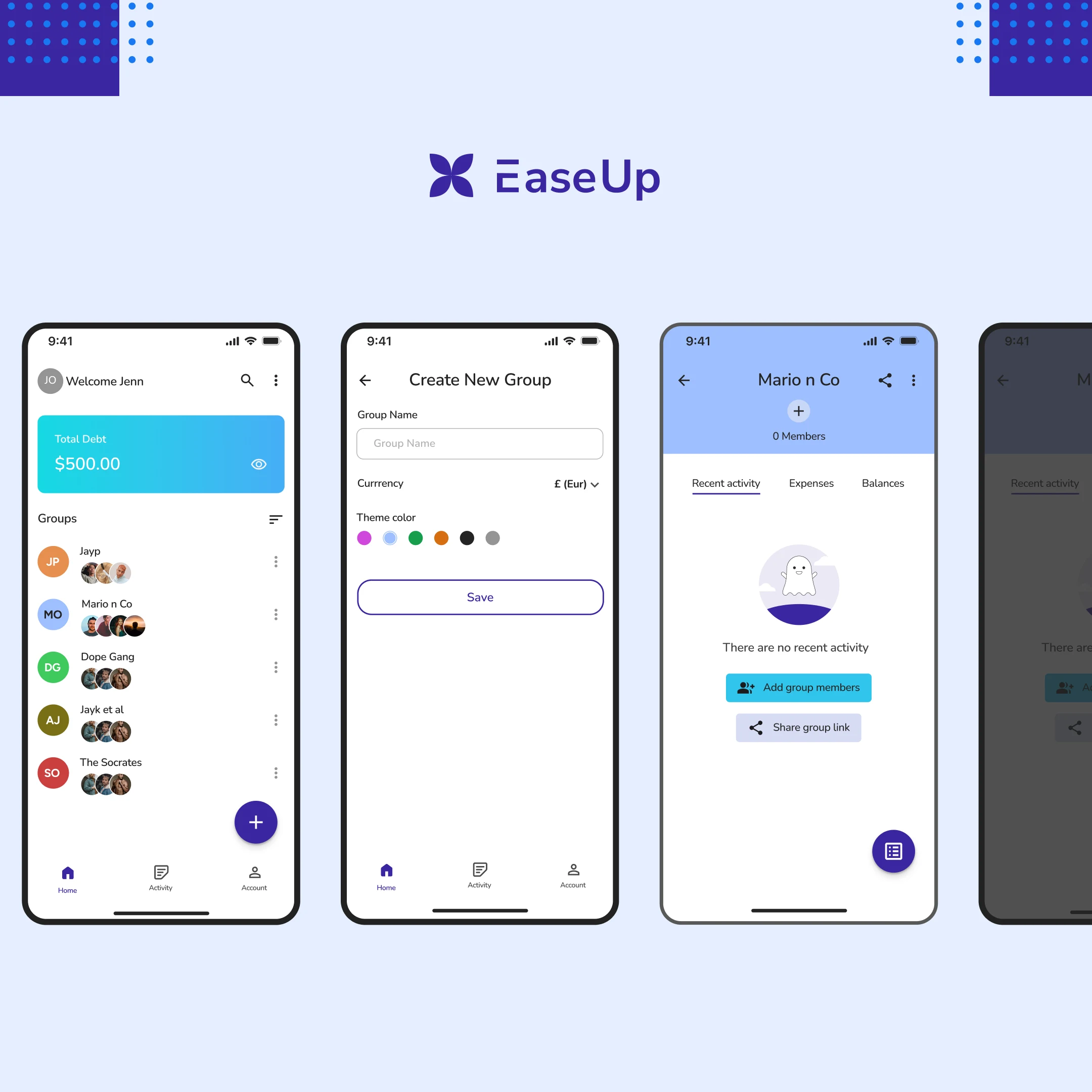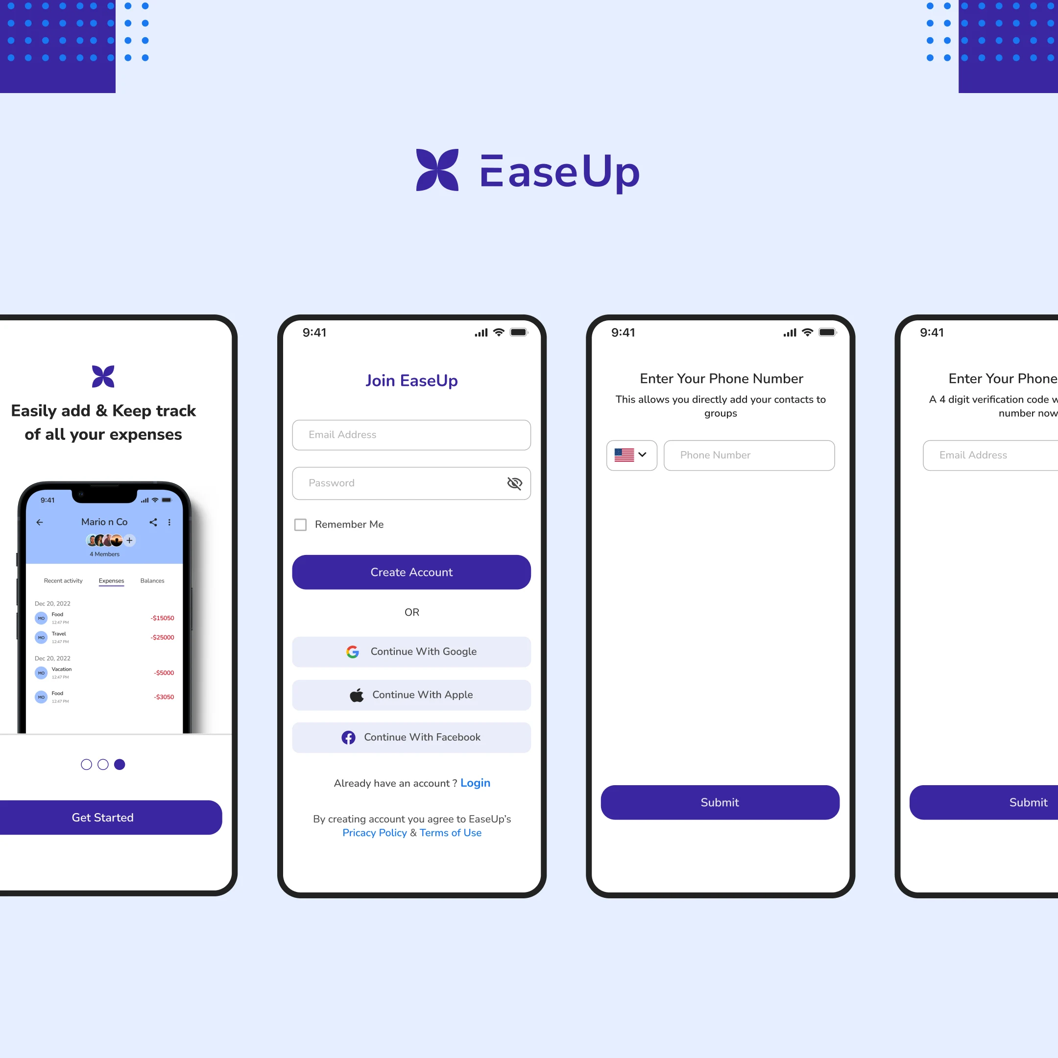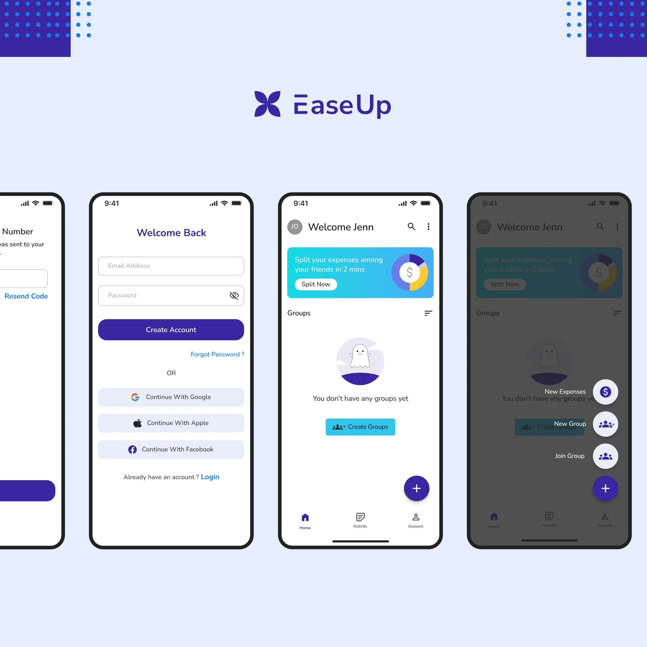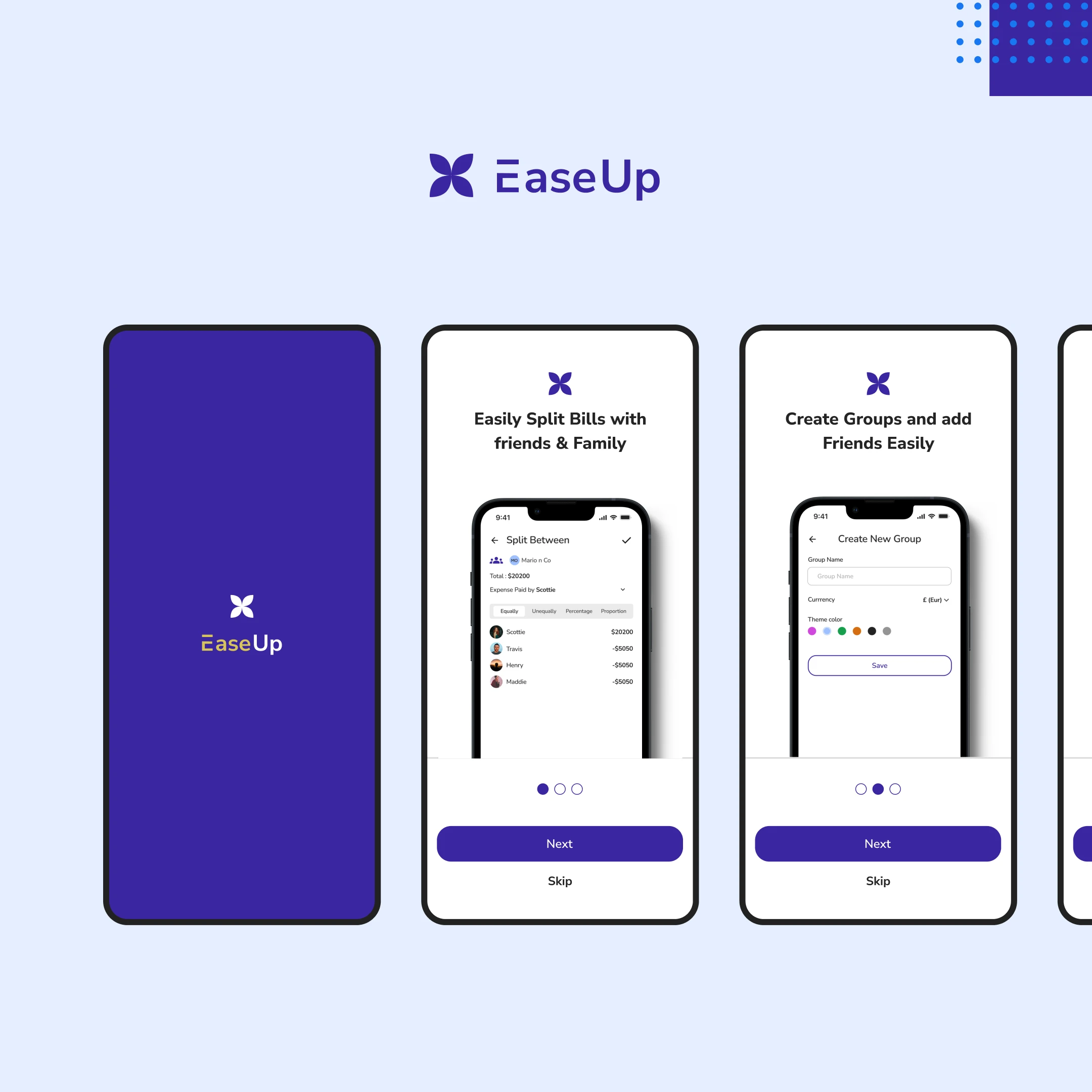 EaseUp is a fintech mobile app that helps people easily track and split the amount spent when they are out with friends and family.