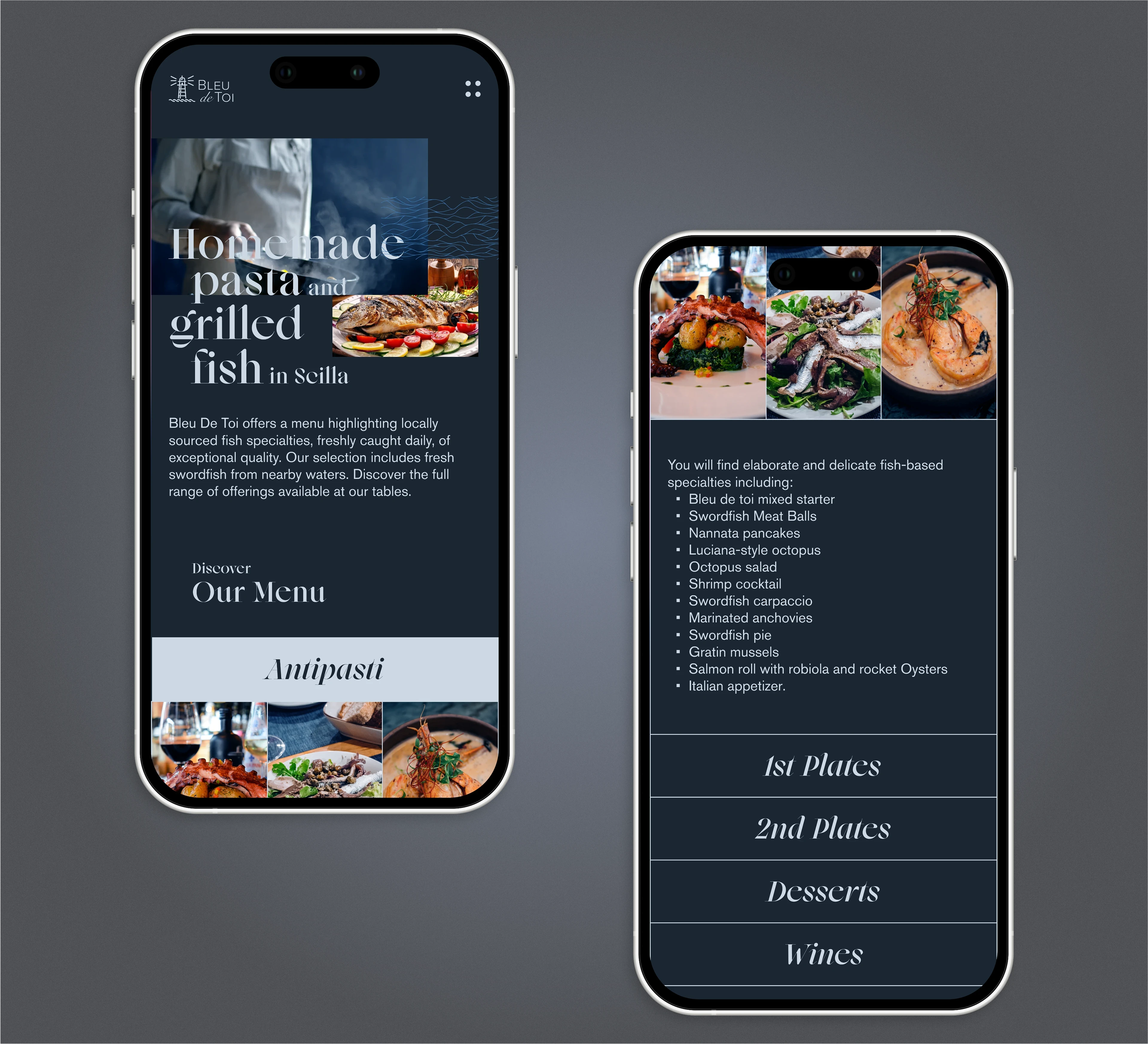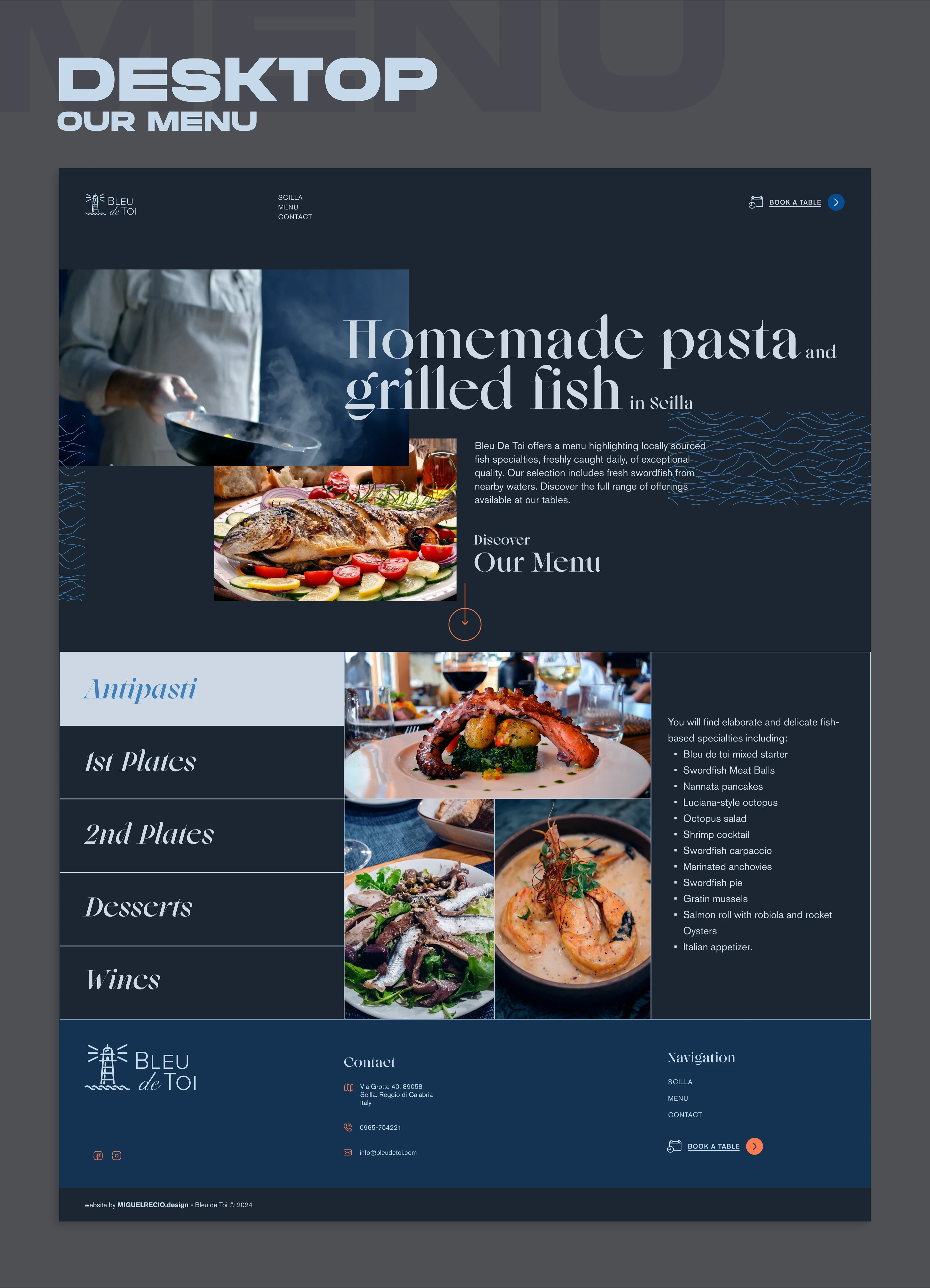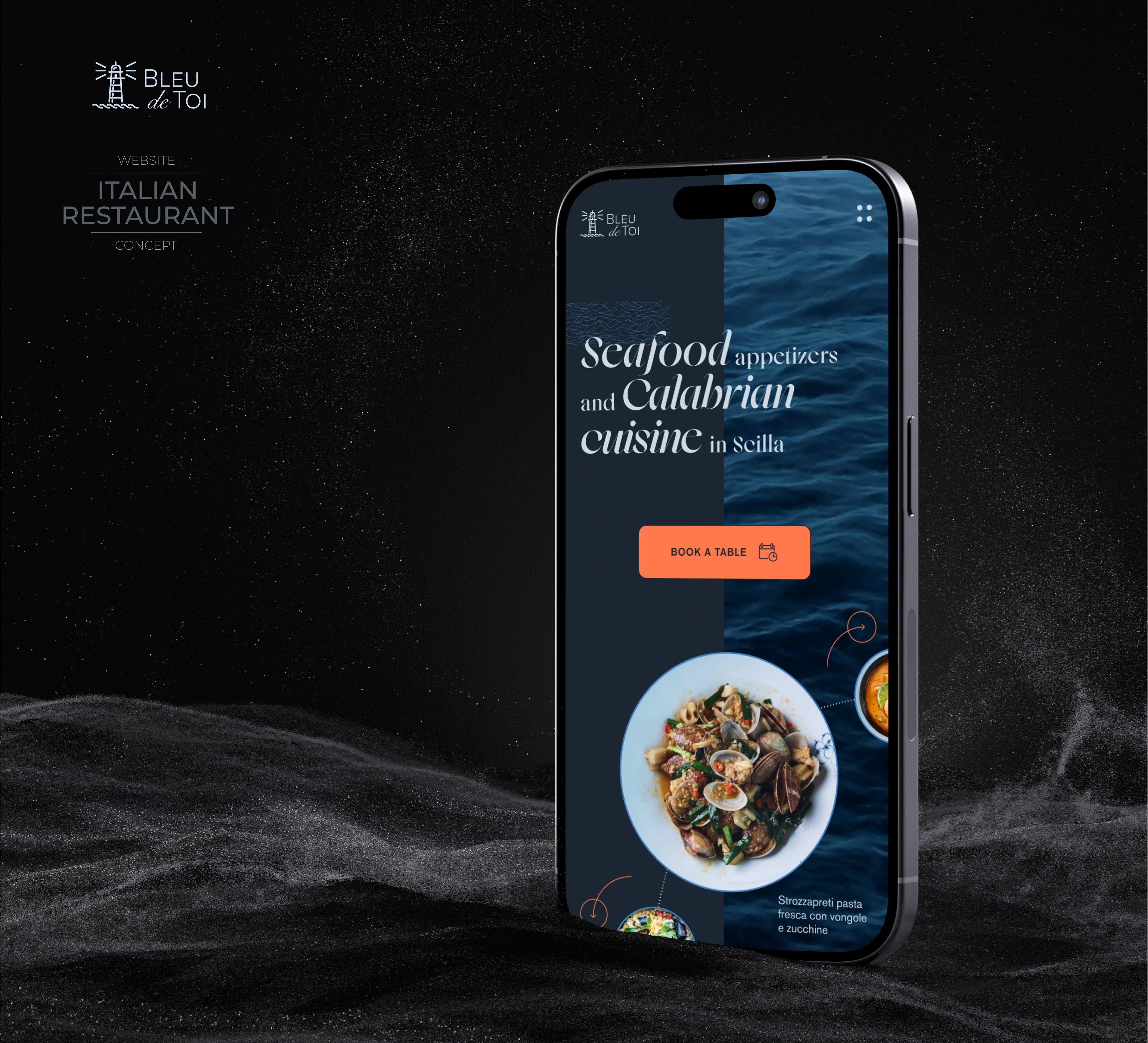 This project presents a concept website for Bleu de Toi, a refined Italian restaurant imagined with warmth, character, and Mediterranean charm. The design blends rustic elegance with modern web aesthetics — using rich visuals, inviting typography, and well-balanced layouts to reflect the cozy ambiance of an authentic trattoria. Through curated imagery, attention to detail, and a beautifully structured presentation of menu, atmosphere, and story, the site aims to immerse visitors in the flavors, aromas, and hospitality of traditional Italian dining — all before they step foot inside.