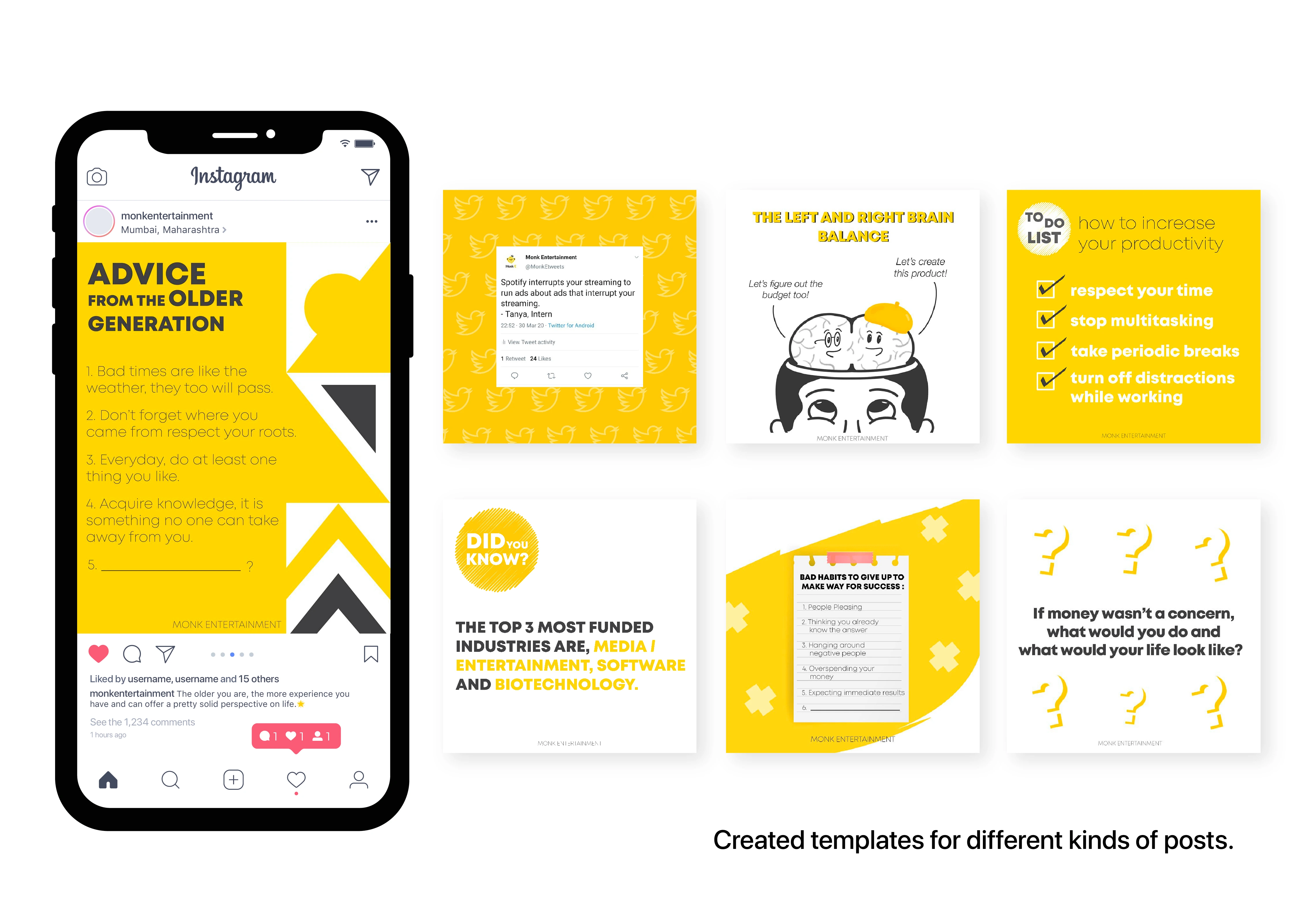 Monk Entertainment is a full service talent management, influencer marketing, and video production company. Fondly known as, Monk-E, the company promotes India's best digital innovators and leverages influencer marketing to help India's fastest-growing startups. So when the company started its own social media page, it decided to educate people, especially the youth, about digital and influencer marketing, business and entrepreneurship. The visual language of the page was based on the brand's logo mark and its personality which is young, fun, exciting, trendy and modern.