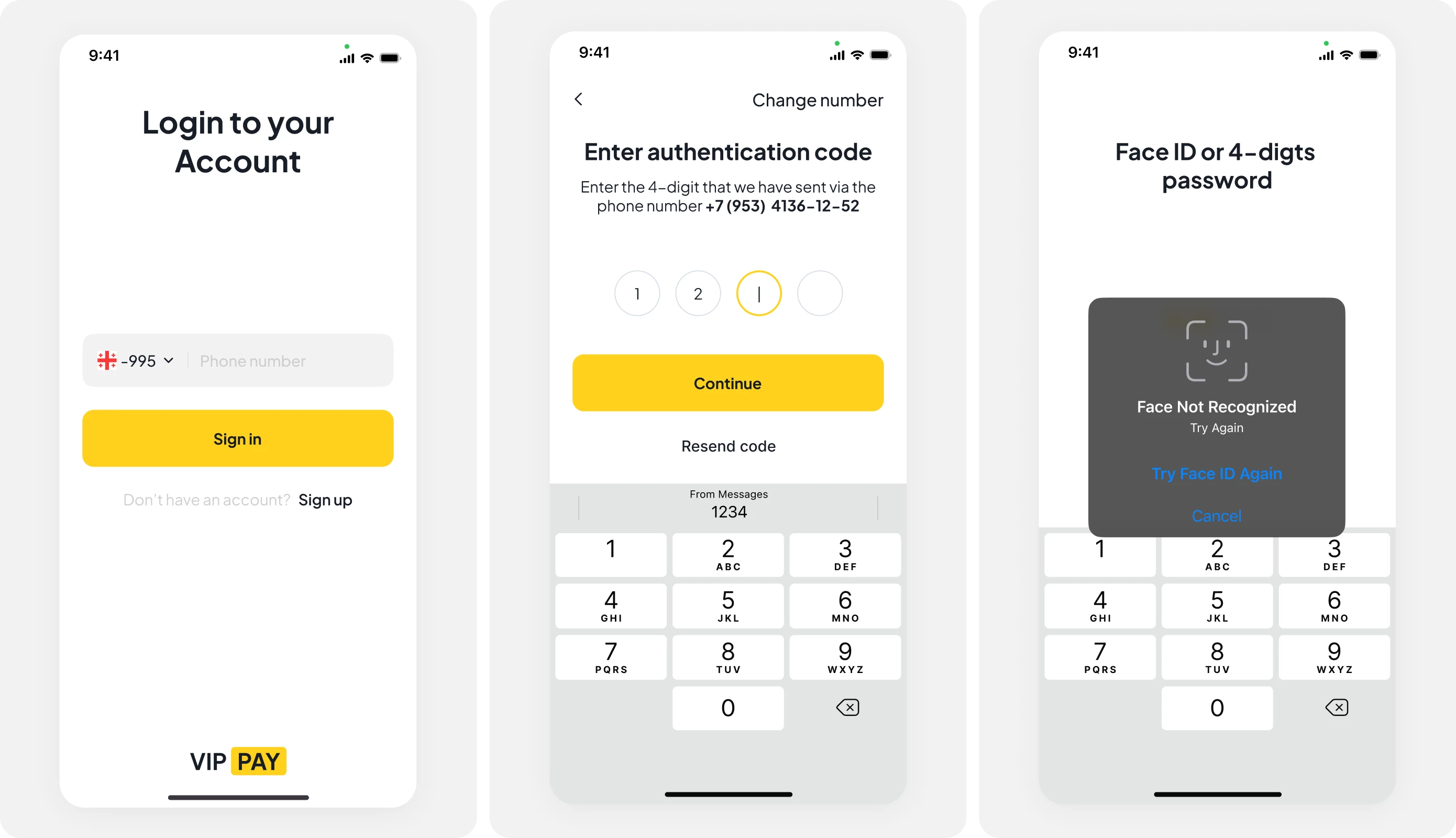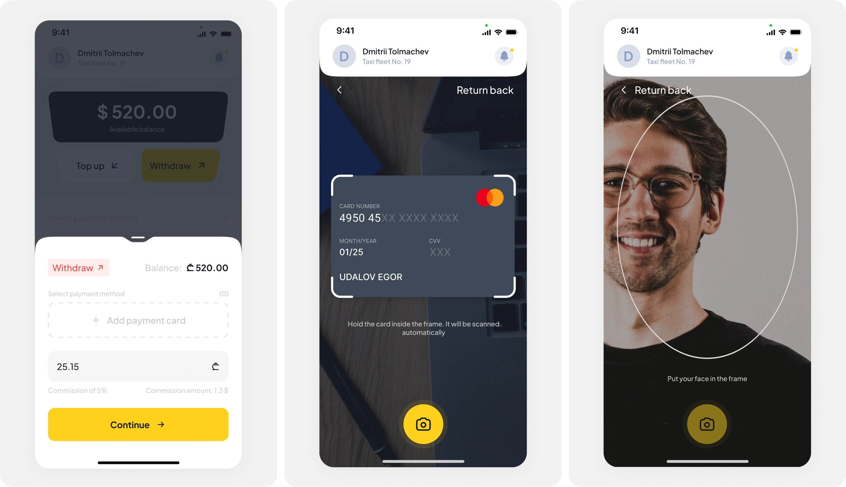 Implemented a simple and secure onboarding flow — from phone number entry to Face ID or PIN setup — ensuring quick account creation and reliable access for taxi service employees